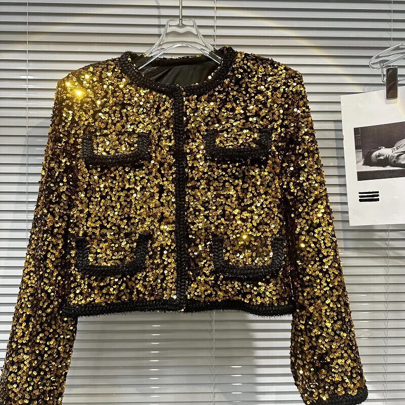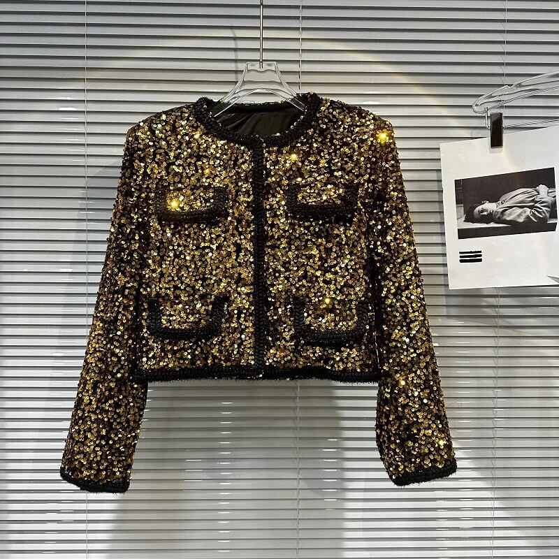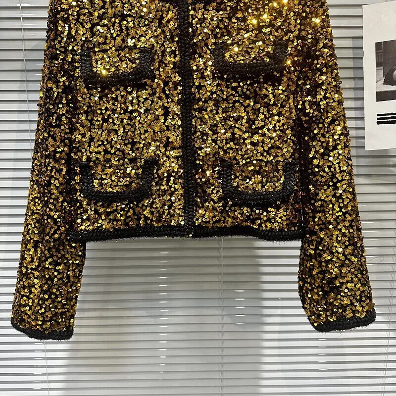 秋ゴールドスパークリング大きスパンコールポケットショートコートジャケットチャケータ Casacos オータム 秋物