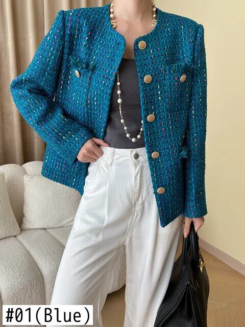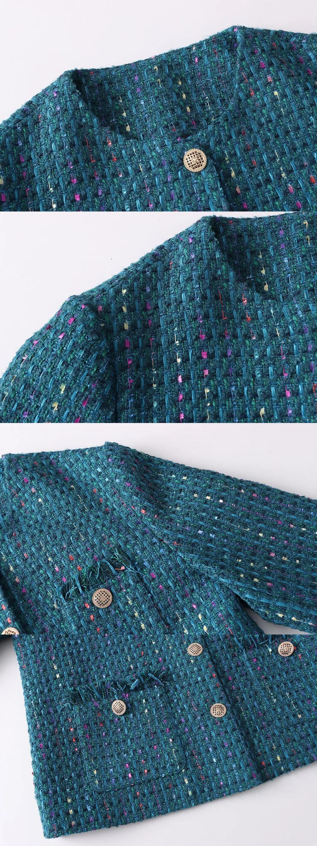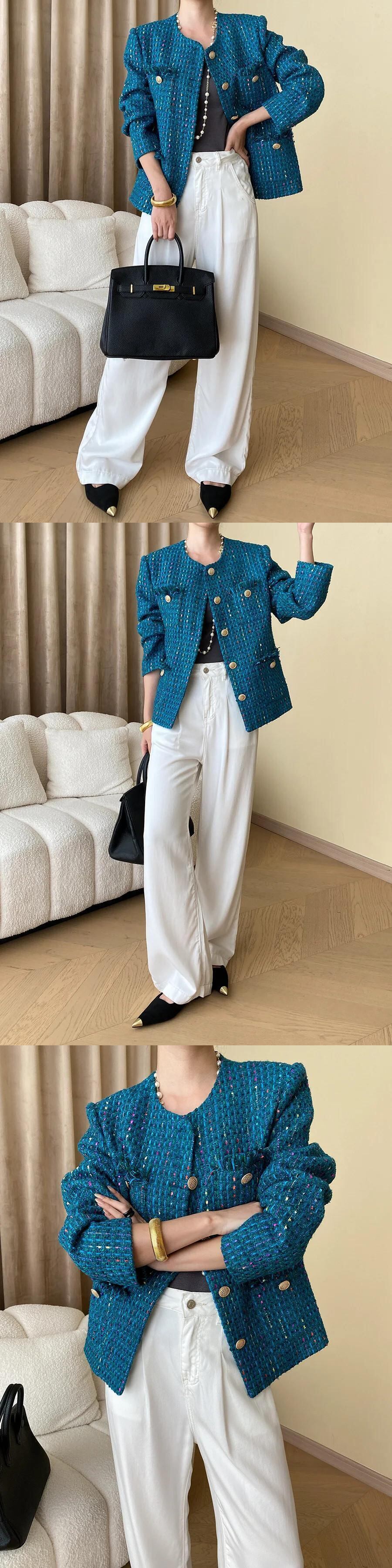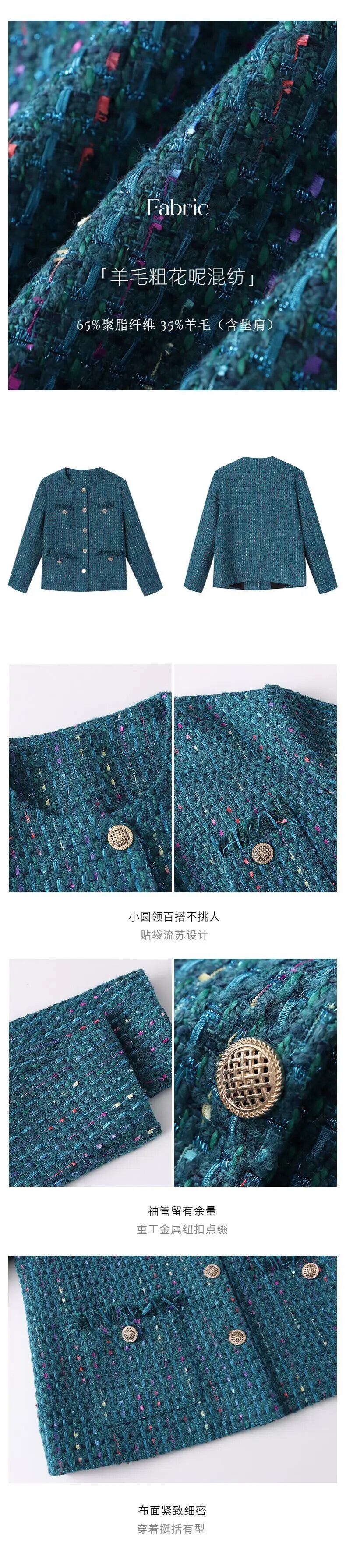 秋冬ピーコックブルー香り良いラウンドネック気質織物ツイードコートシックジャケット オータム 秋物 ウィンター 冬物 Oネック