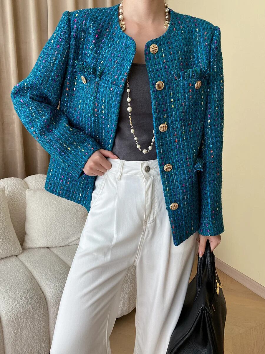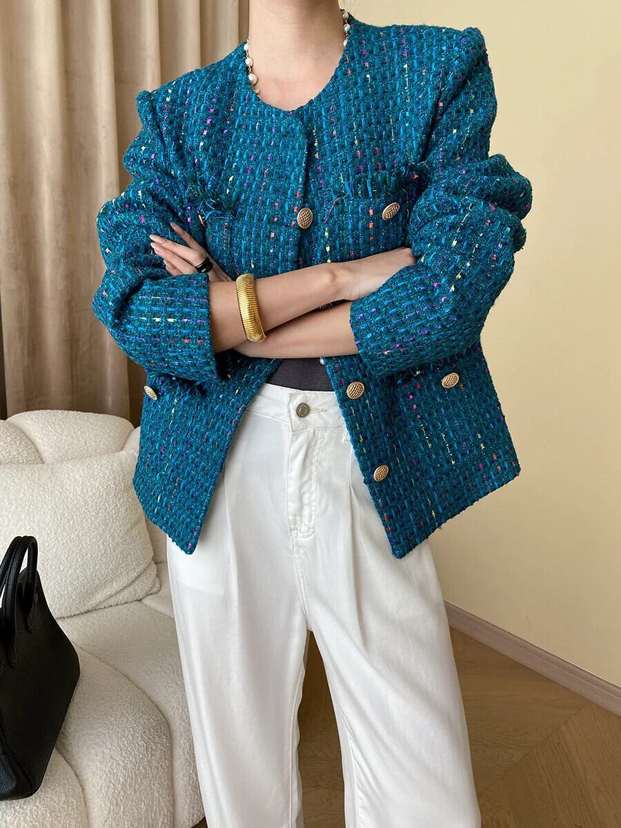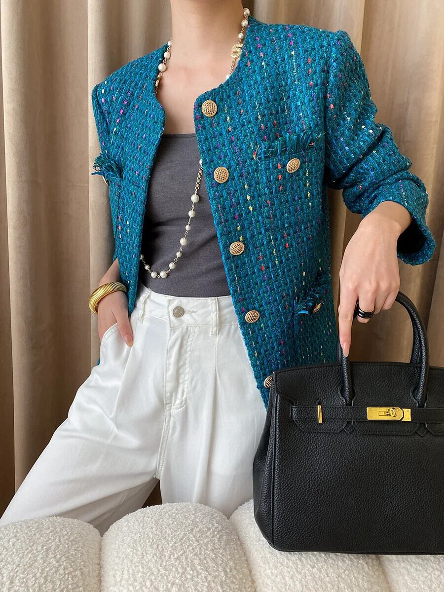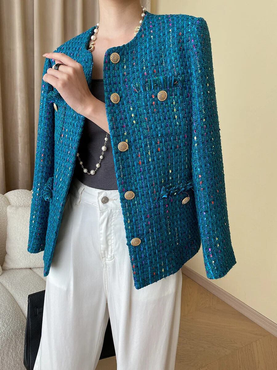 秋冬ピーコックブルー香り良いラウンドネック気質織物ツイードコートシックジャケット オータム 秋物 ウィンター 冬物 Oネック