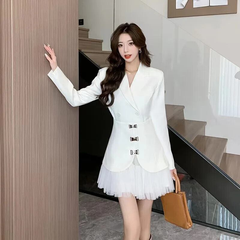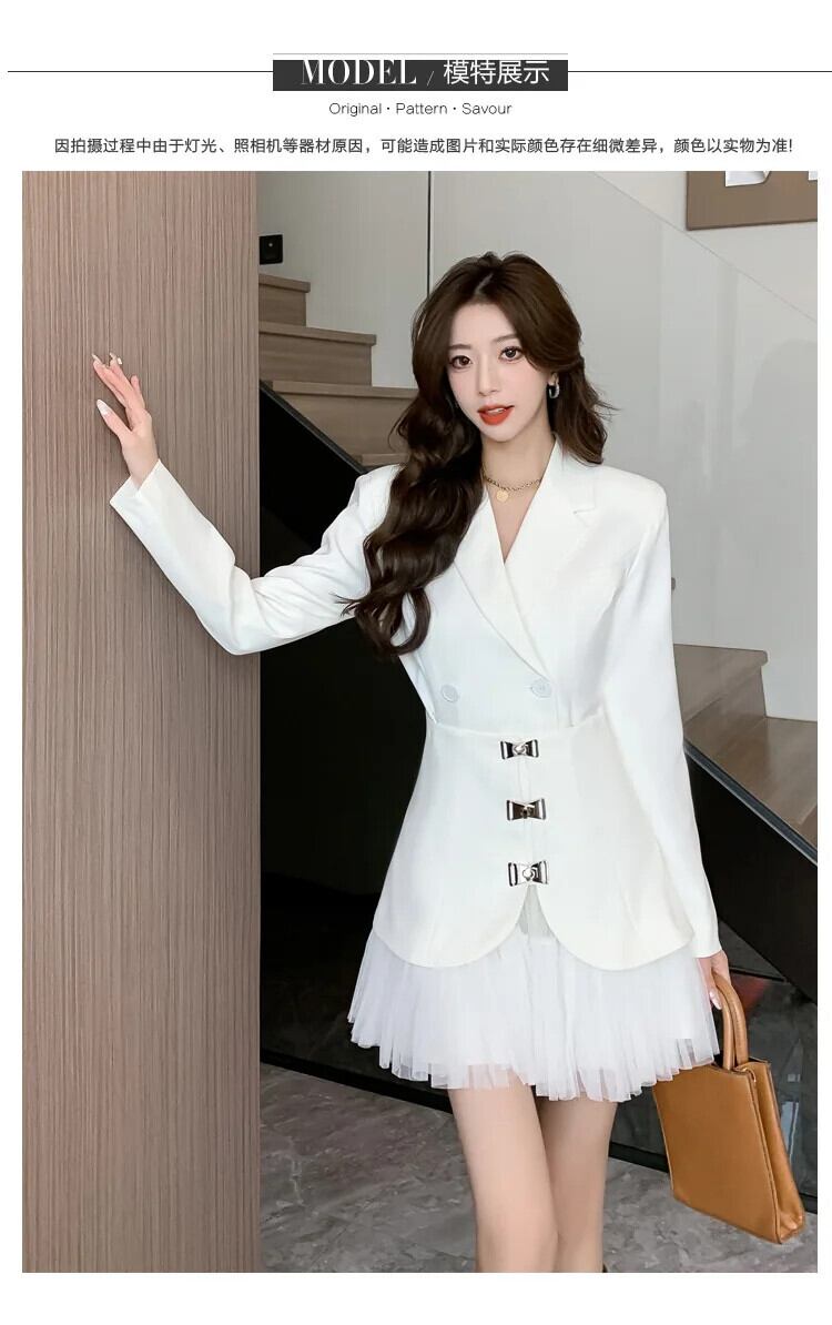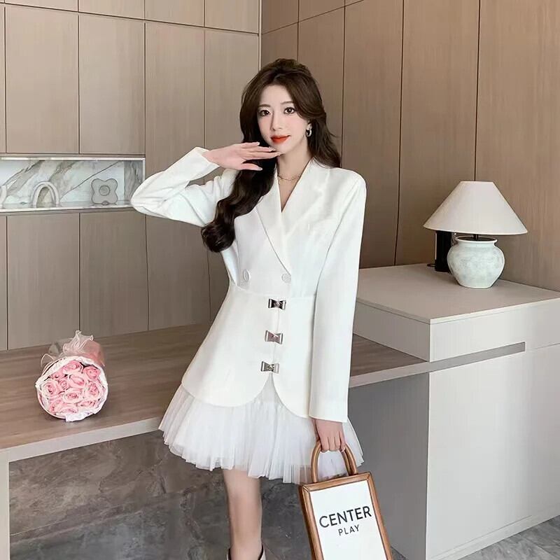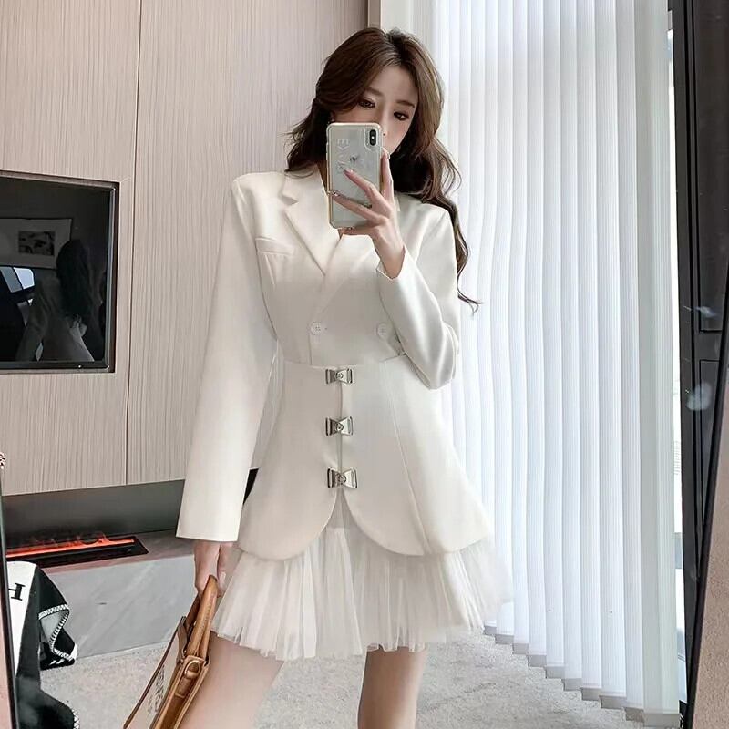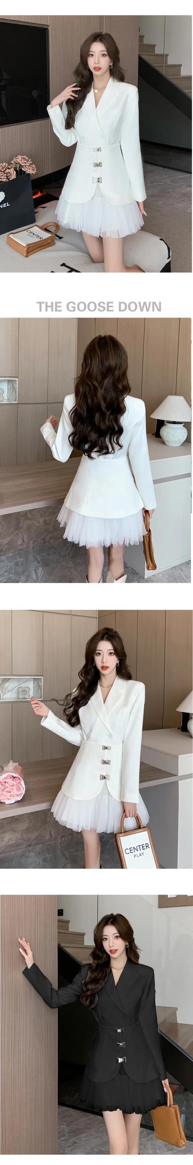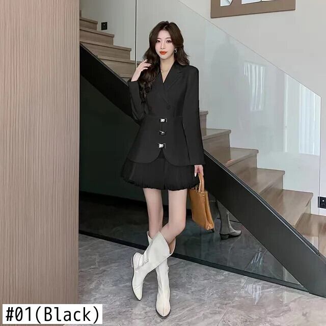秋レディーススーツスプライスメッシュドレスボタンウエストツーピースセット オータム 秋物