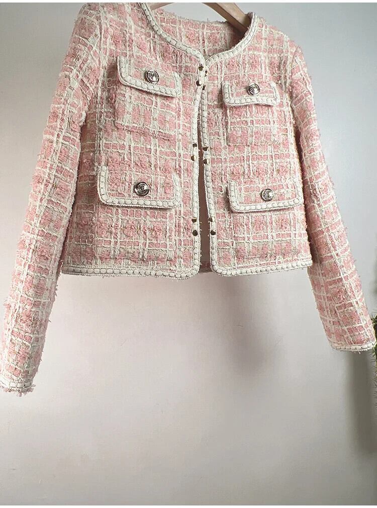 滑走路秋春ブルーピンクウールツイードジャケット高級ポケットコート Casacos ブラウス スプリング 春物