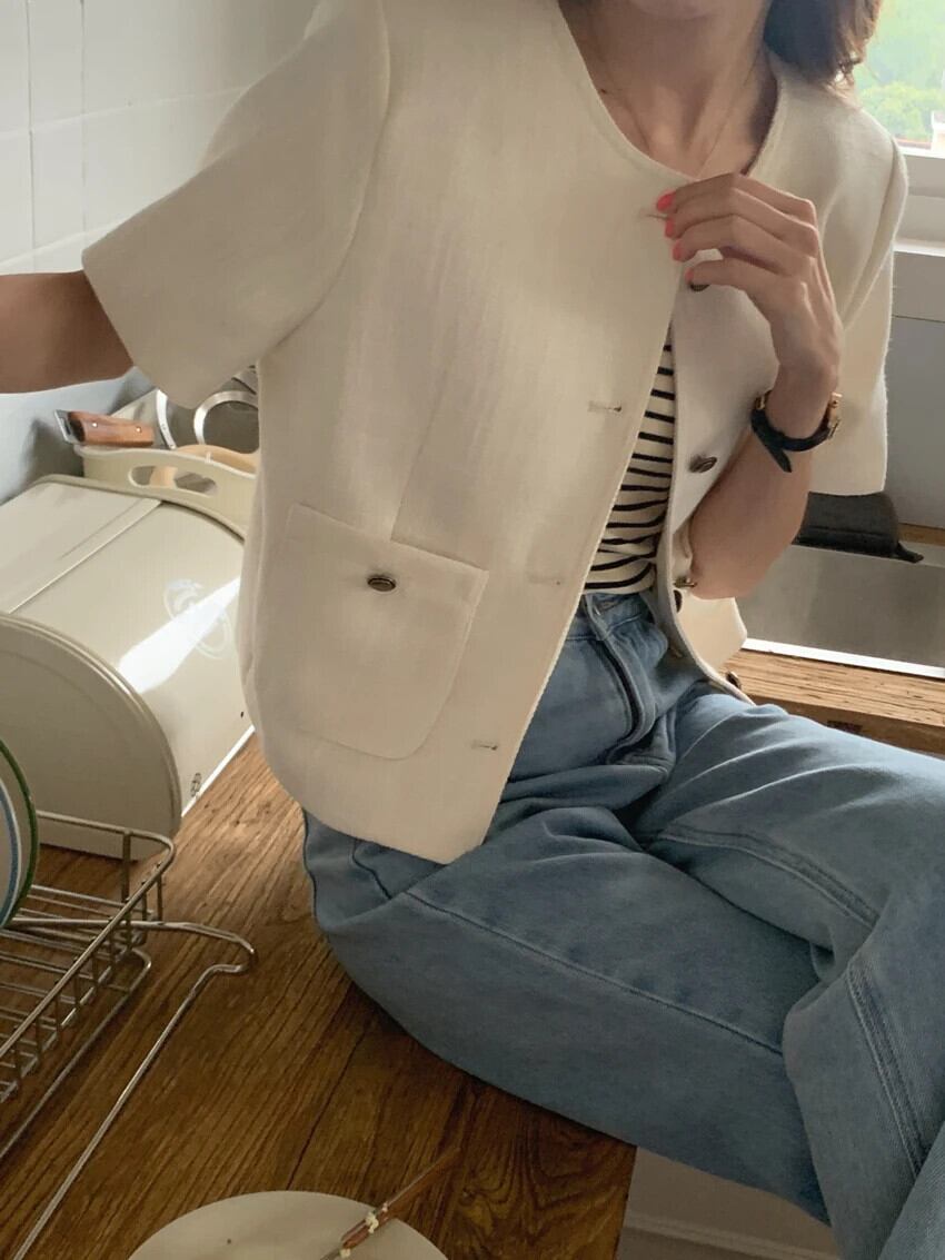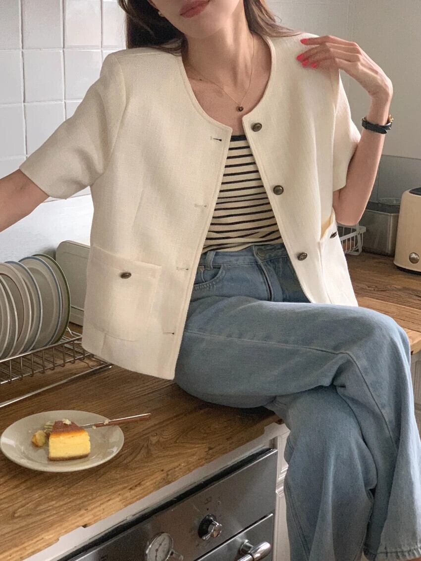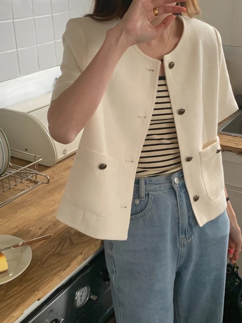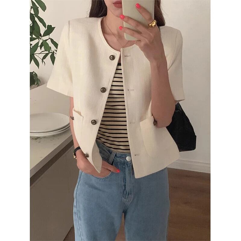 夏スタイルラウンドネックシングルブレストルーズ多用途ダブルポケットショート香りコートジャケット サマー 夏物 Oネック