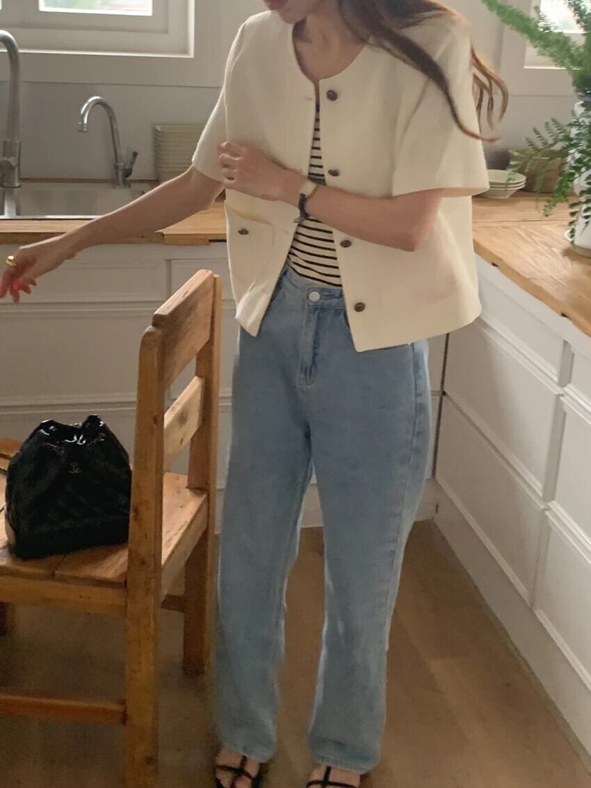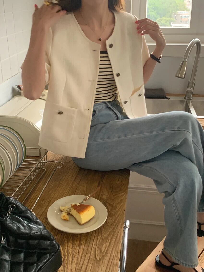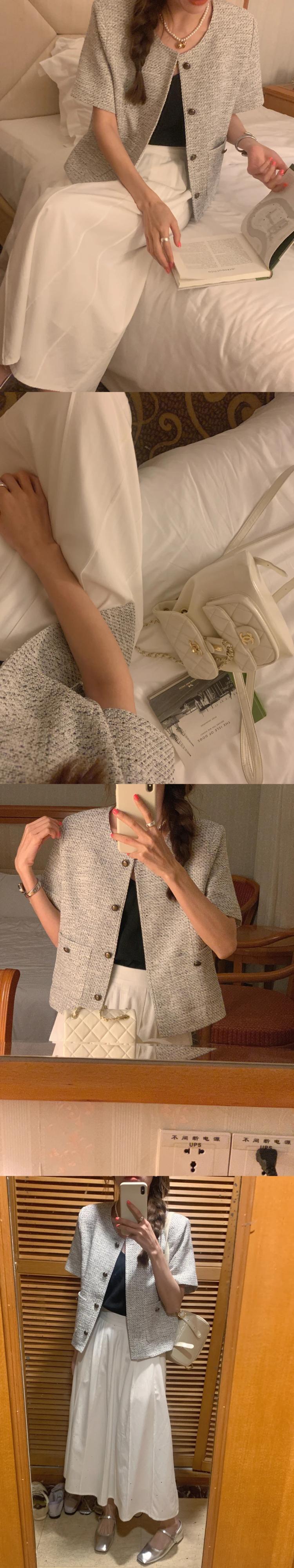 夏スタイルラウンドネックシングルブレストルーズ多用途ダブルポケットショート香りコートジャケット サマー 夏物 Oネック