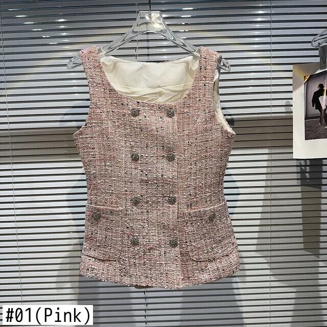 秋ダブルブレストスクエアネックピンクツイードスタイルベストコートガールチョッキ オータム 秋物 スクウェア