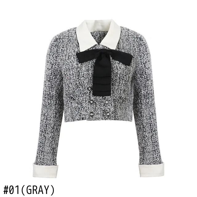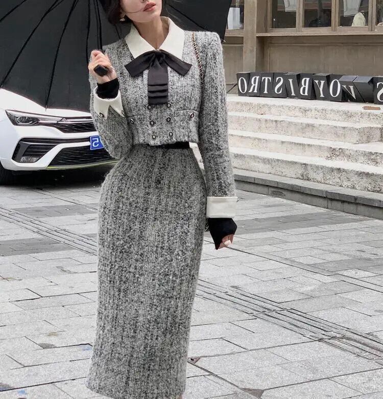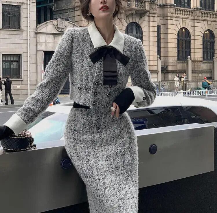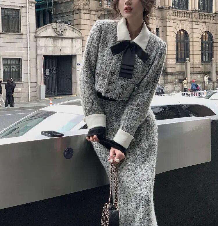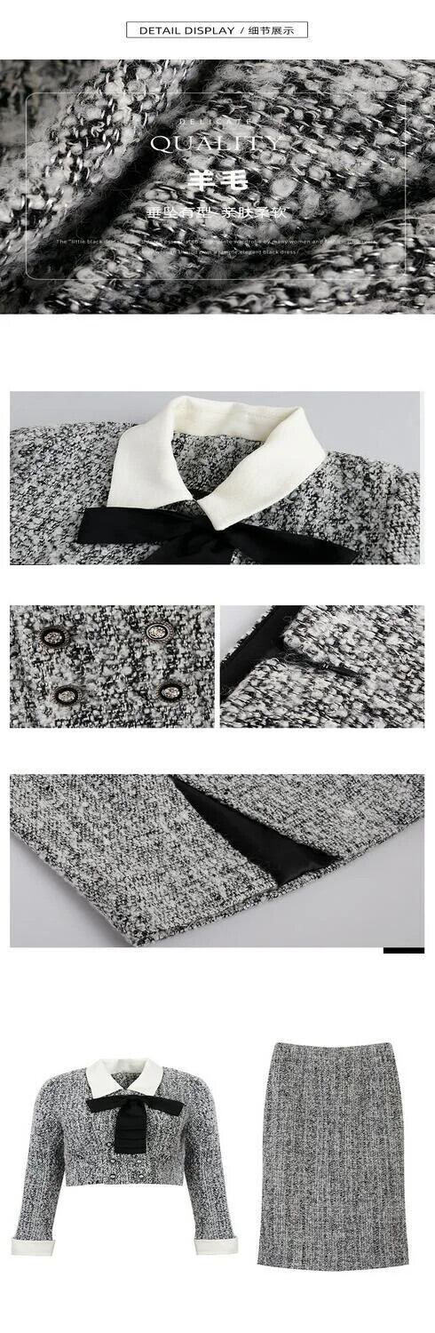 ショートボウラペルコート+スリムスカート2点セットフランス気質スーツ リボン