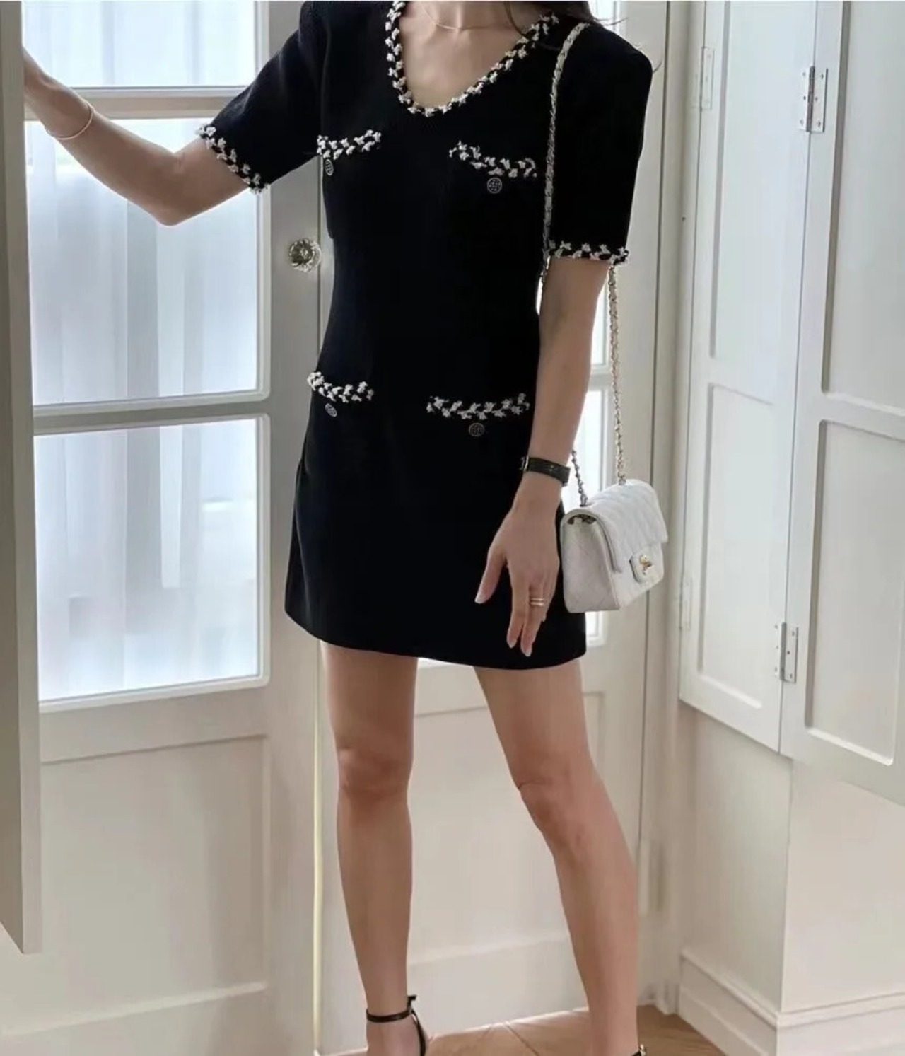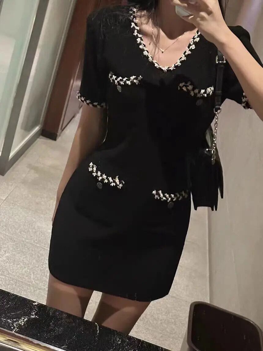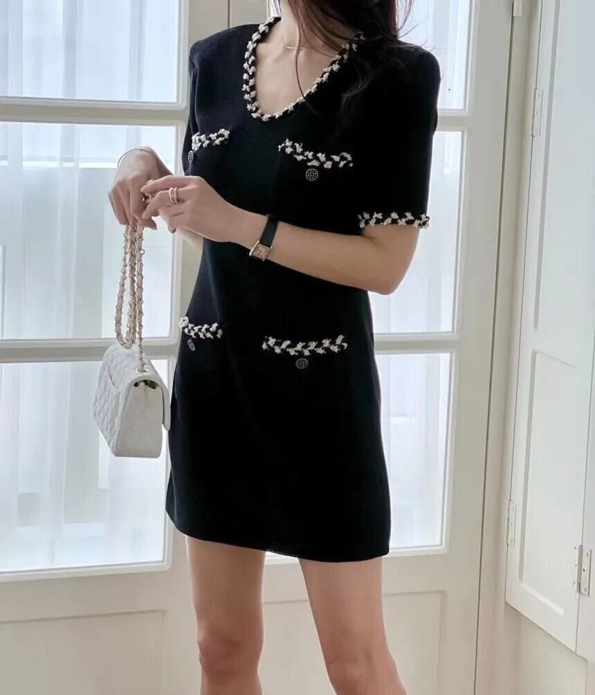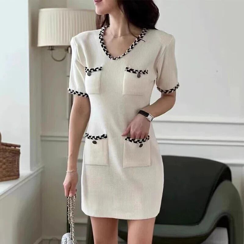 夏スタイル香りよい V ネック半袖ニットドレス白黒 ショート ホワイト ブラック ハーフスリーブ サマー 夏物 Vネック