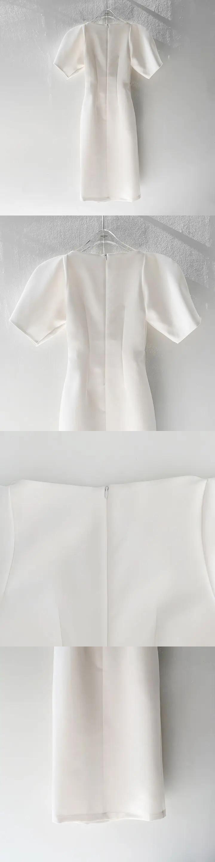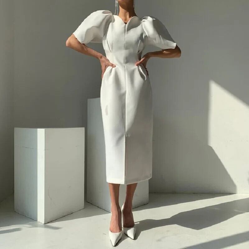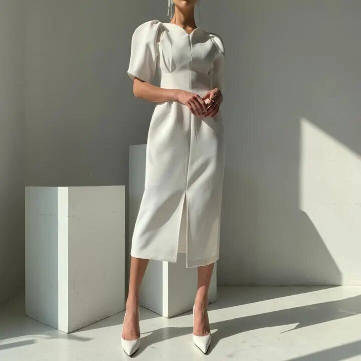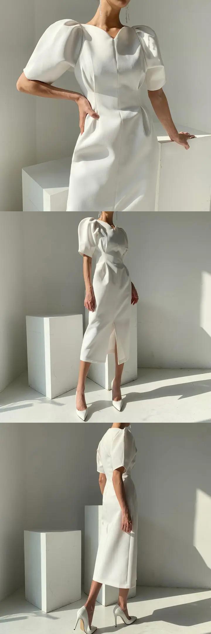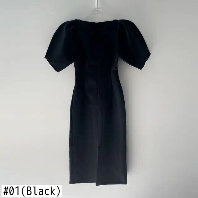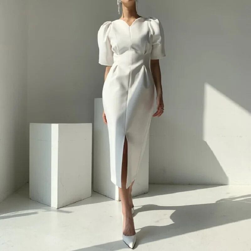 シック夏フランス宮殿スタイル V ネック折りウエストソリッドカラーバブルスリーブスプリットドレス レース サマー 夏物 Vネック