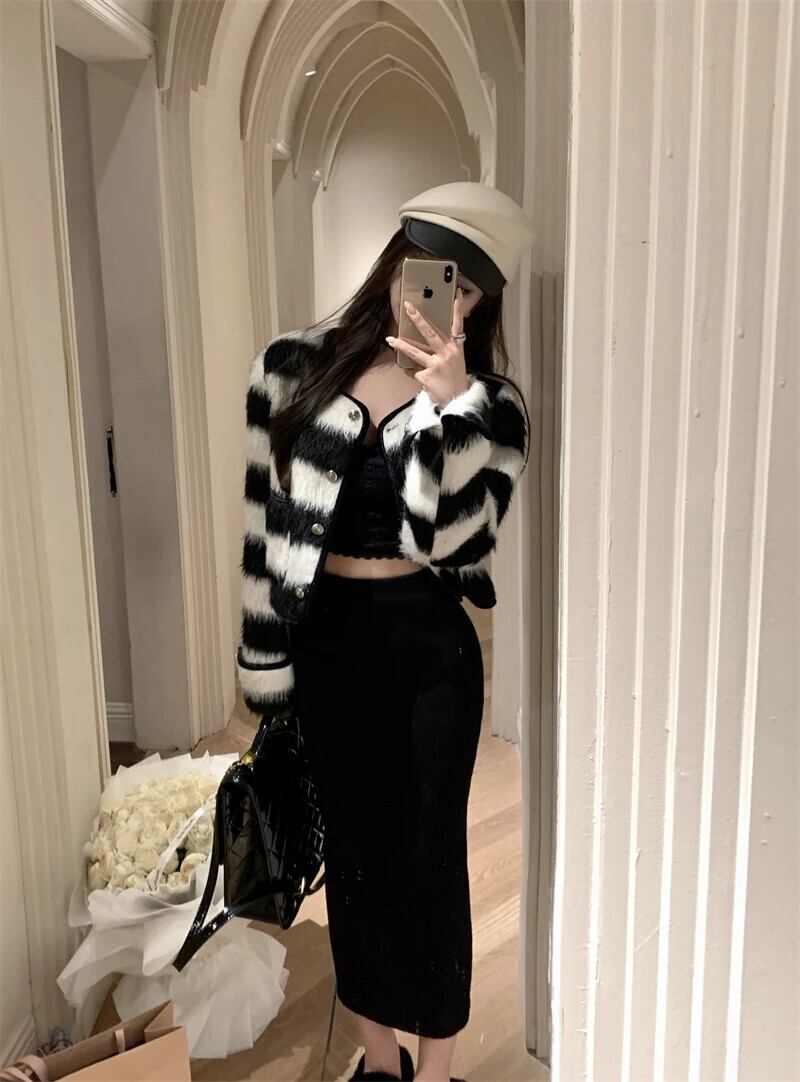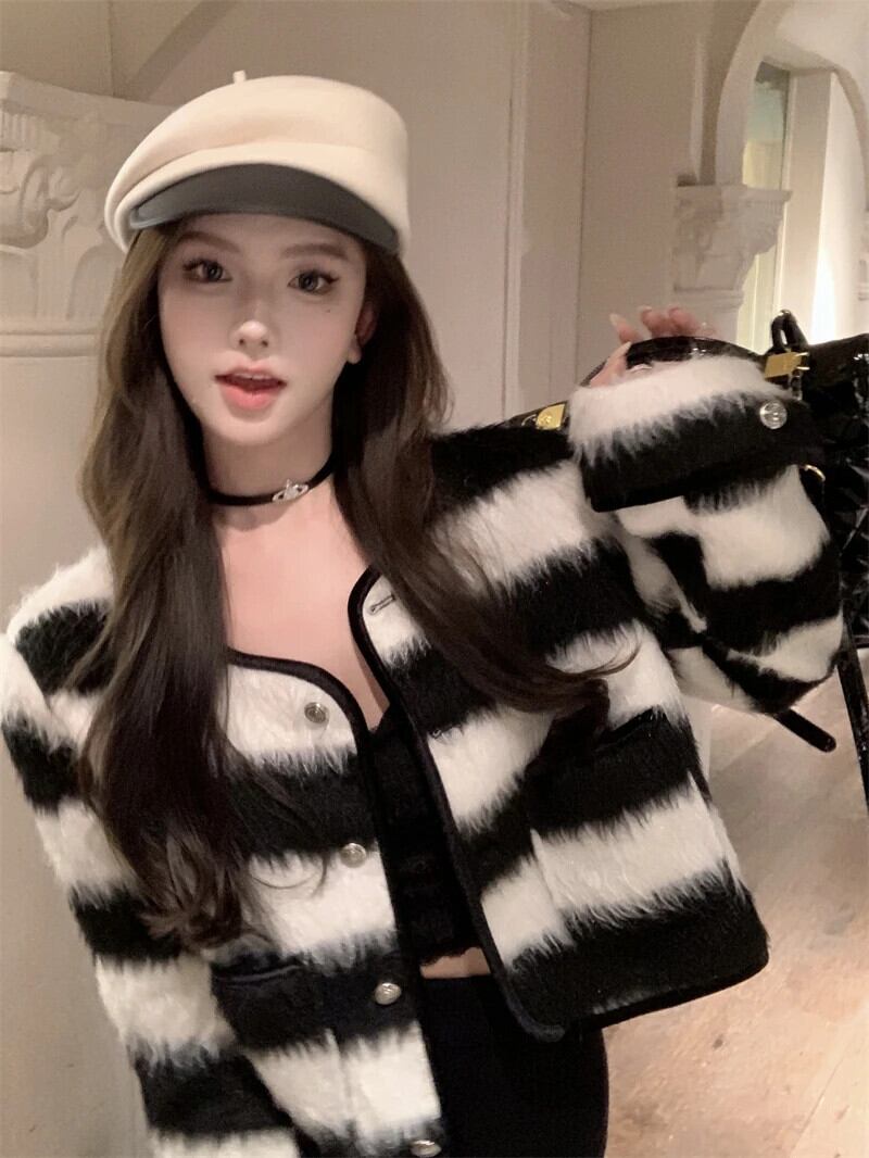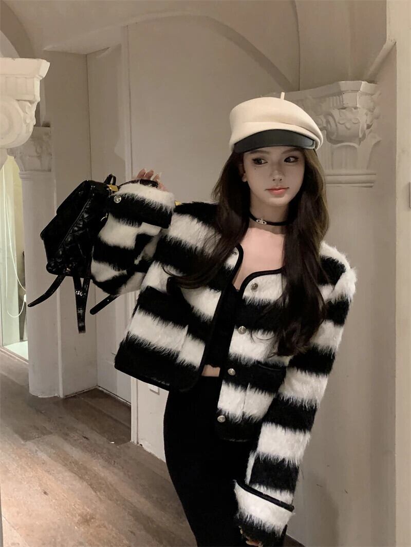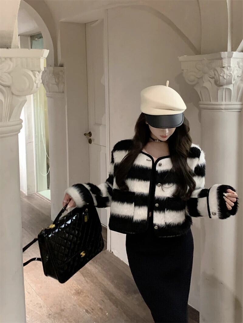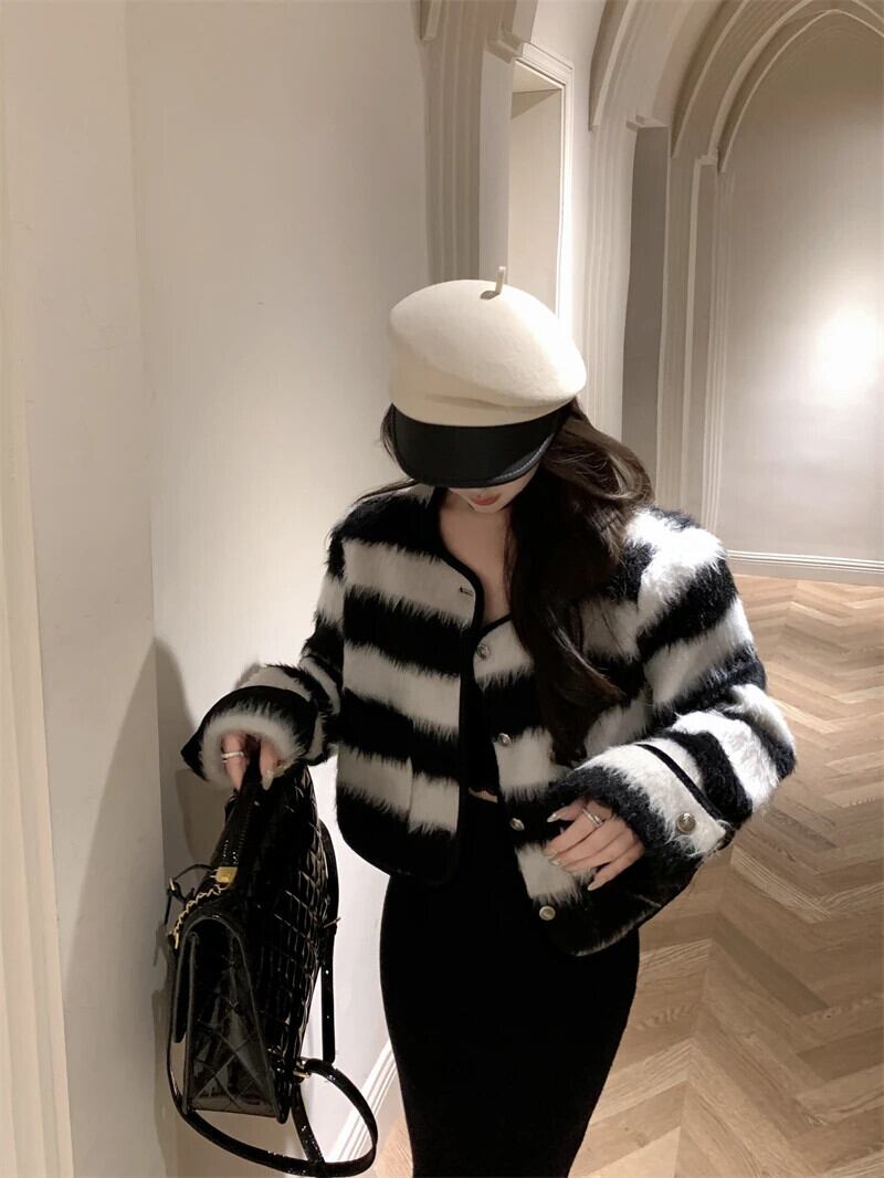 秋香りラウンドネックシングルブレストコートカラーストライプウールジャケット レッド オータム 秋物 Oネック