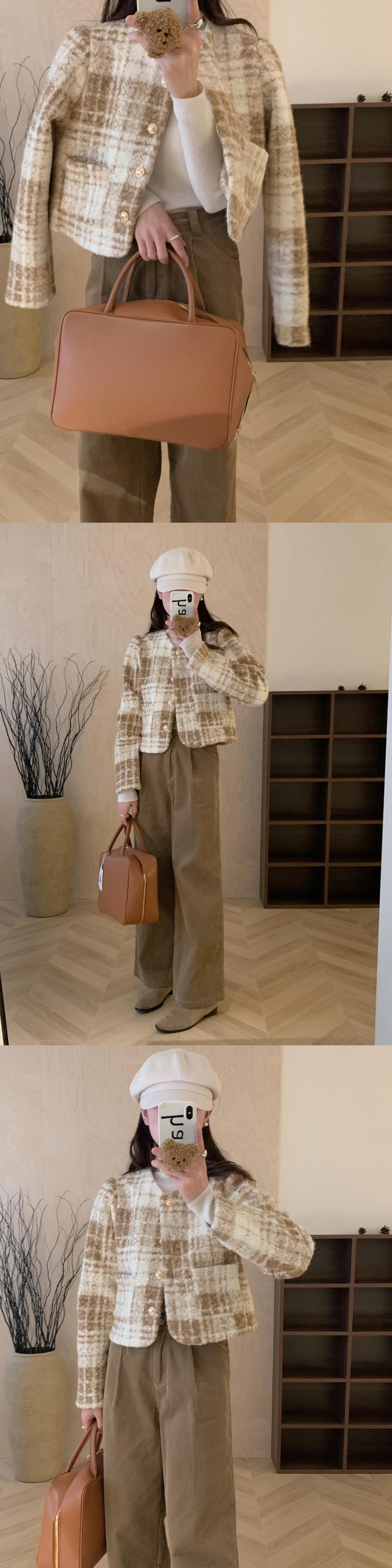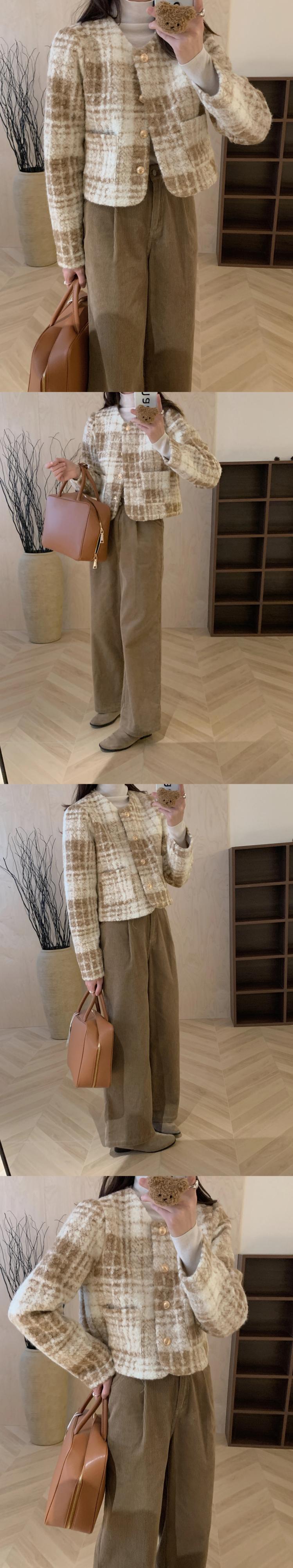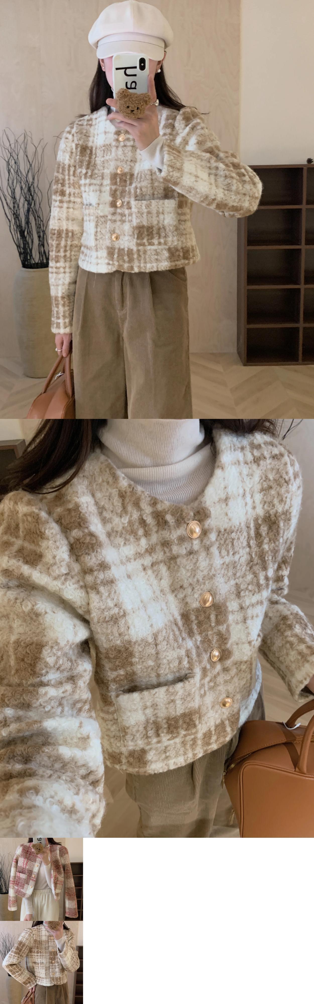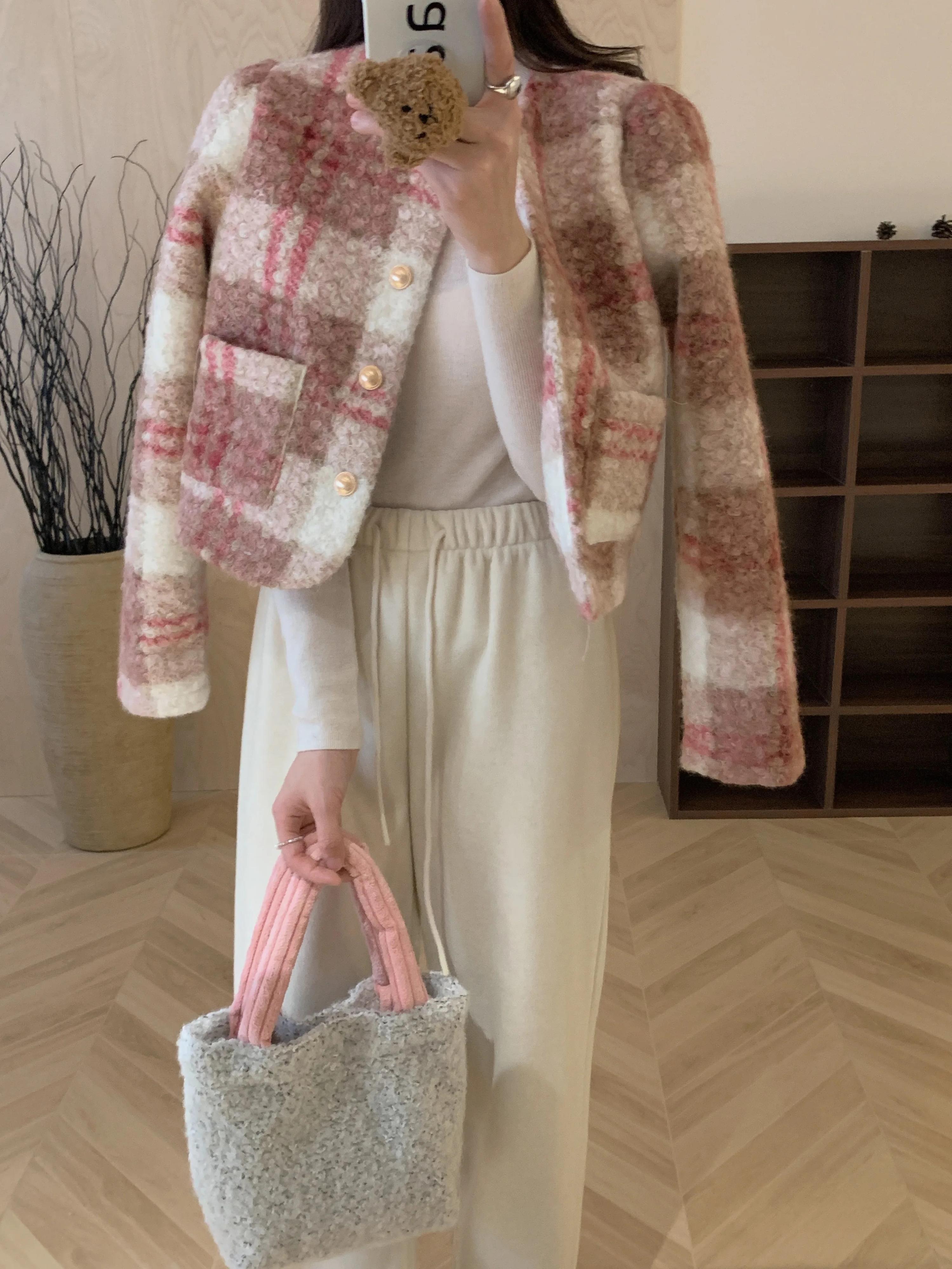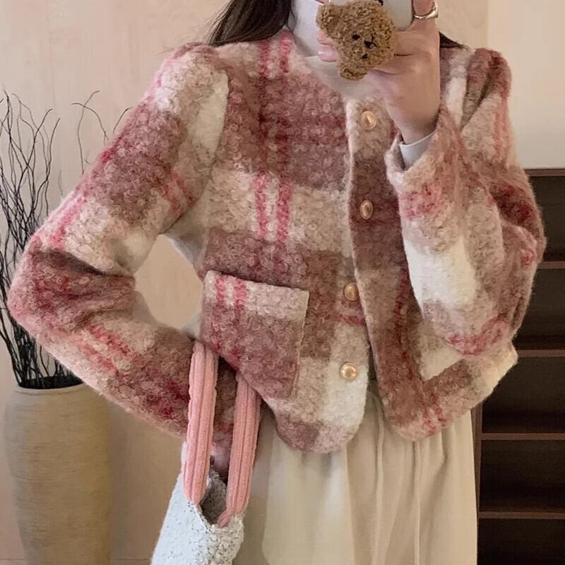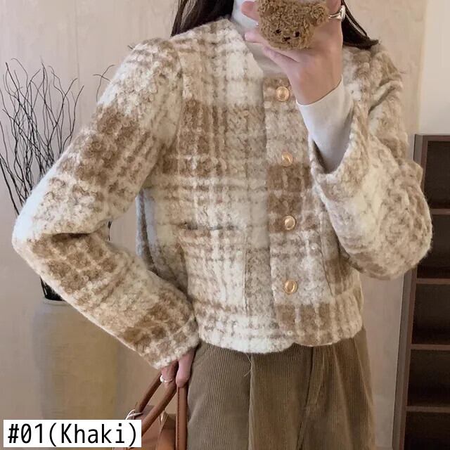 冬香りよいラウンドネックコントラストチェック柄金属ボタン多用途長袖ウールコートジャケット ロング ウィンター 冬物 Oネック