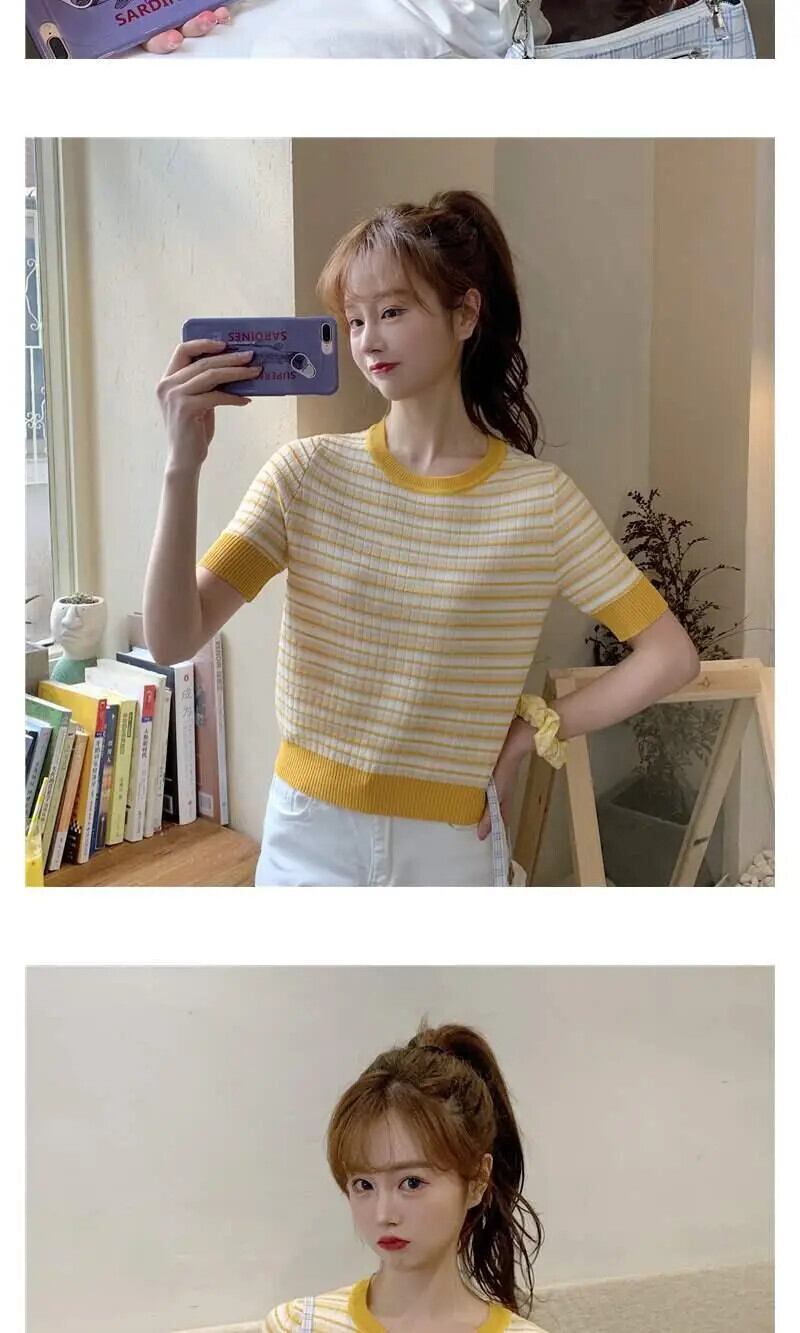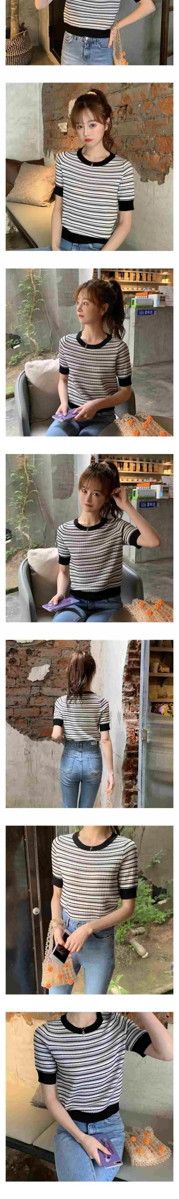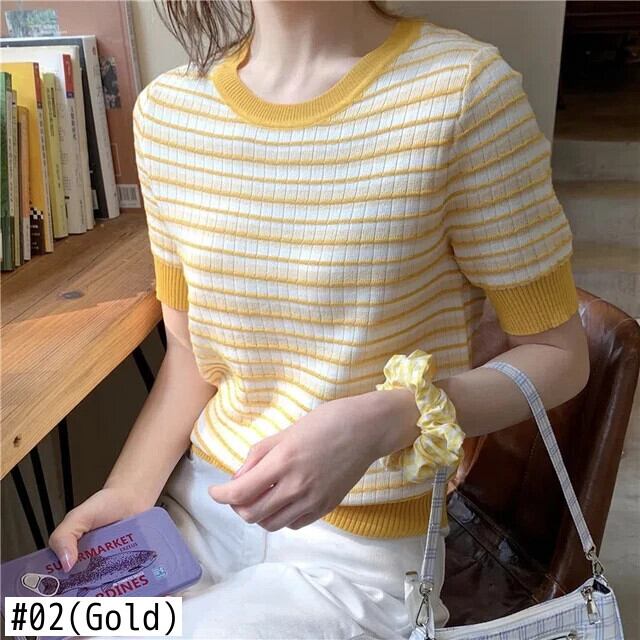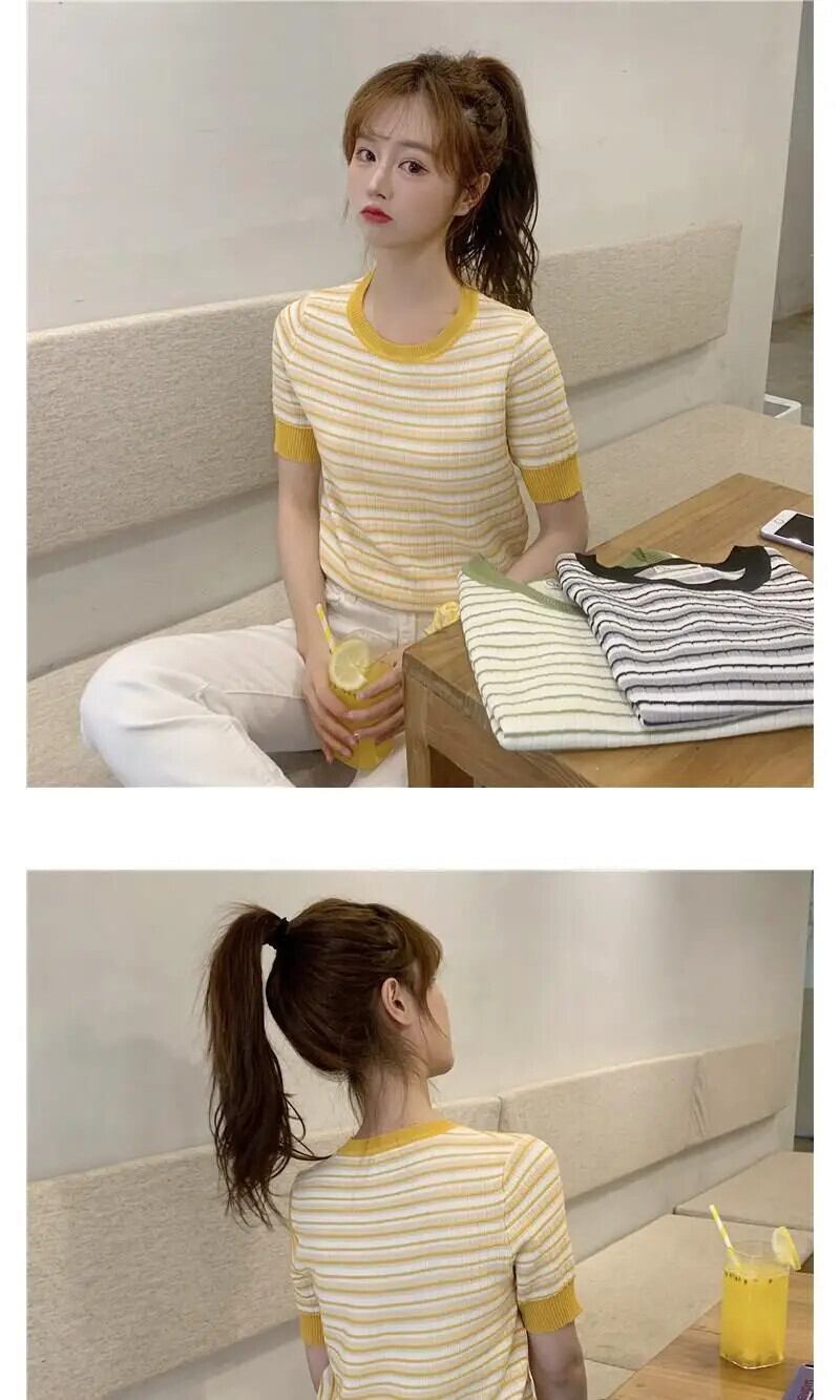 夏スリムフィットウエストショートアイスレインボーストライプトップニットTシャツ薄い サマー 夏物 シルク