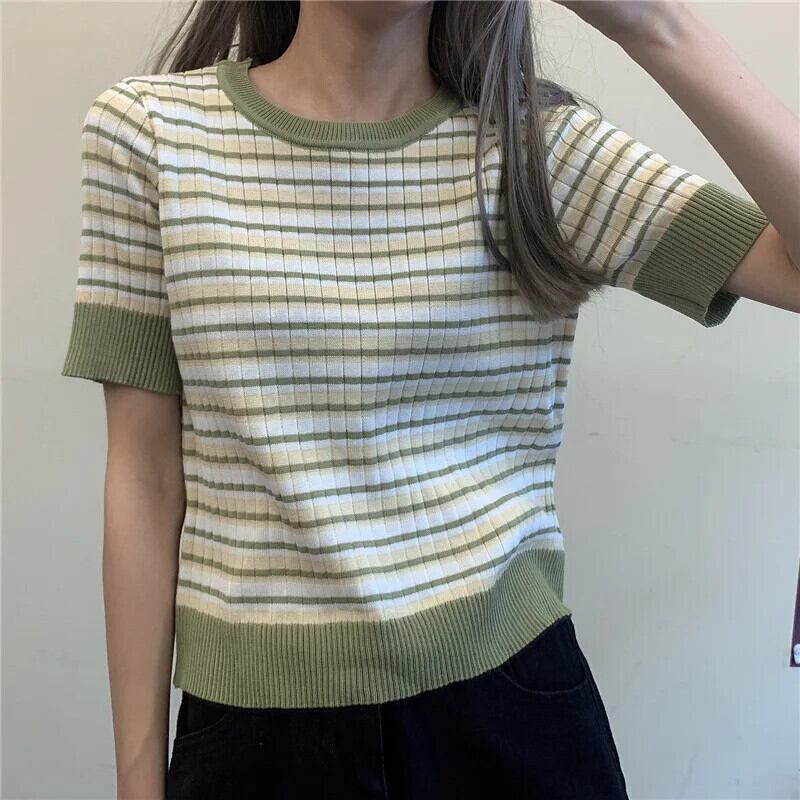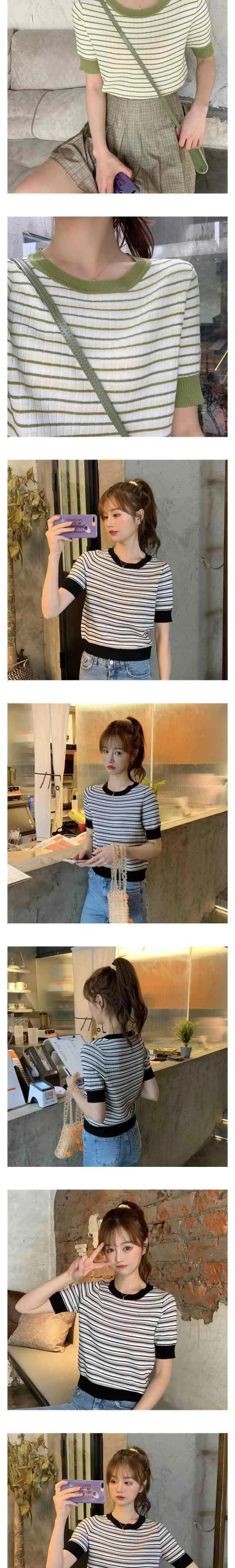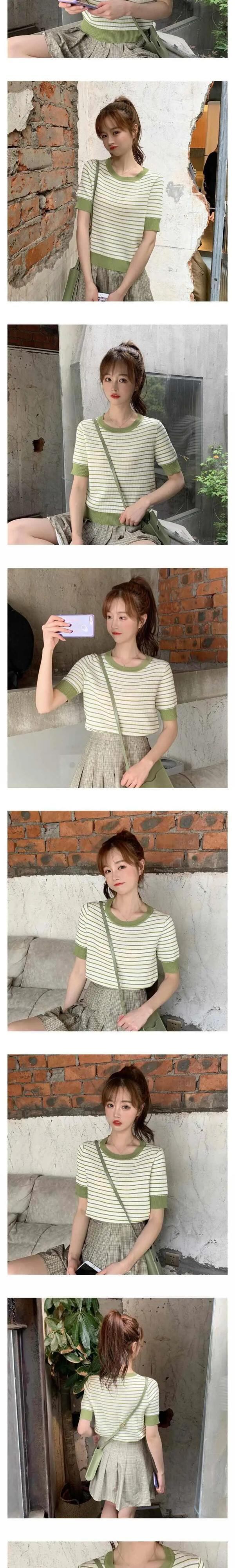 夏スリムフィットウエストショートアイスレインボーストライプトップニットTシャツ薄い サマー 夏物 シルク