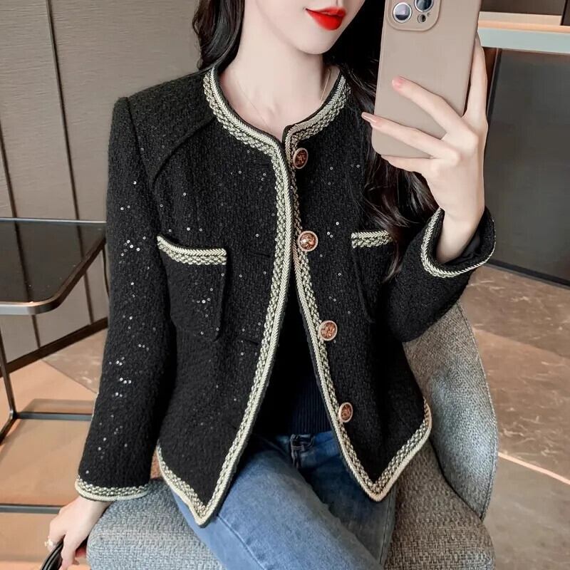 秋スパンコール ツイード シングルブレスト ショート コート ツイード ジャケット アウター オータム 秋物
