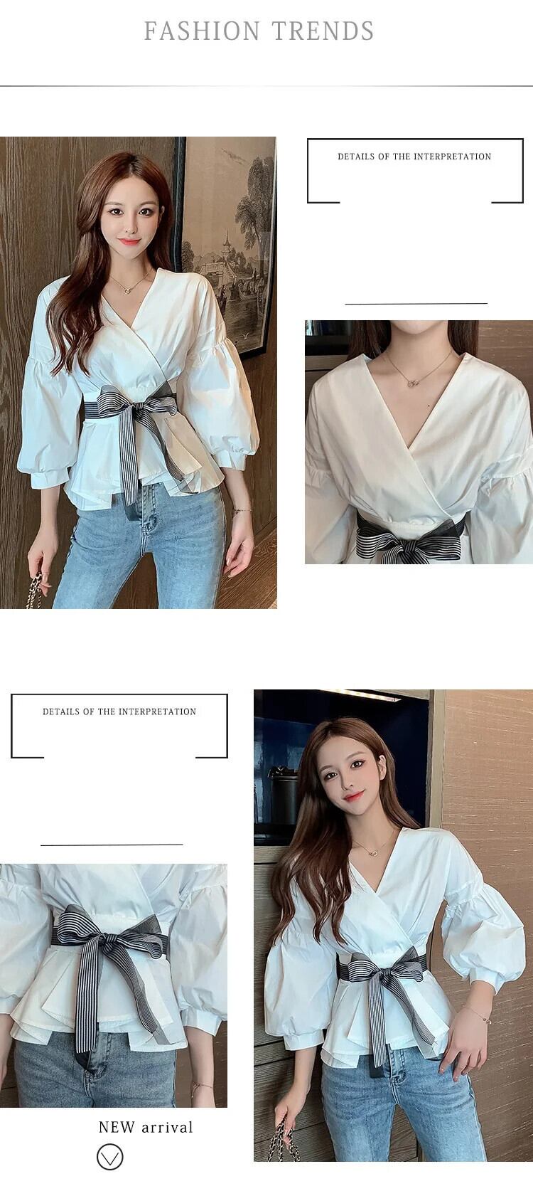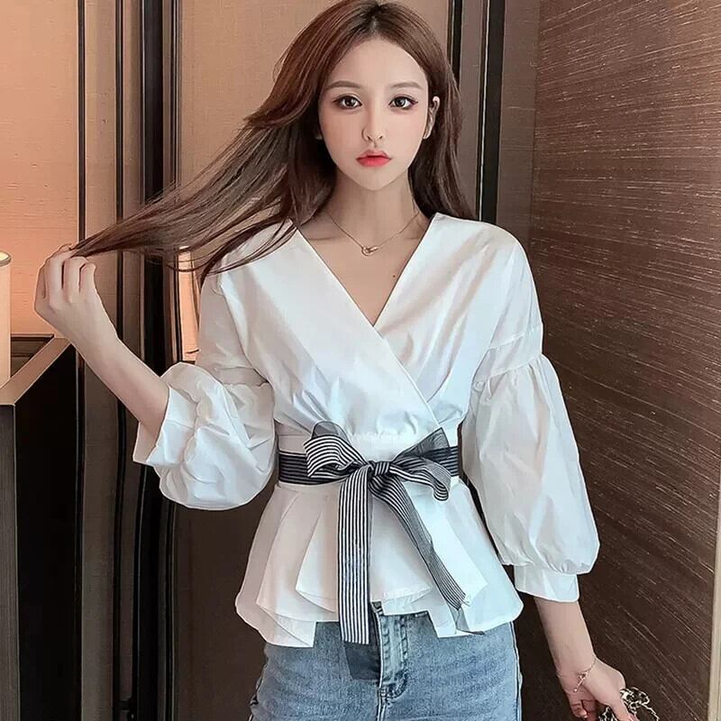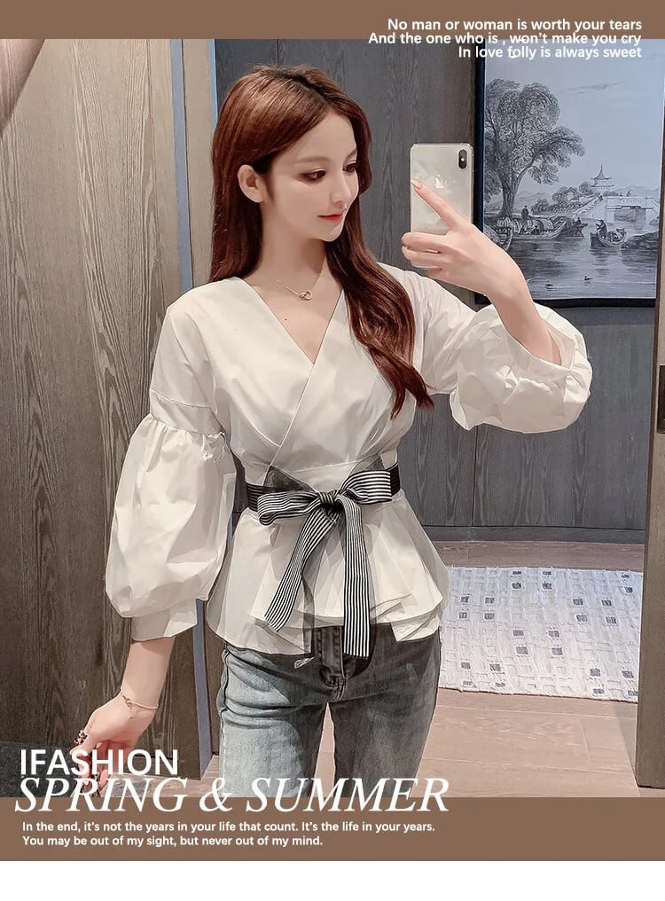春蝶ネクタイウエストフリル V ネックランタンスリーブ白シャツ ホワイト リボン スプリング 春物 Vネック