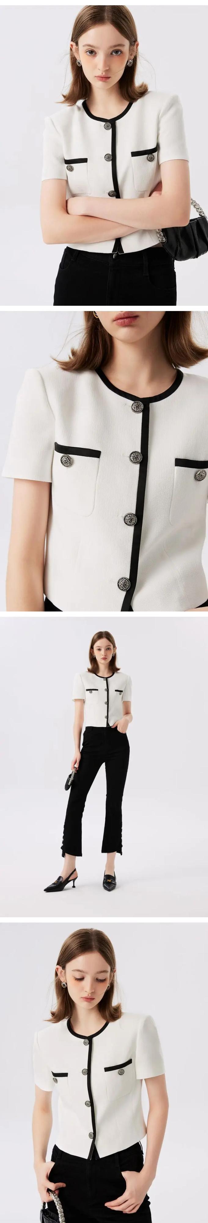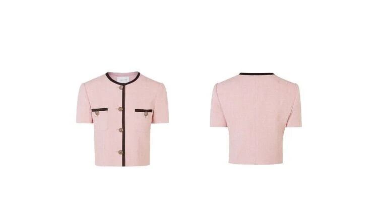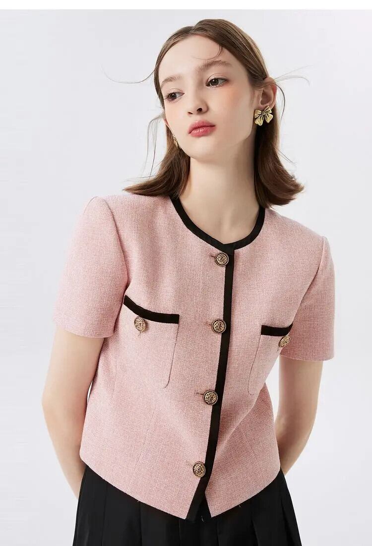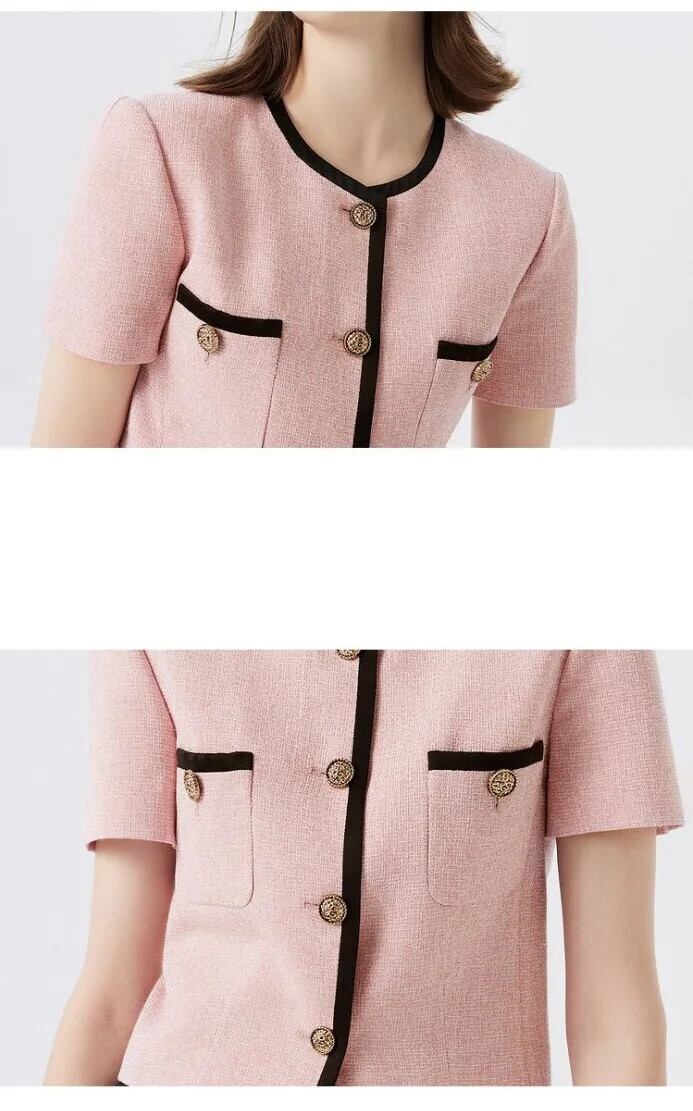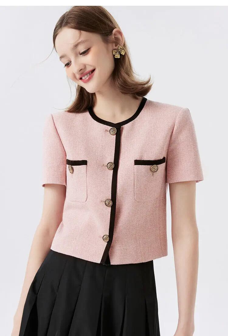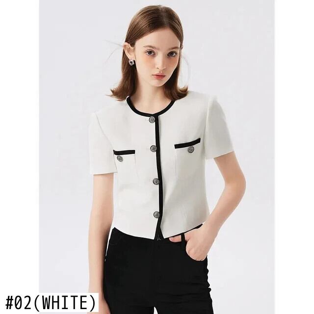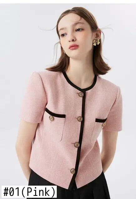 ショートサマーコントラストコートレディースホワイトピンクスリムフィットシングルブレストスイートラウンドネックジャケット 大人ガーリー スウィート キュート カジュアル 夏物 Oネック