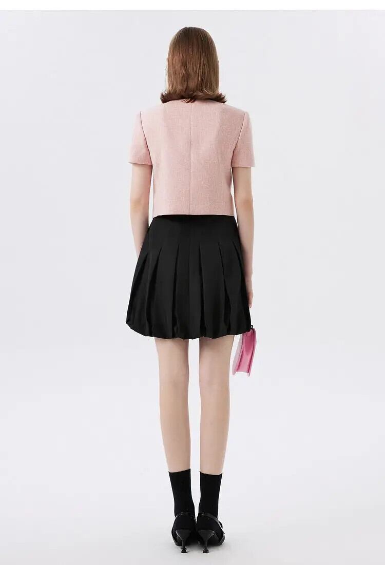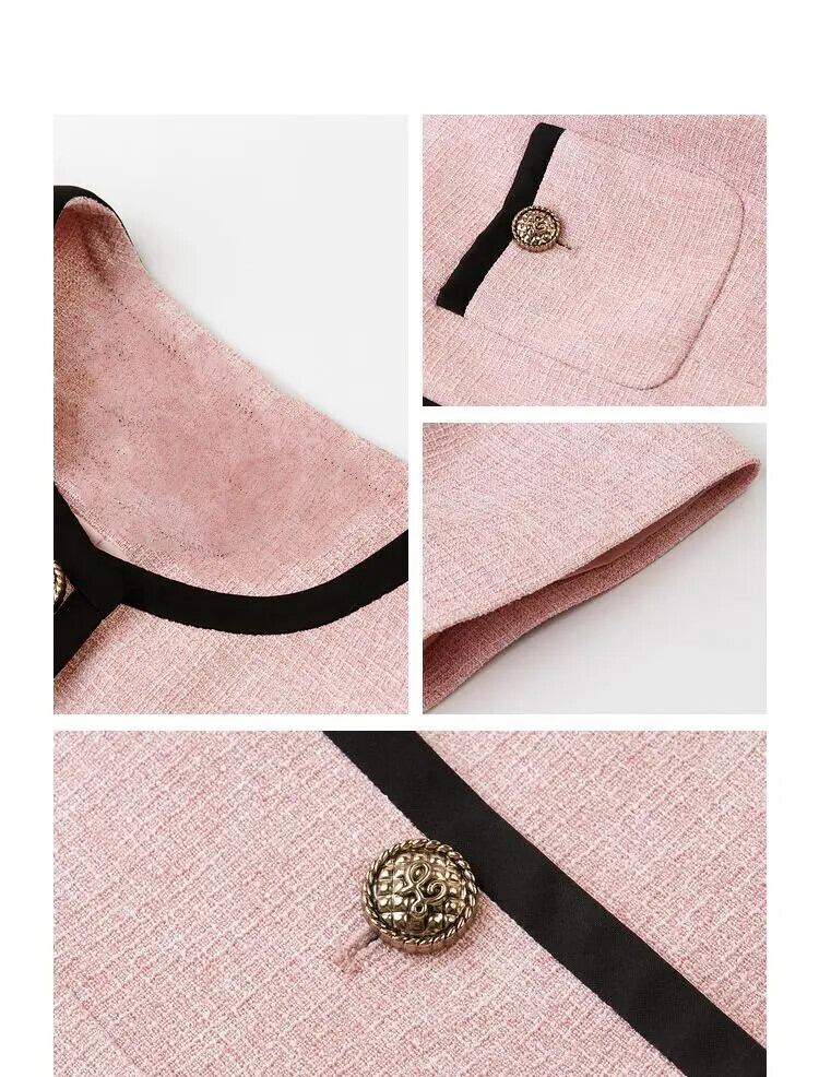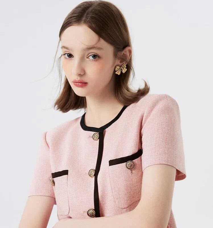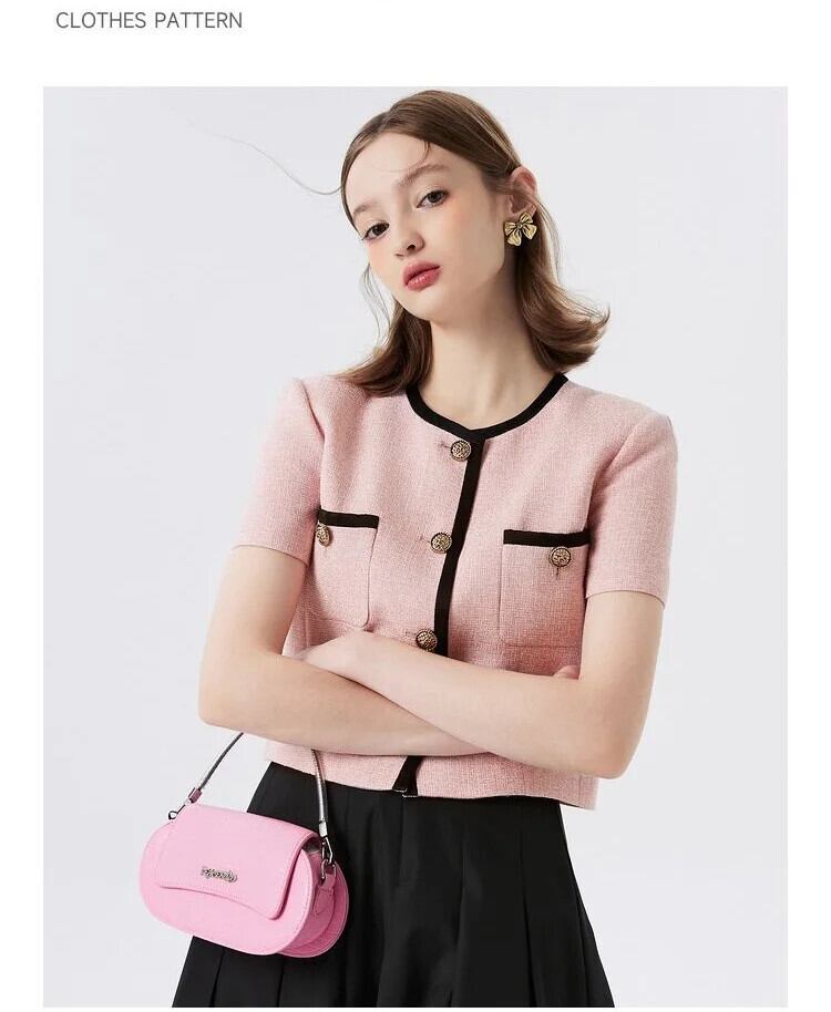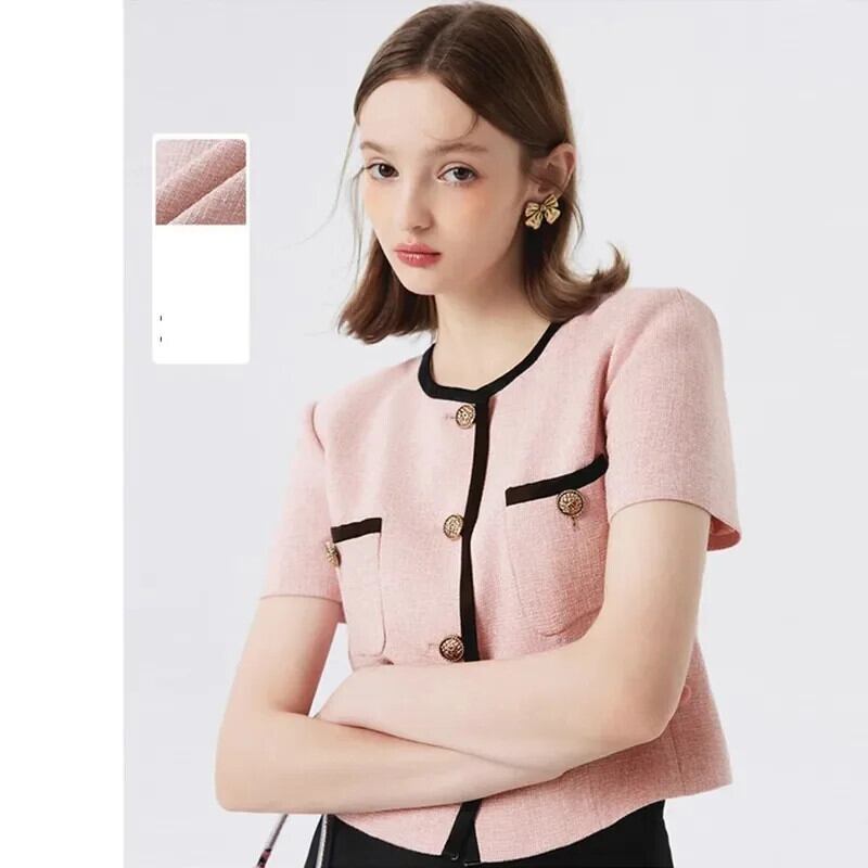 ショートサマーコントラストコートレディースホワイトピンクスリムフィットシングルブレストスイートラウンドネックジャケット 大人ガーリー スウィート キュート カジュアル 夏物 Oネック