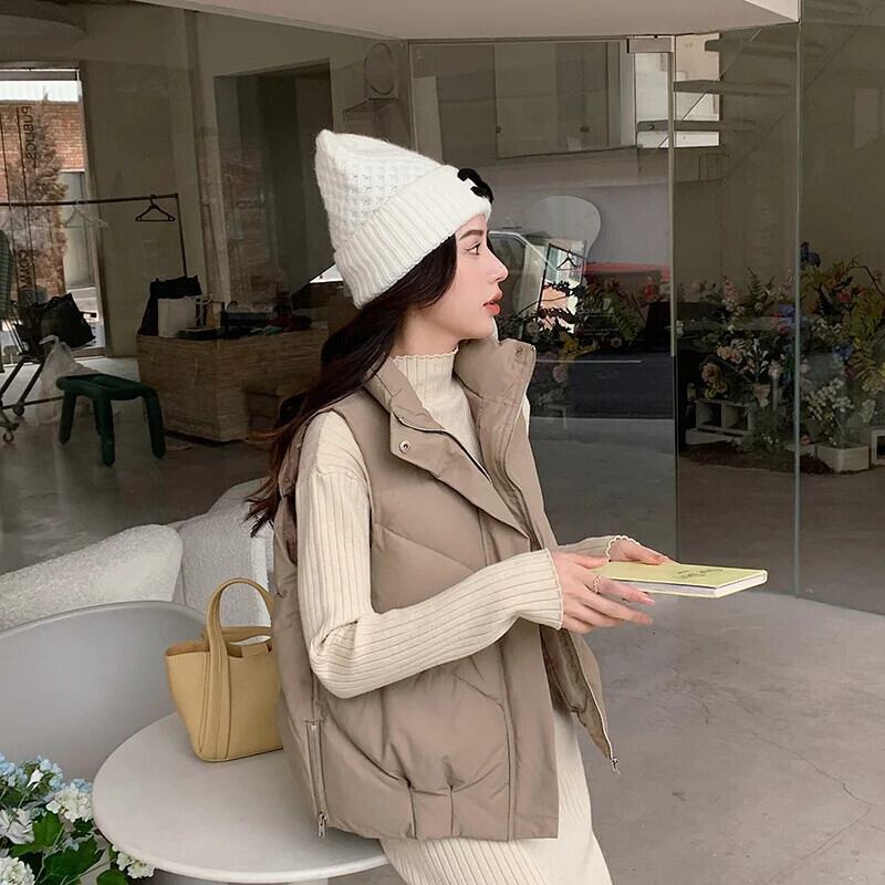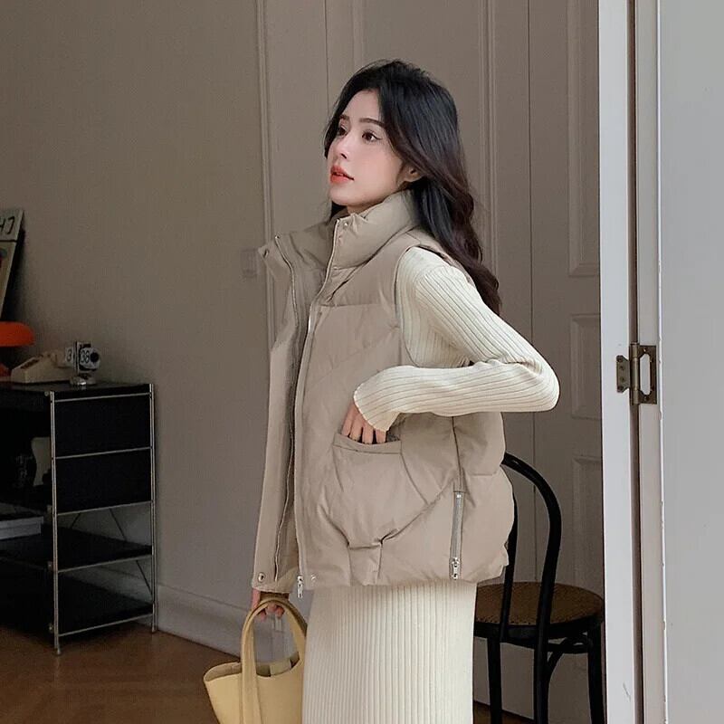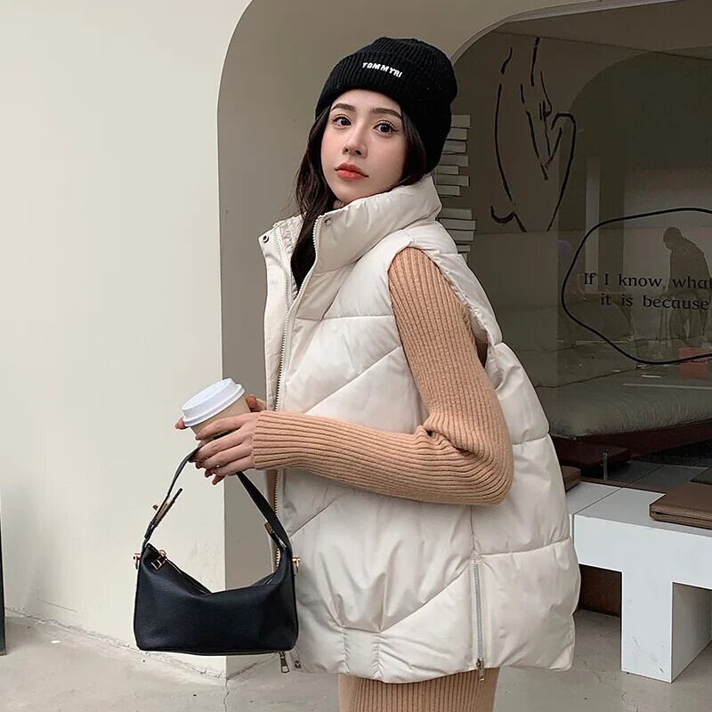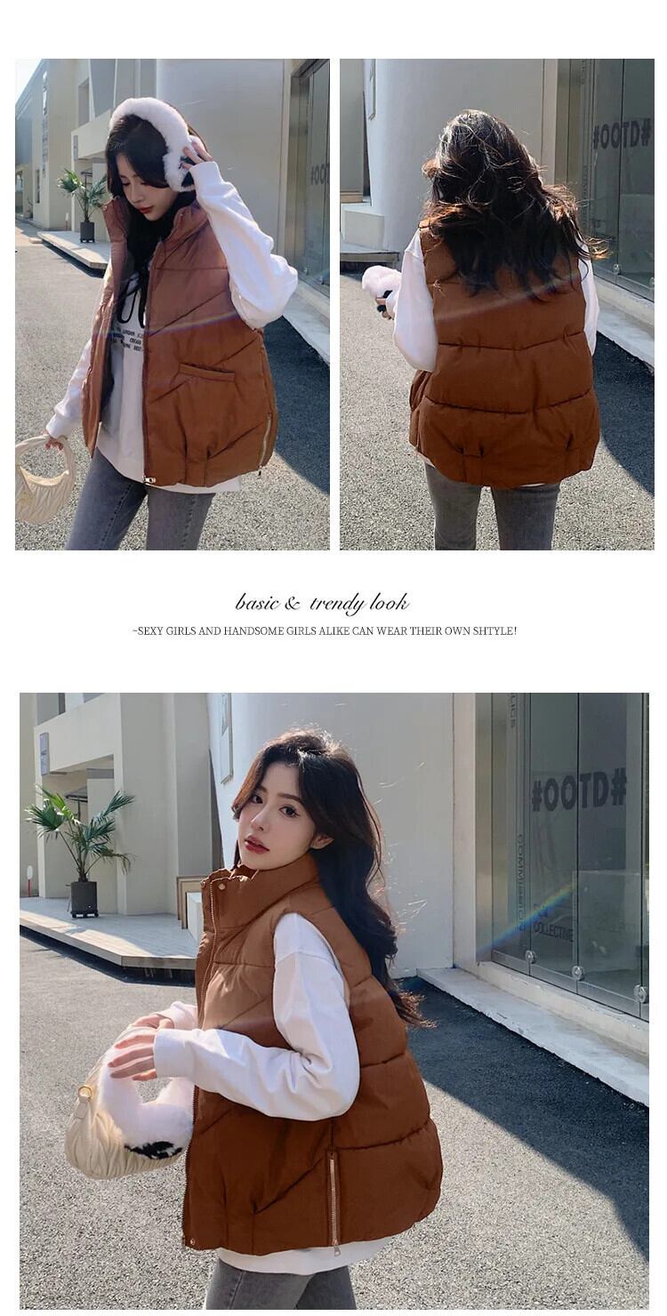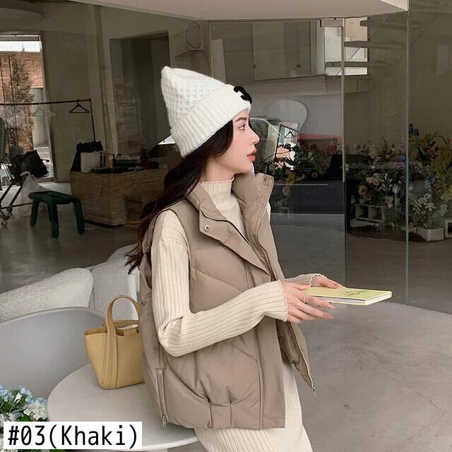 秋/冬ソリッドカラーサイドジッパールーズダウンコットンベストノースリーブコットンチョッキ オータム 秋物 ウィンター 冬物