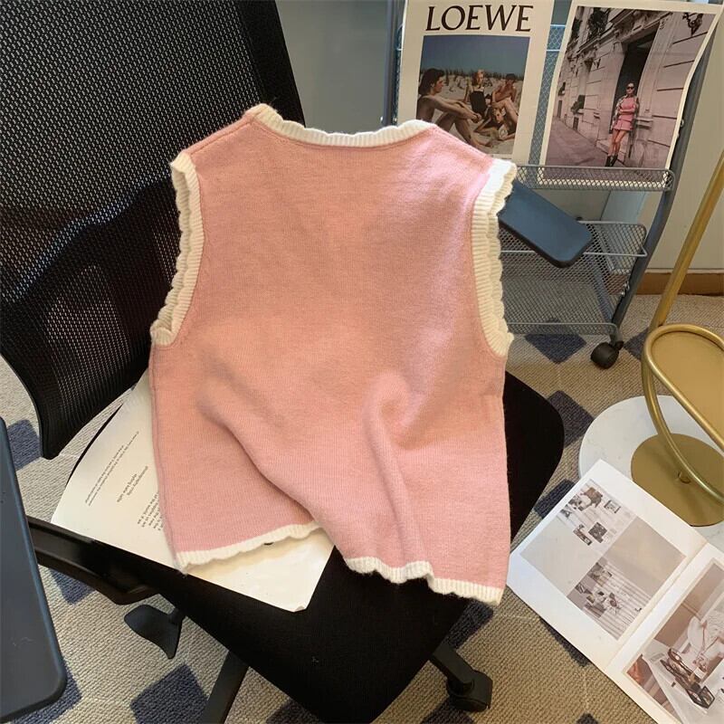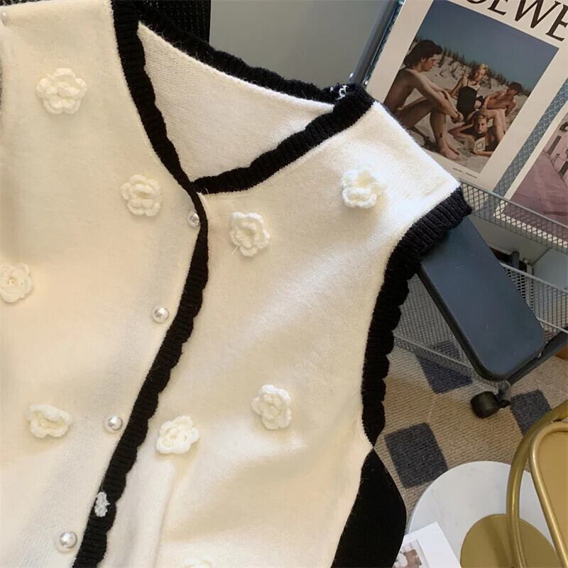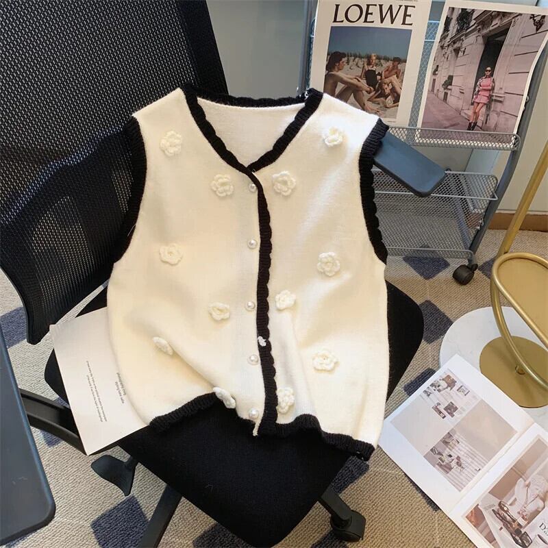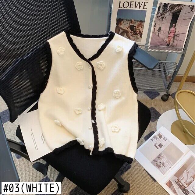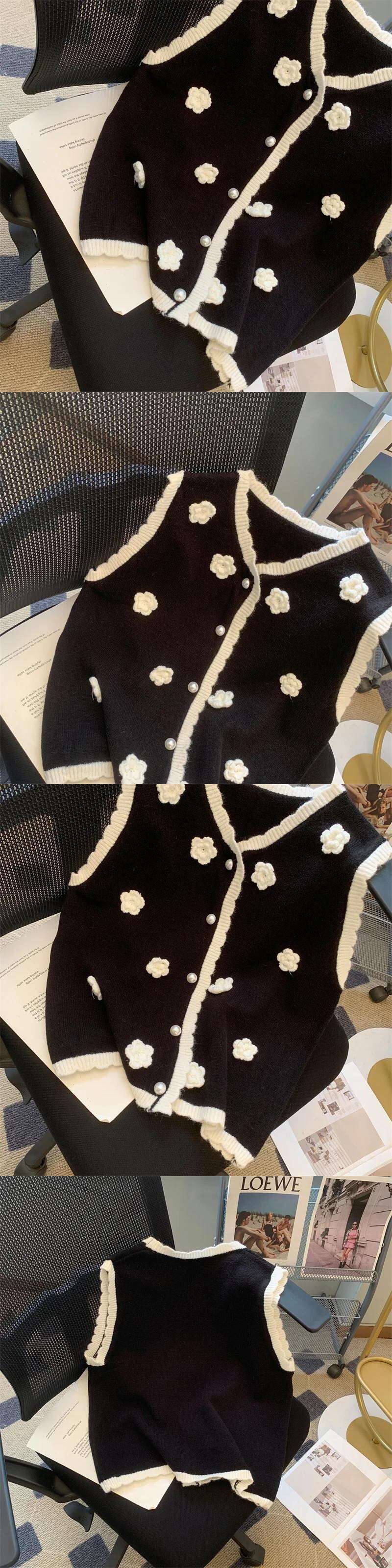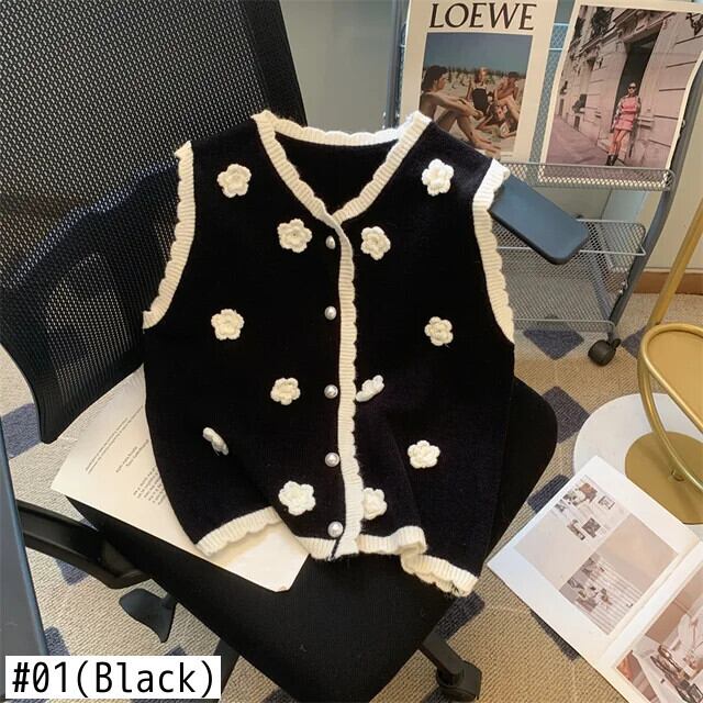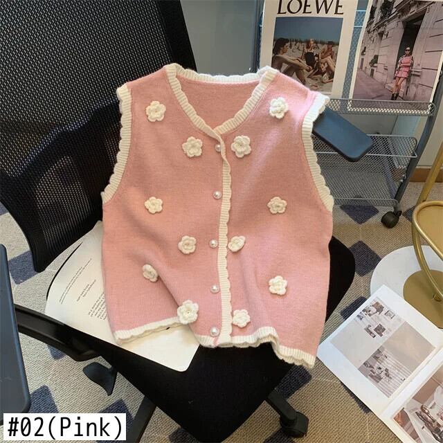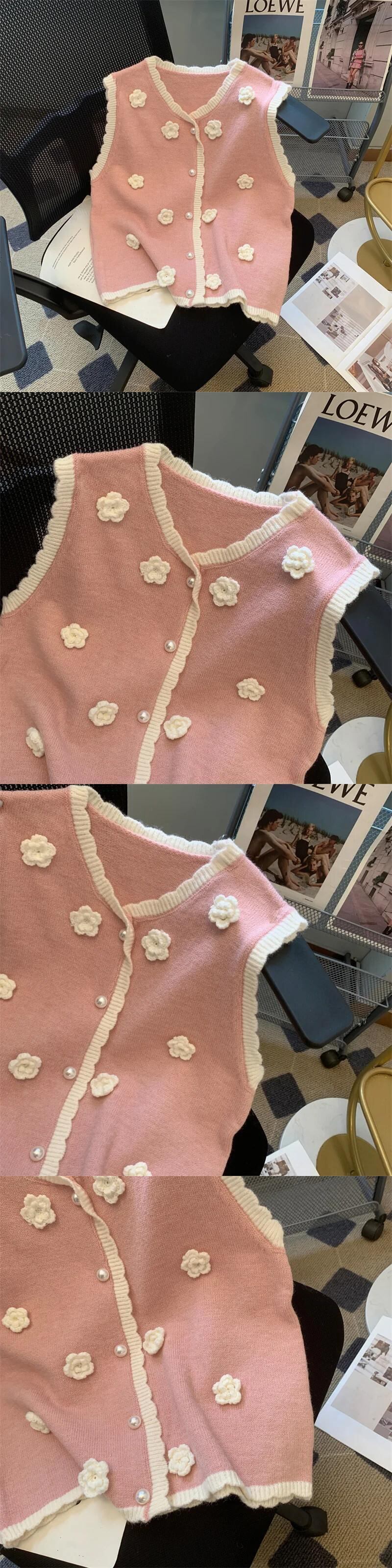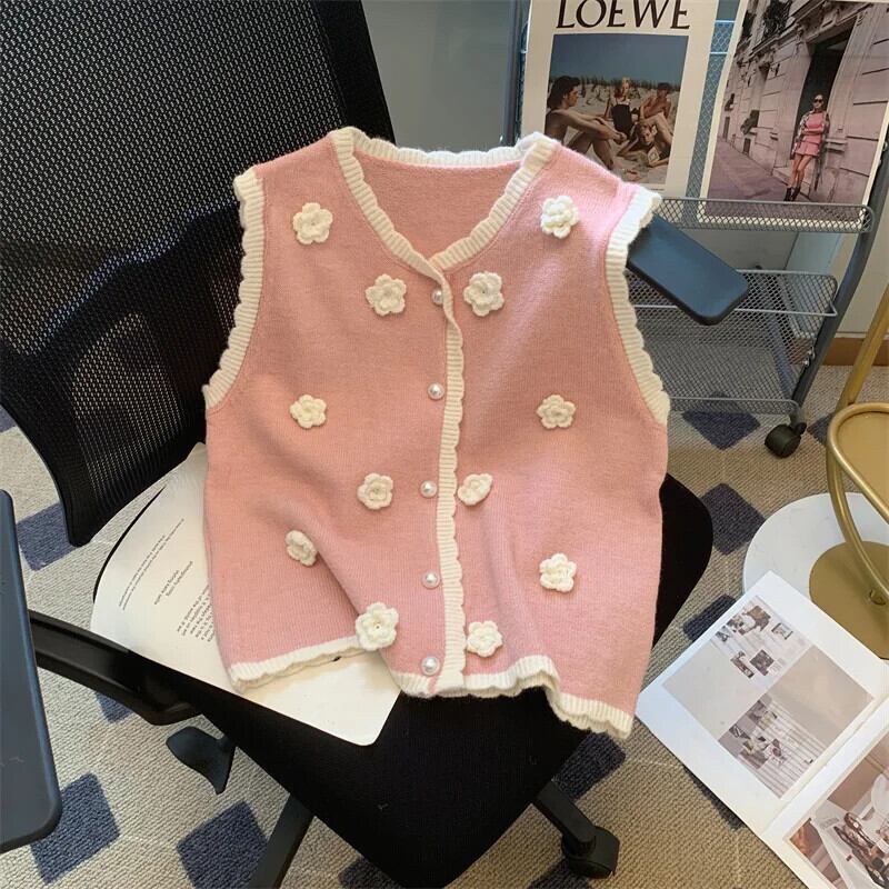 重工業フラワーニットベスト春秋ルーズパールボタンセータータンクトップ スプリング 春物 オータム 秋物 真珠 フラワーデザイン