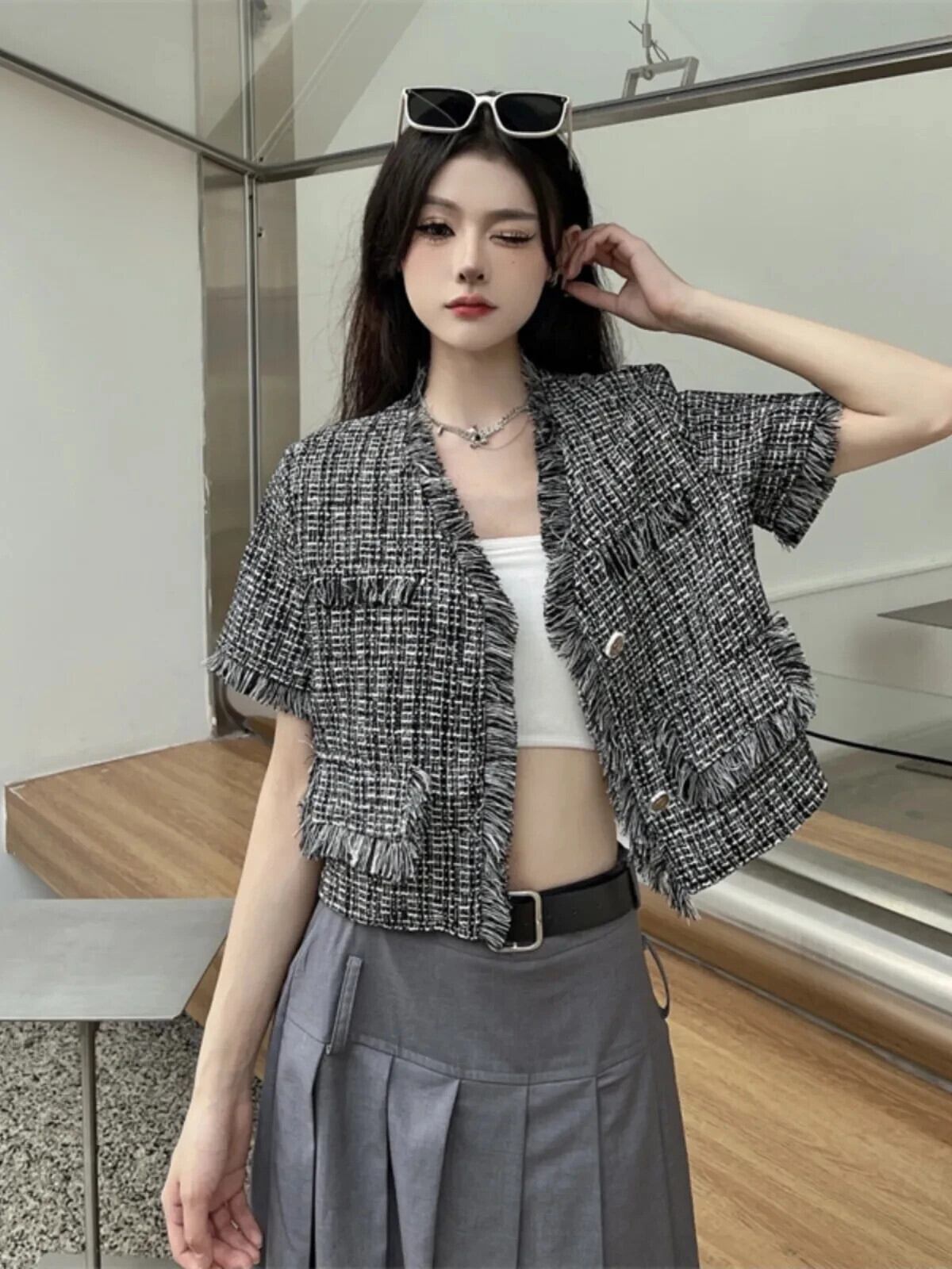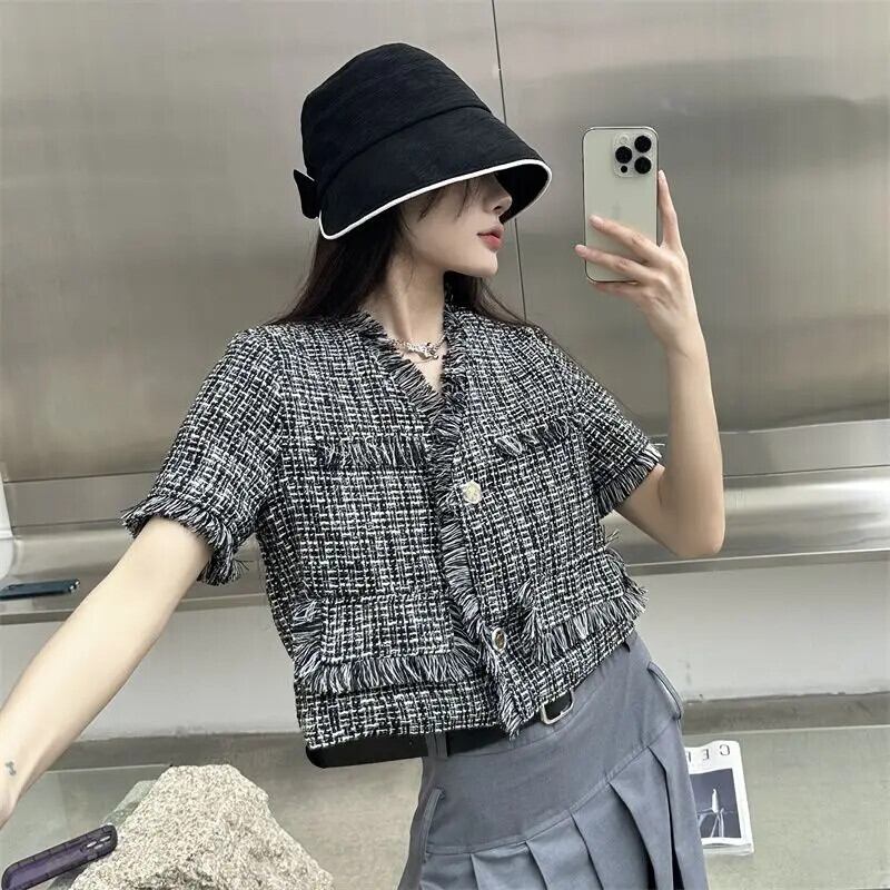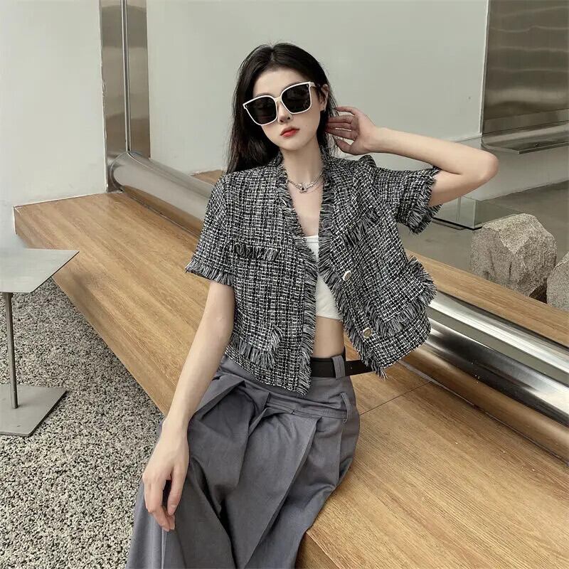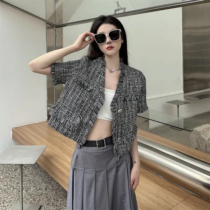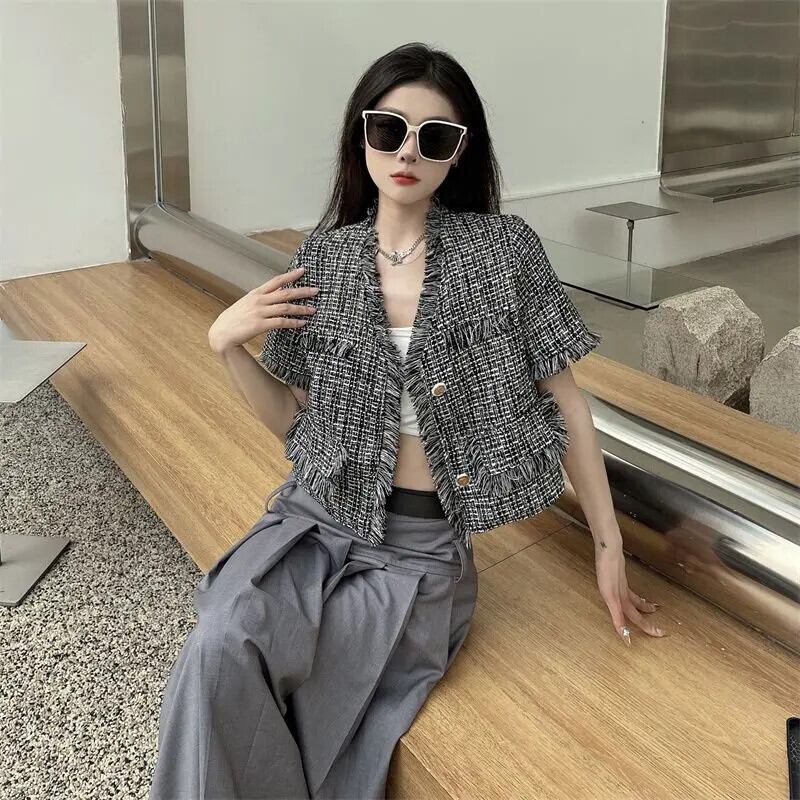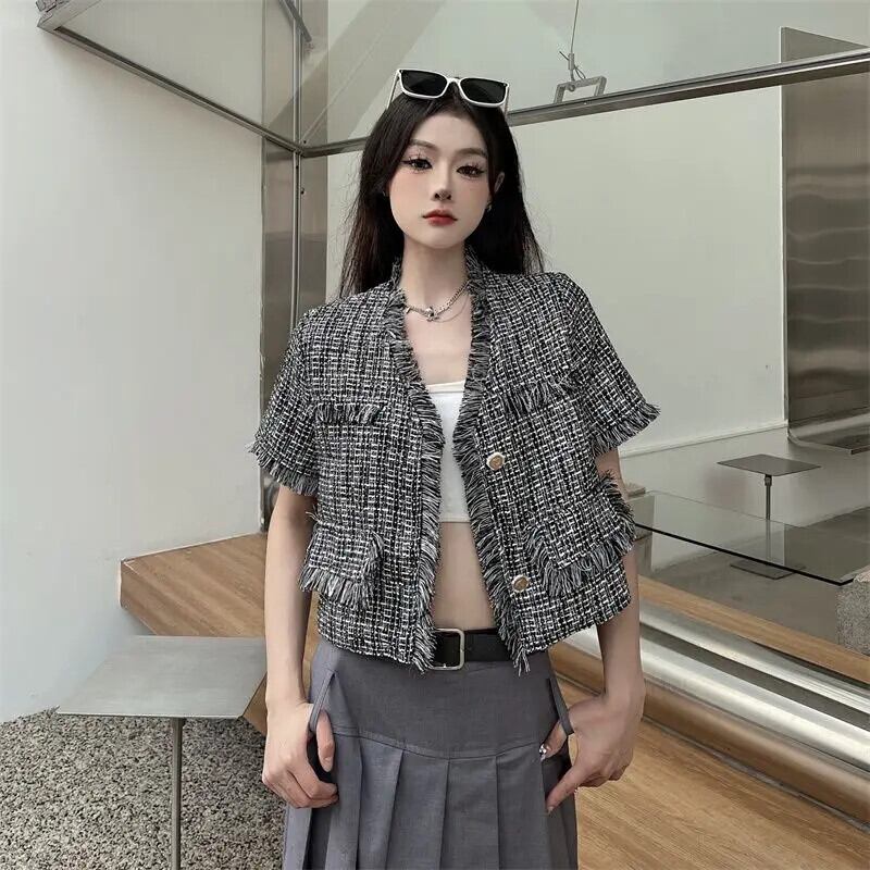 Tel 織られたフレグランス スタイル ショート ジャケット夏薄い気質コート ブラック サマー 夏物