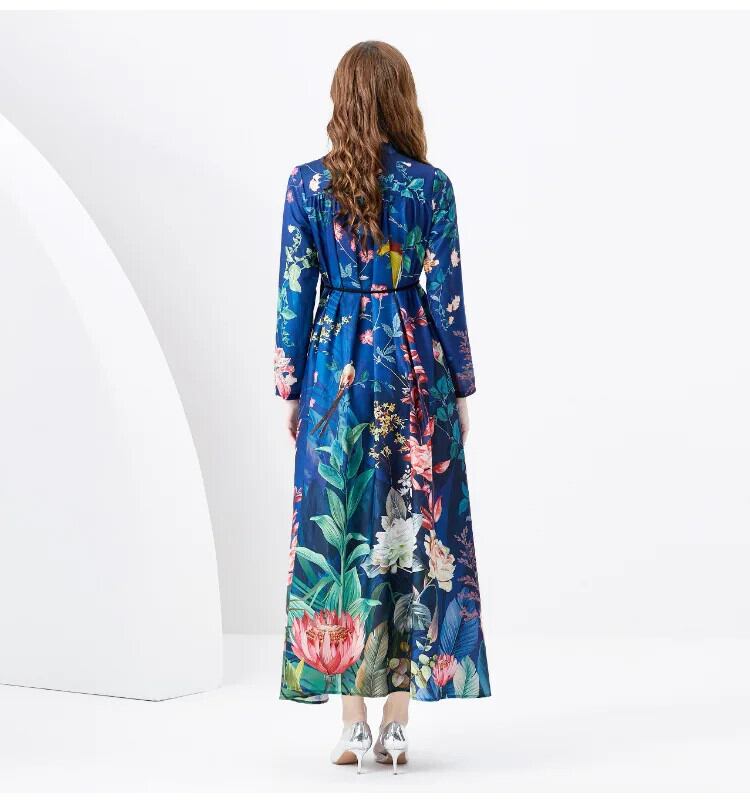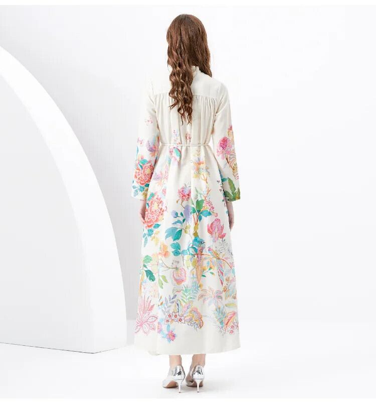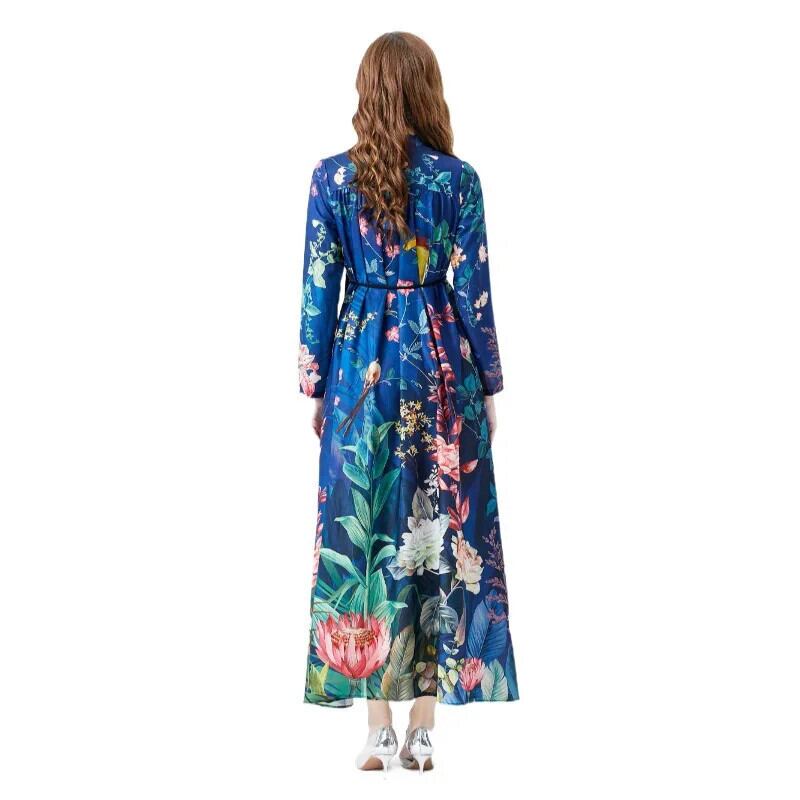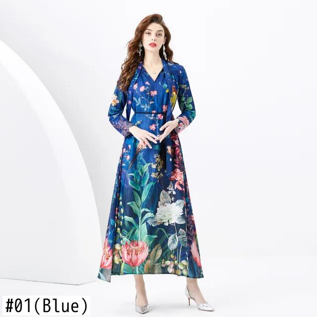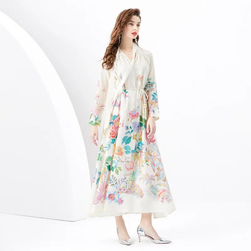 2024 春夏休暇レトロ宮殿スタイル V ネックルーズ長袖プリントドレス ロング レース スプリング 春物 サマー 夏物 Vネック