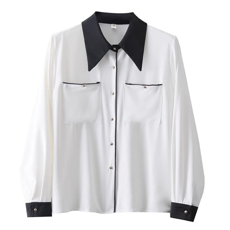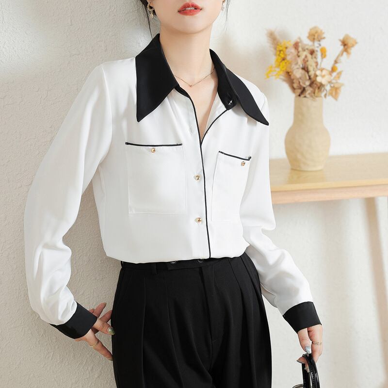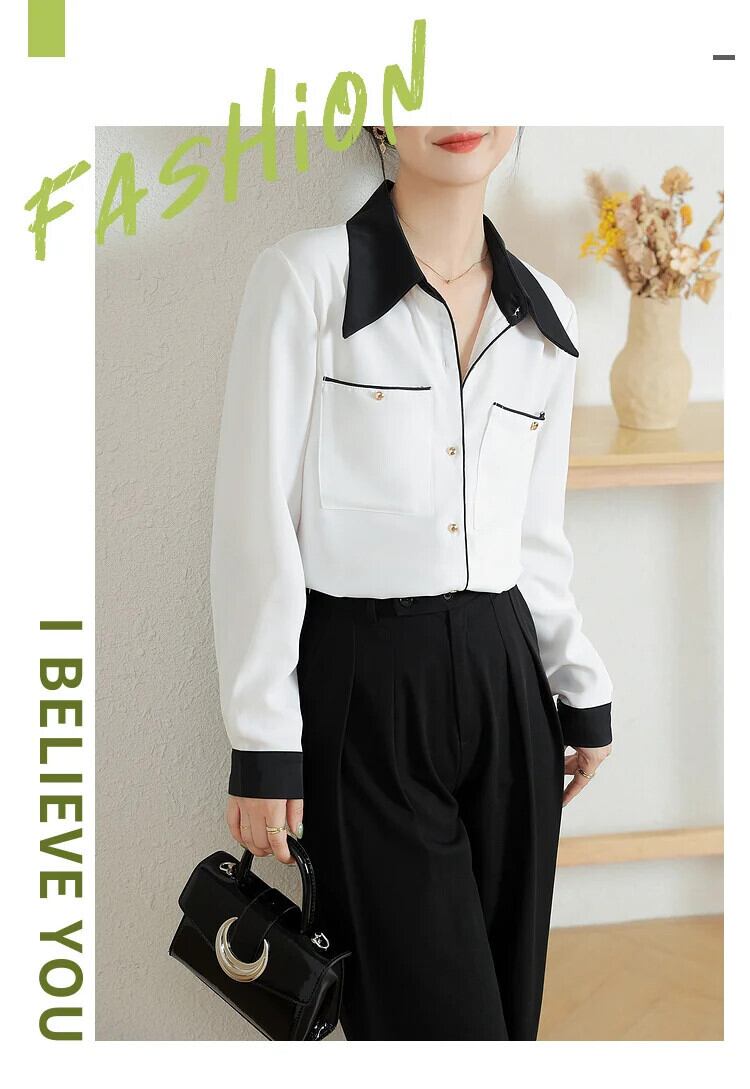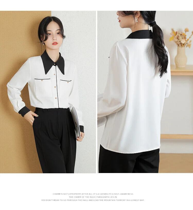 春シフォンシンプル黒、白コントラスト長袖気質シャツ Ladeis ブラウス ロング ホワイト ブラック スプリング 春物