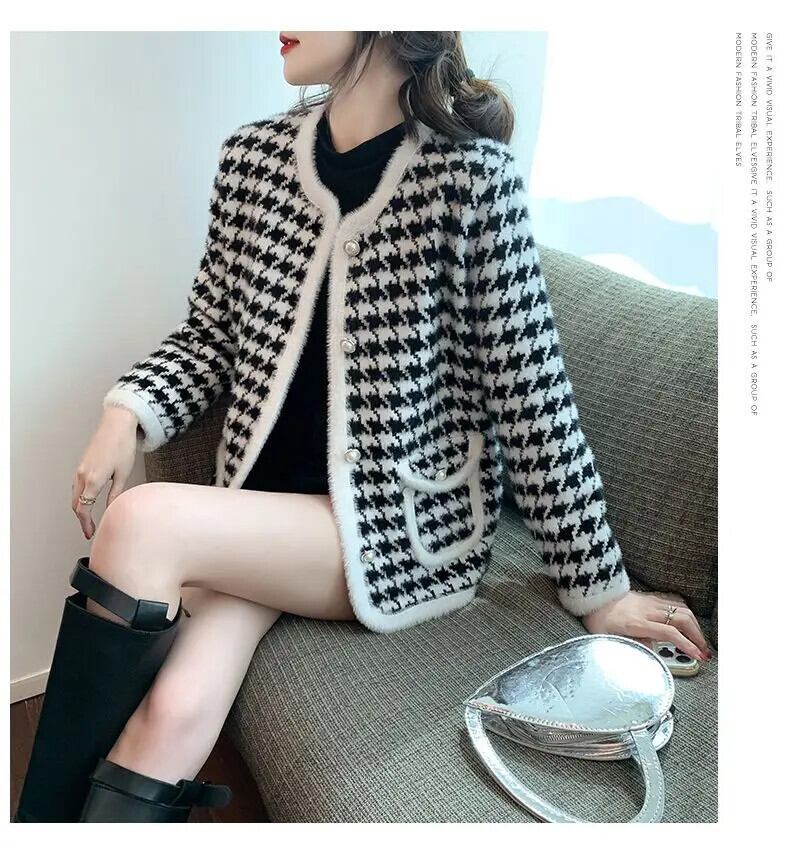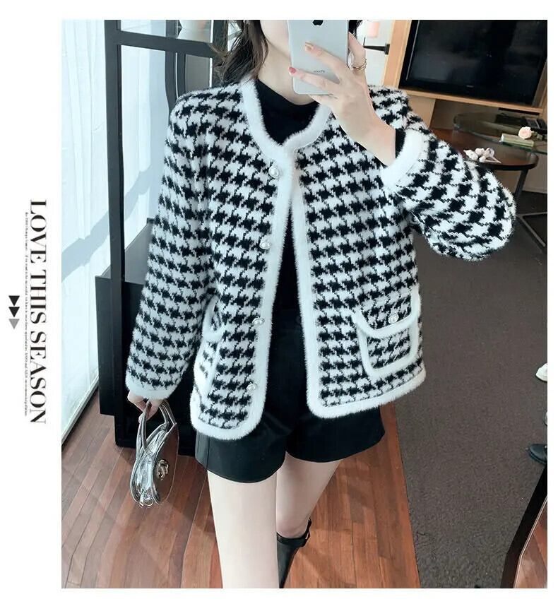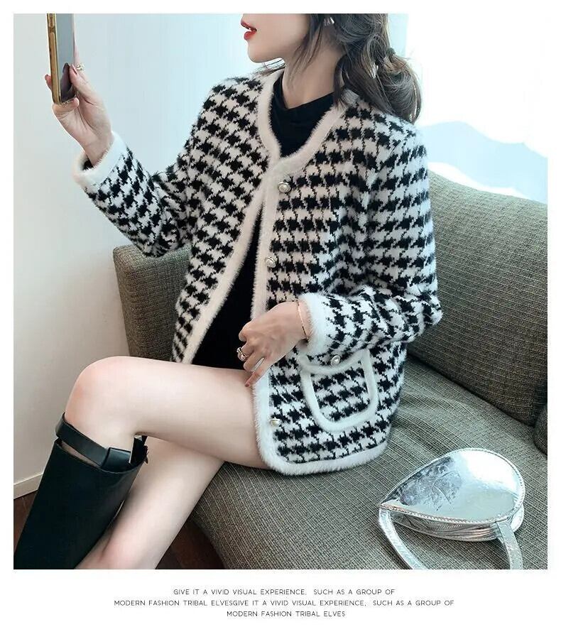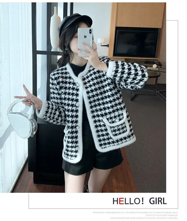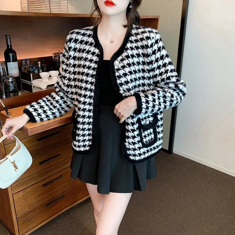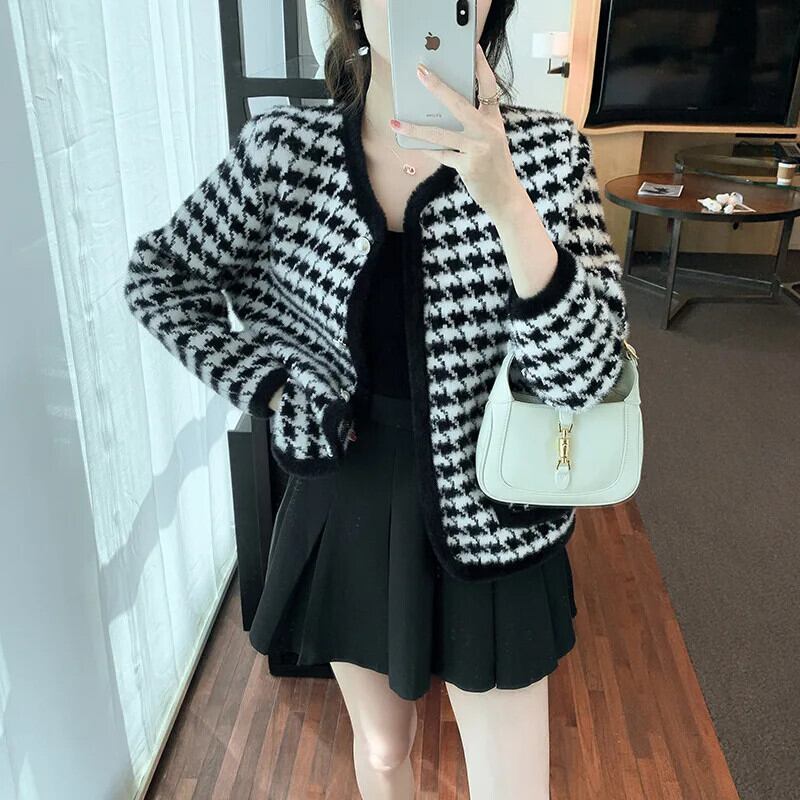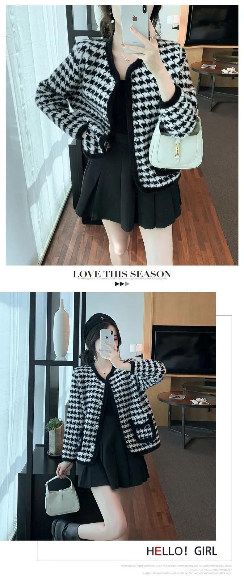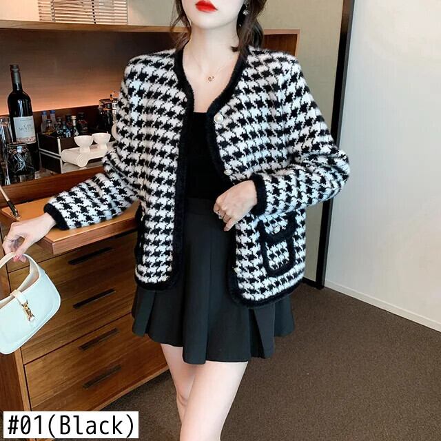 ツイードセレブ多用途ラウンドネック秋冬ショートコートレディチェック柄甘いジャケット 大人ガーリー スウィート キュート カジュアル オータム 秋物 ウィンター 冬物 Oネック