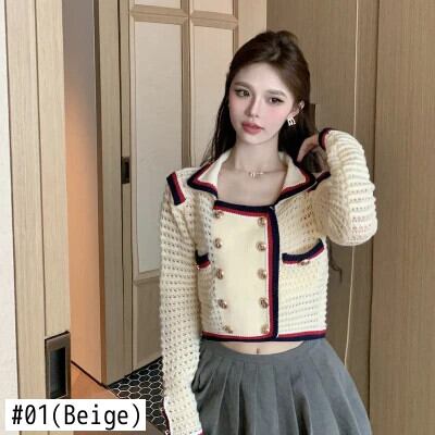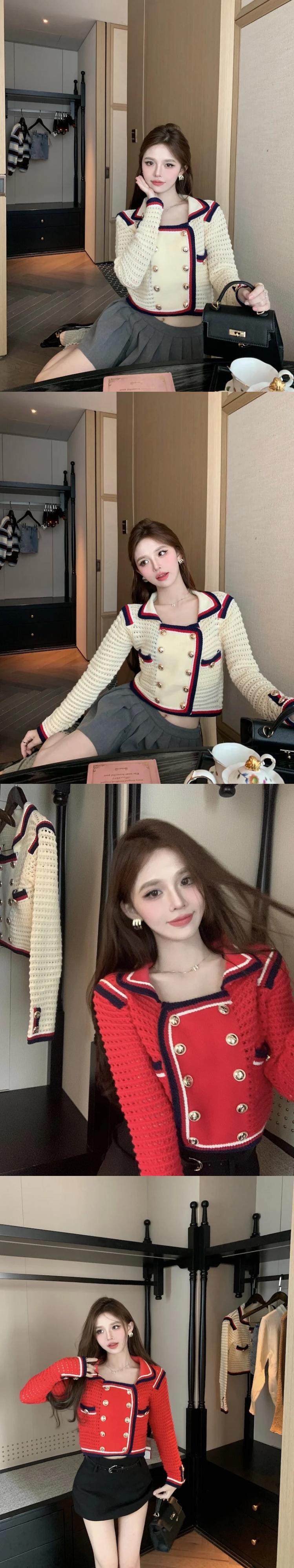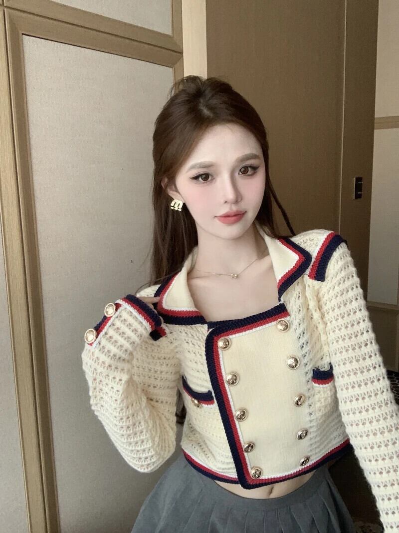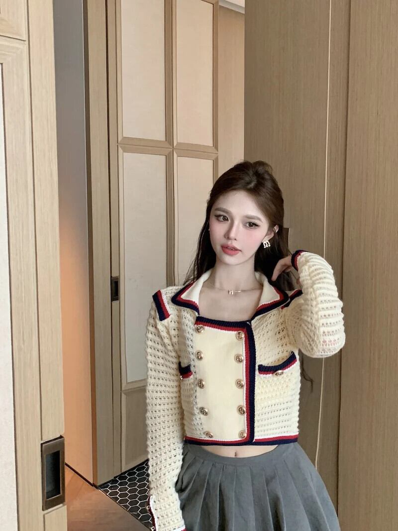ニットカーディガン秋コントラストショートフレグランスダブルブレストセーターコート オータム 秋物