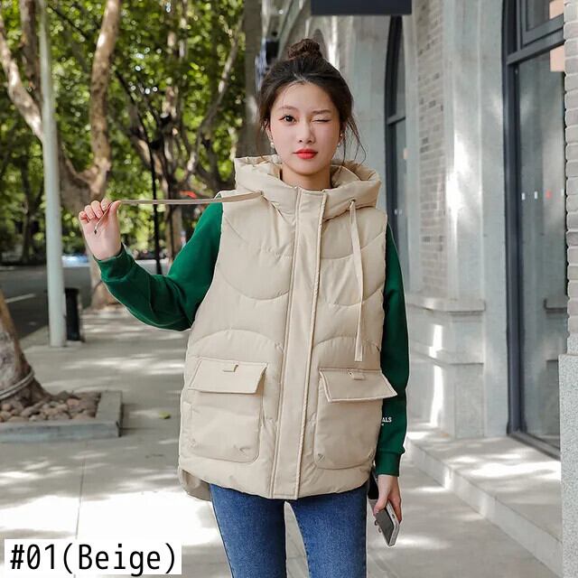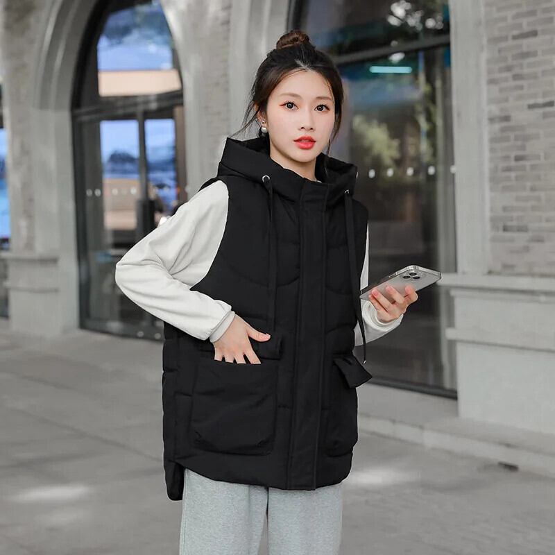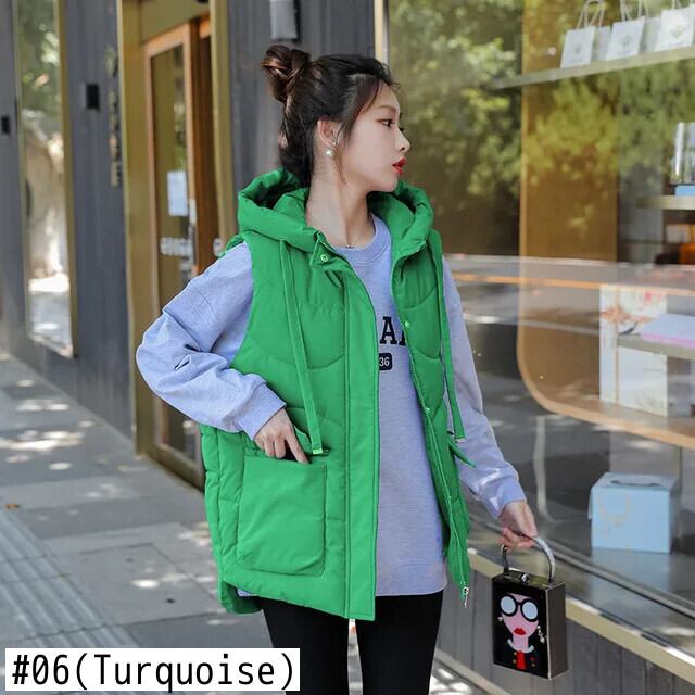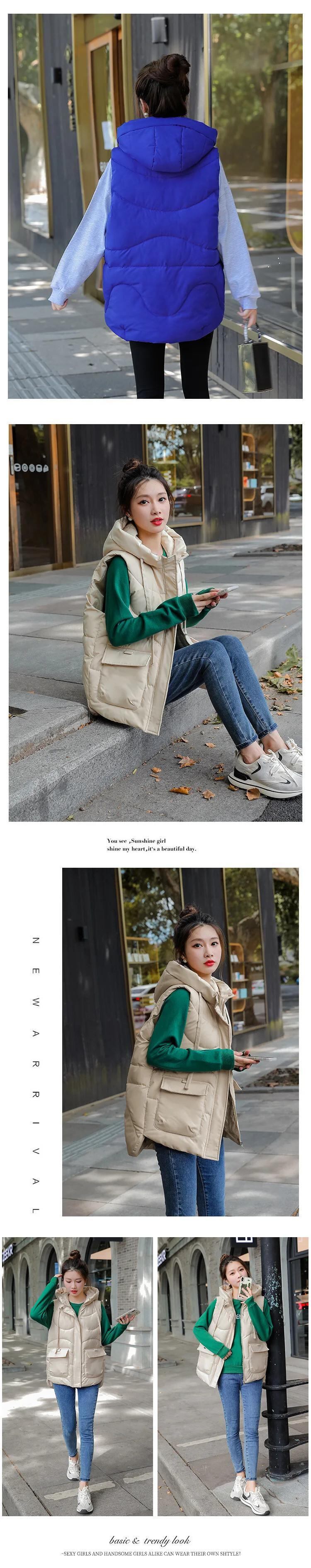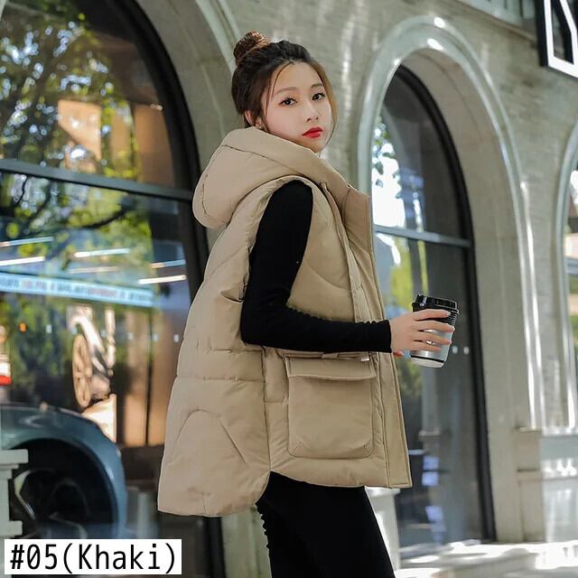 秋冬ミディベストコート暖かいノースリーブパーカーフード付きルーズチョッキアウター オータム 秋物 ウィンター 冬物 ソリッドカラー
