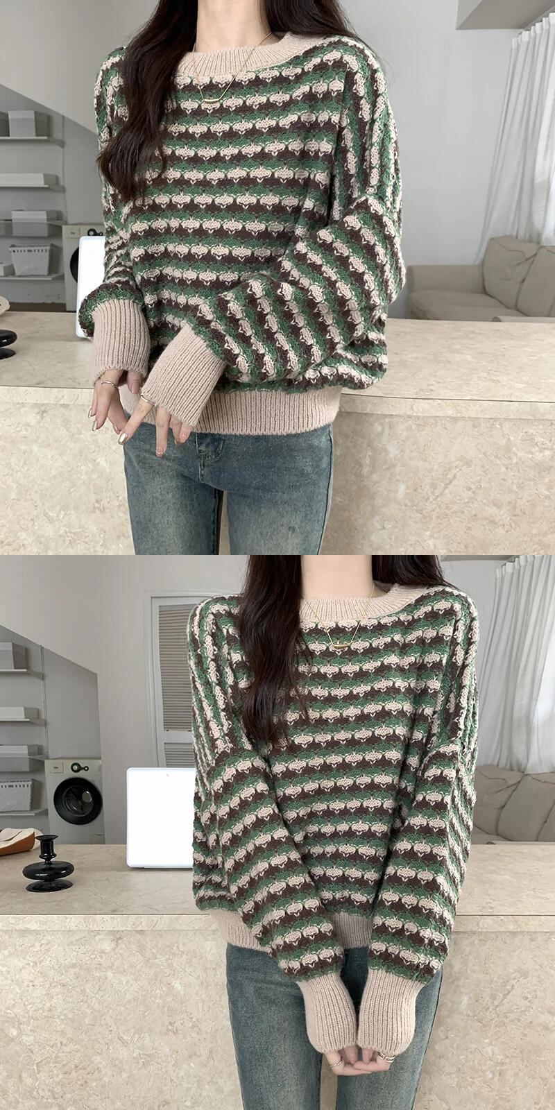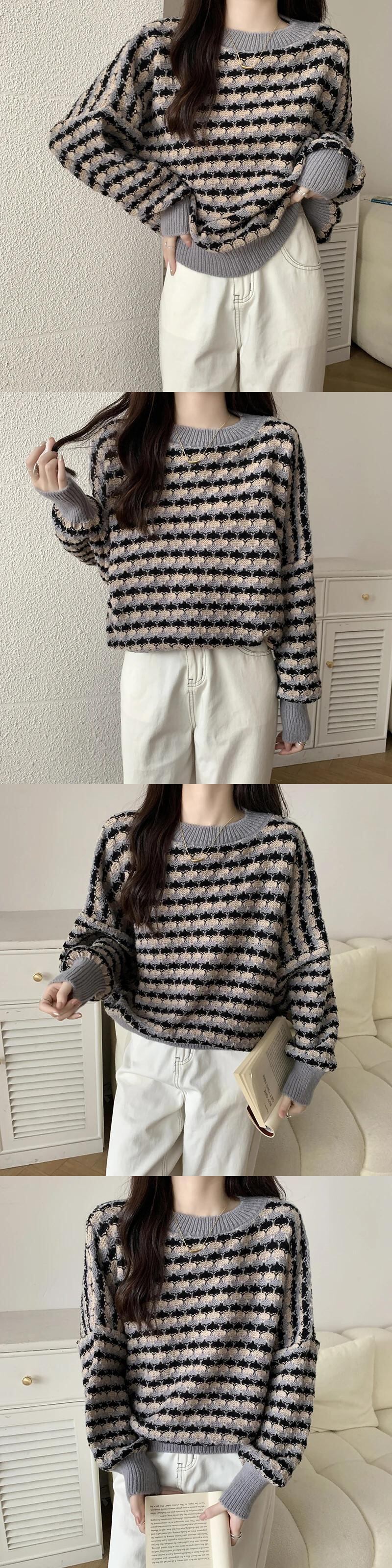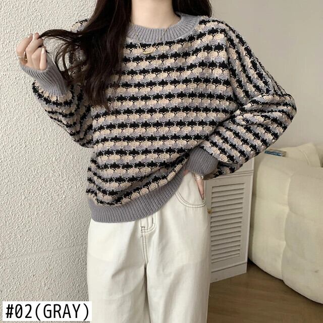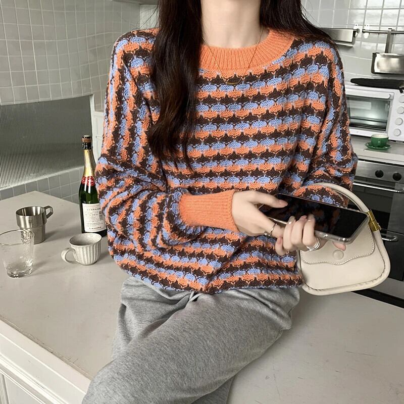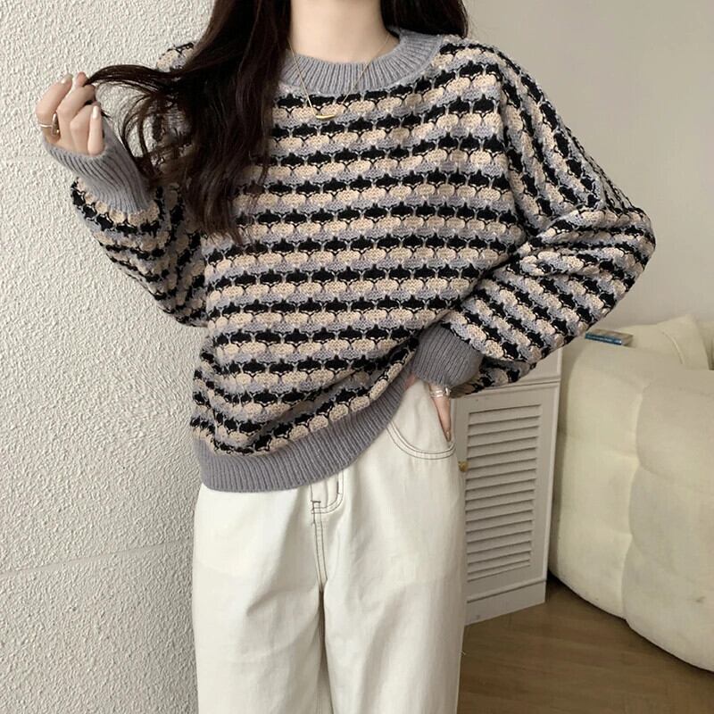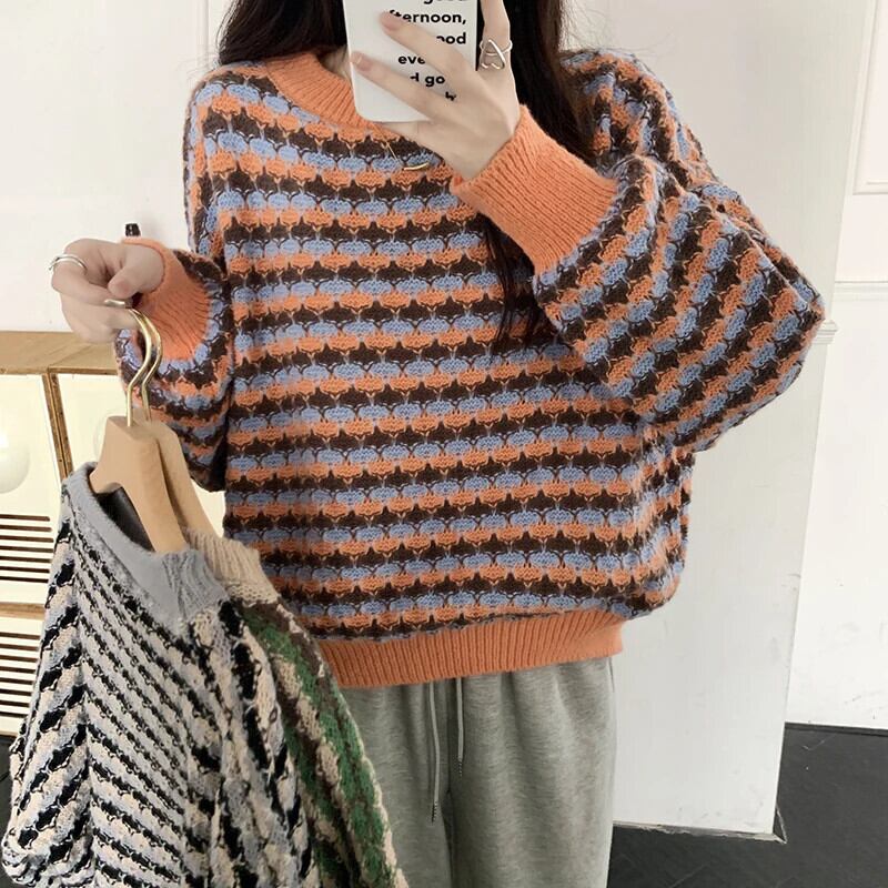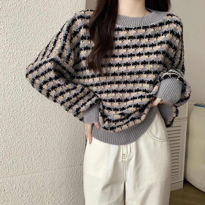 レディース秋冬ルーズプルオーバーコントラストラウンドネックセーターコート オータム 秋物 ウィンター 冬物 Oネック