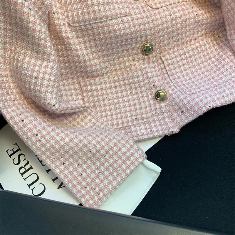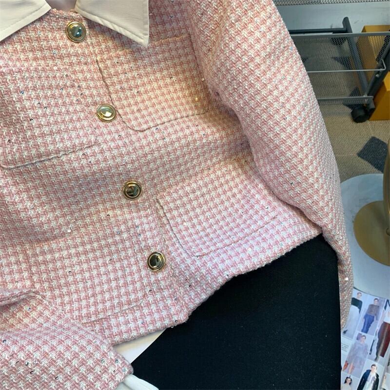 ホワイトラペルカラーマッチング袖口ピンクスパンコールツイードジャケット秋セレブ気質シックコート Jaqueta Casaco オータム 秋物