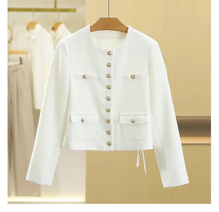 ソリッドフィットラウンドネック多用途ショートコート秋白黒ジャケット ホワイト ブラック オータム 秋物 Oネック ソリッドカラー