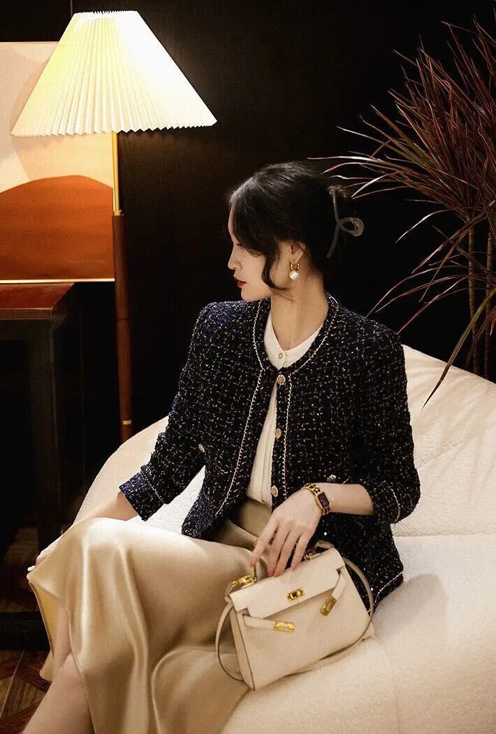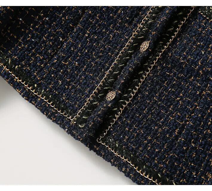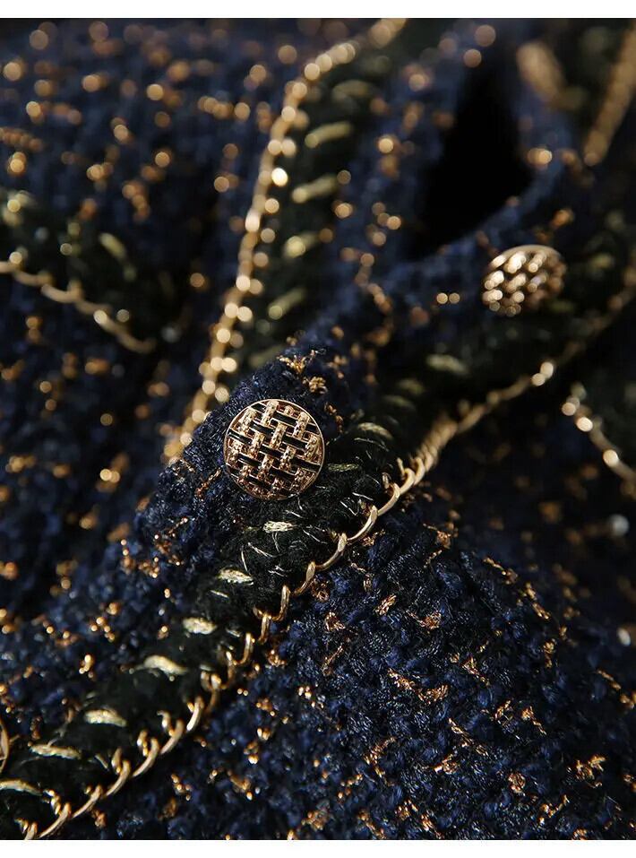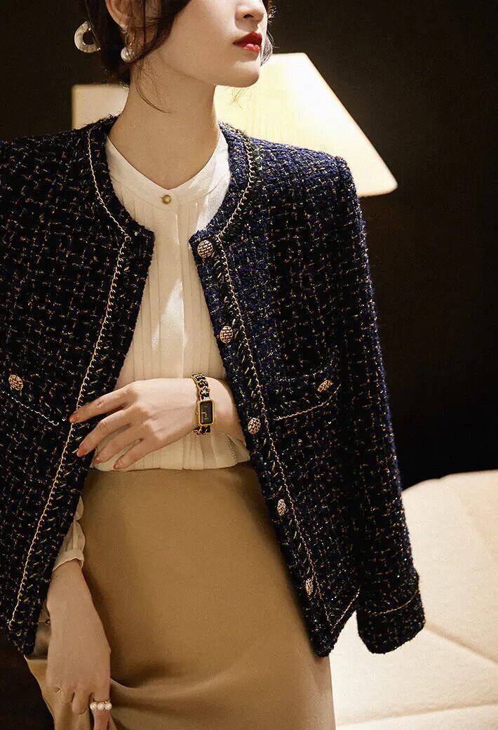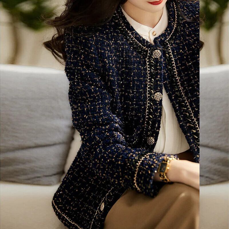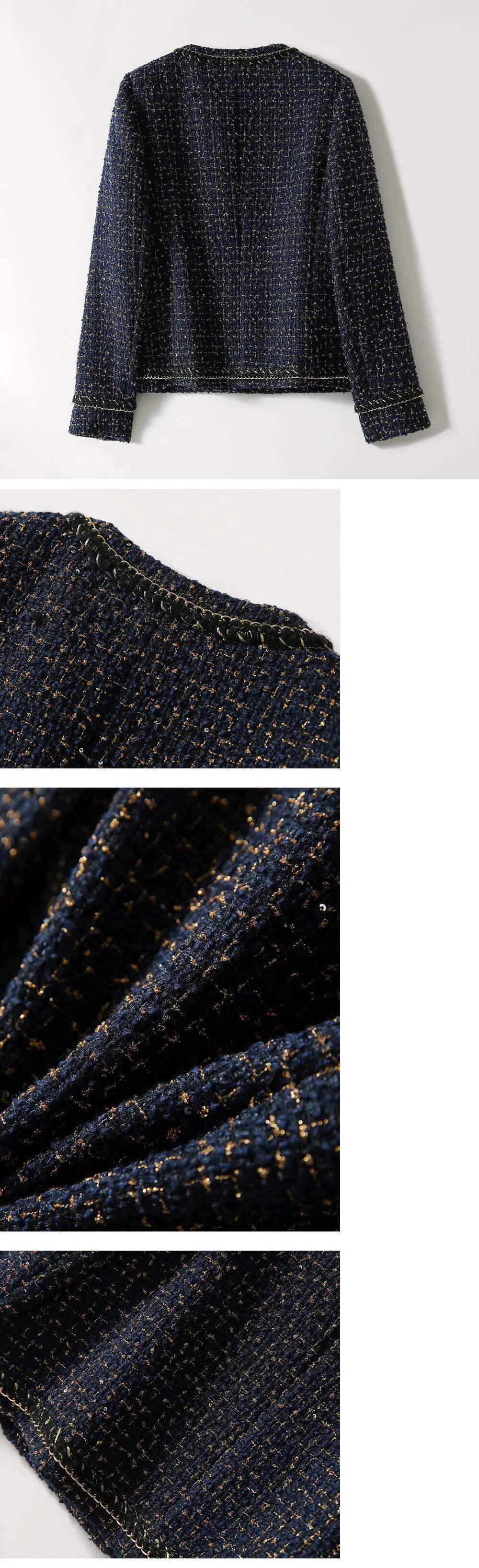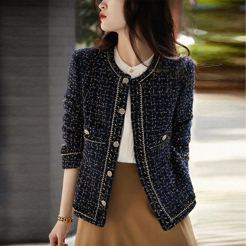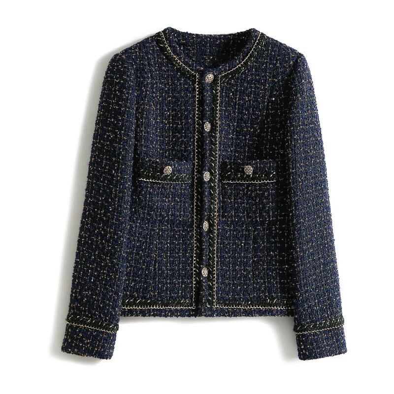 秋冬ショートレトロツイードスーツジャケットラウンドネックオールマッチダークブルーブレザー オータム 秋物 ウィンター 冬物 Oネック