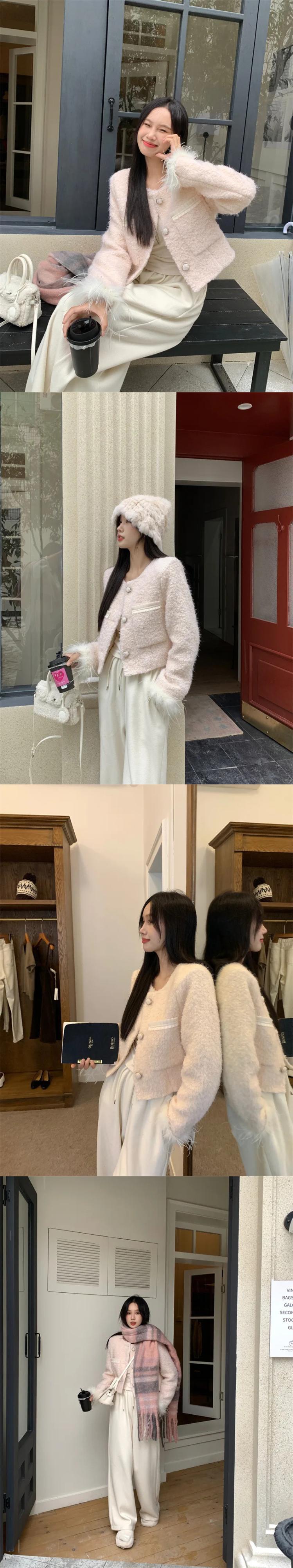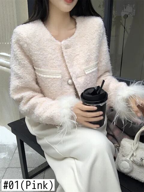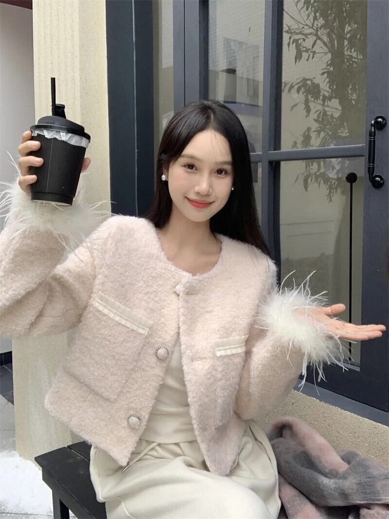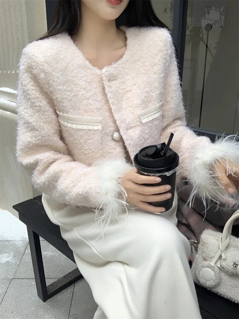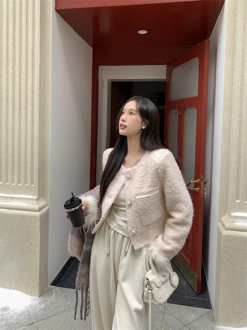 香り風秋冬ウールスプライスショートウールコートピンク甘い生き抜くジャケット 大人ガーリー スウィート キュート カジュアル オータム 秋物 ウィンター 冬物