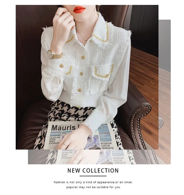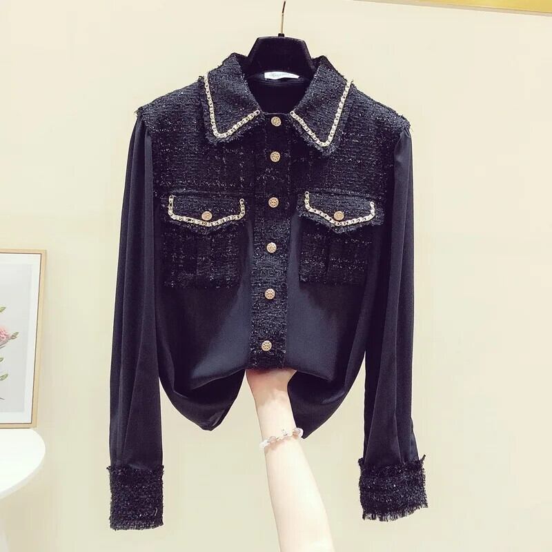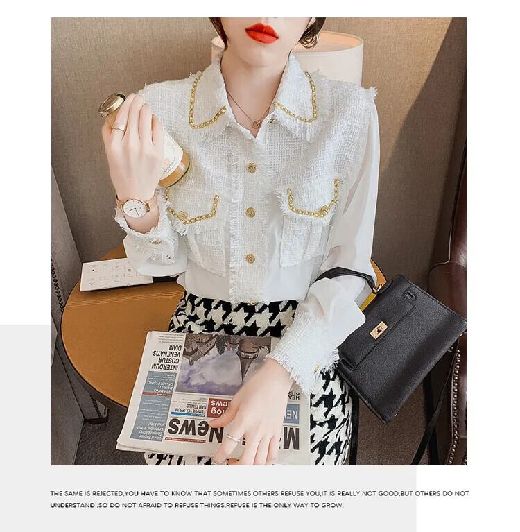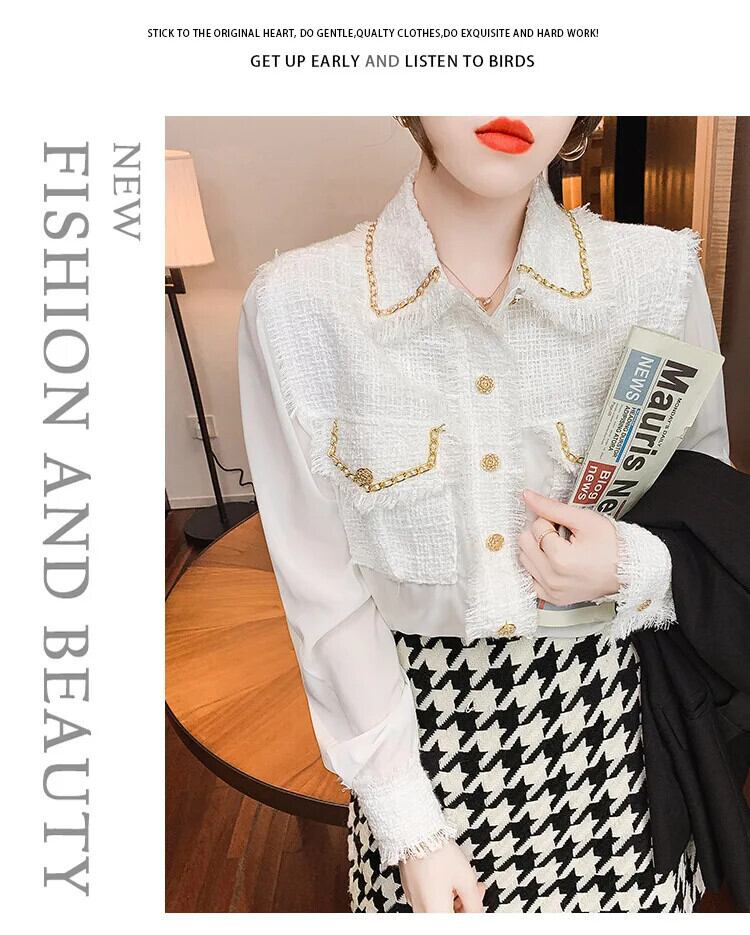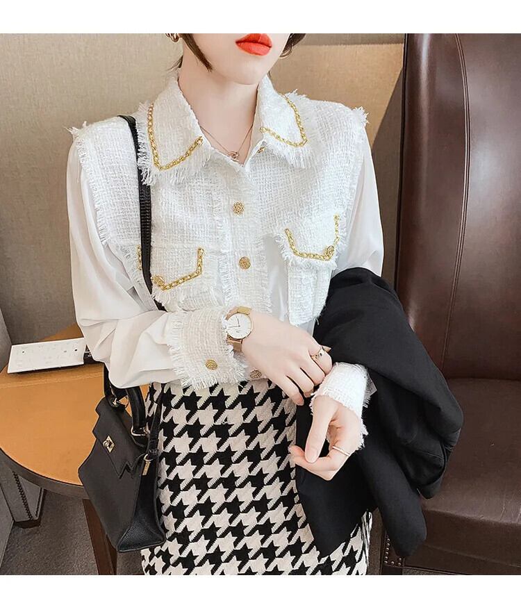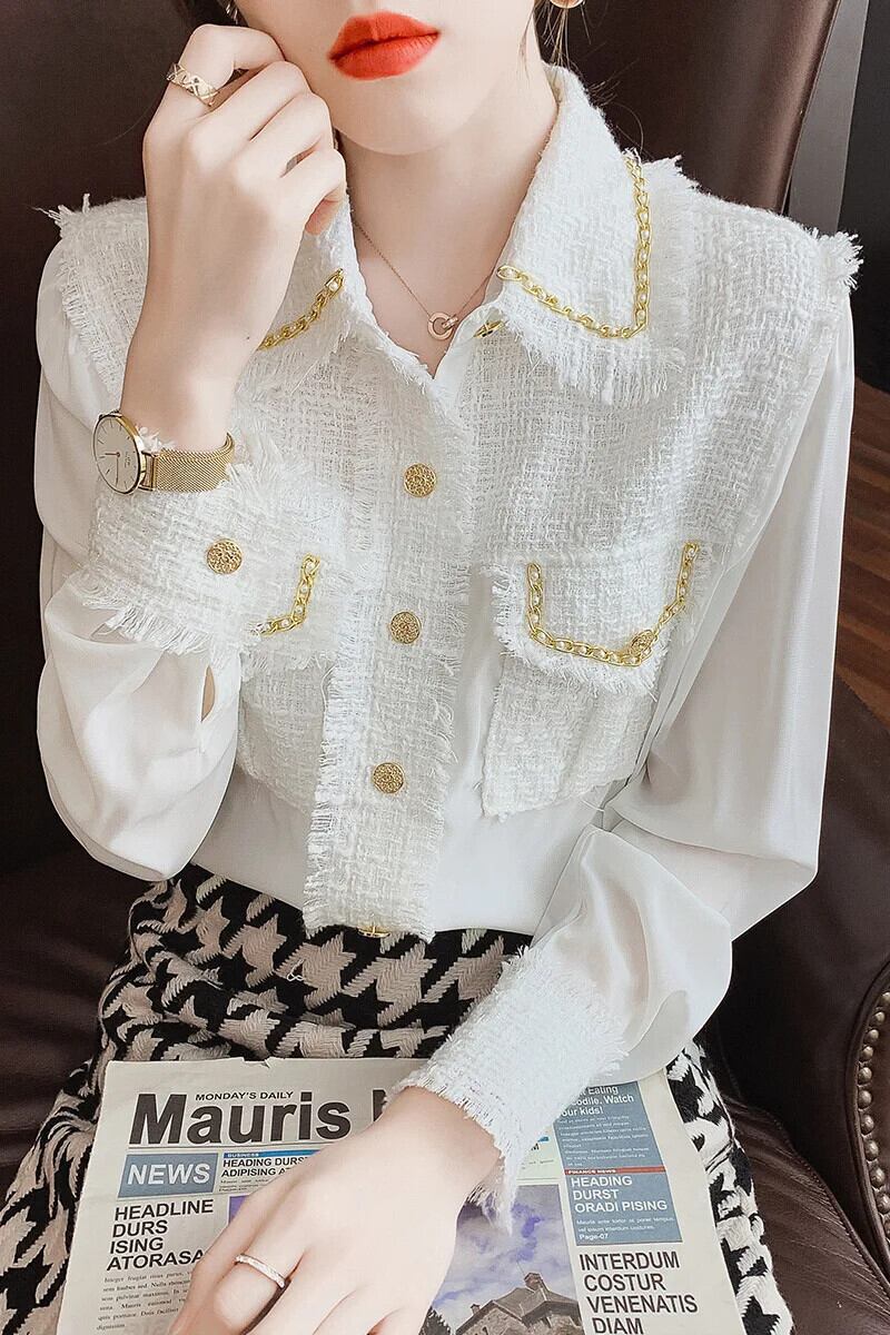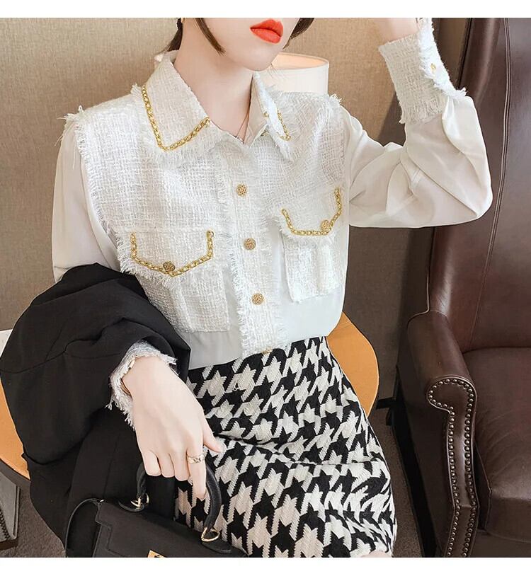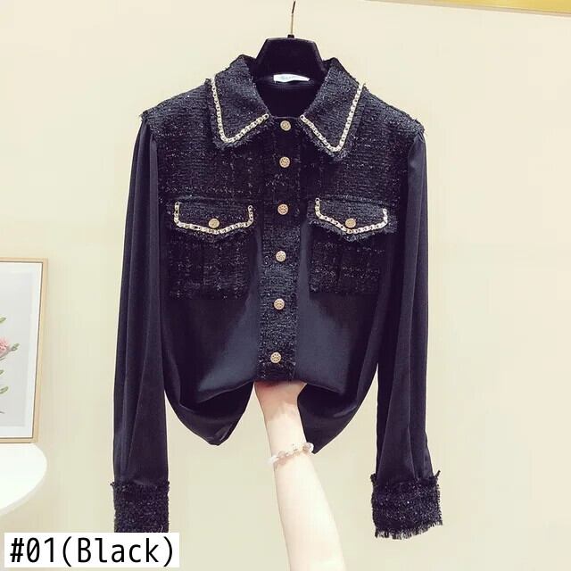 長袖春秋 eign 重工業シフォンスプライシングシック白黒シャツ ロング ホワイト ブラック スプリング 春物 オータム 秋物