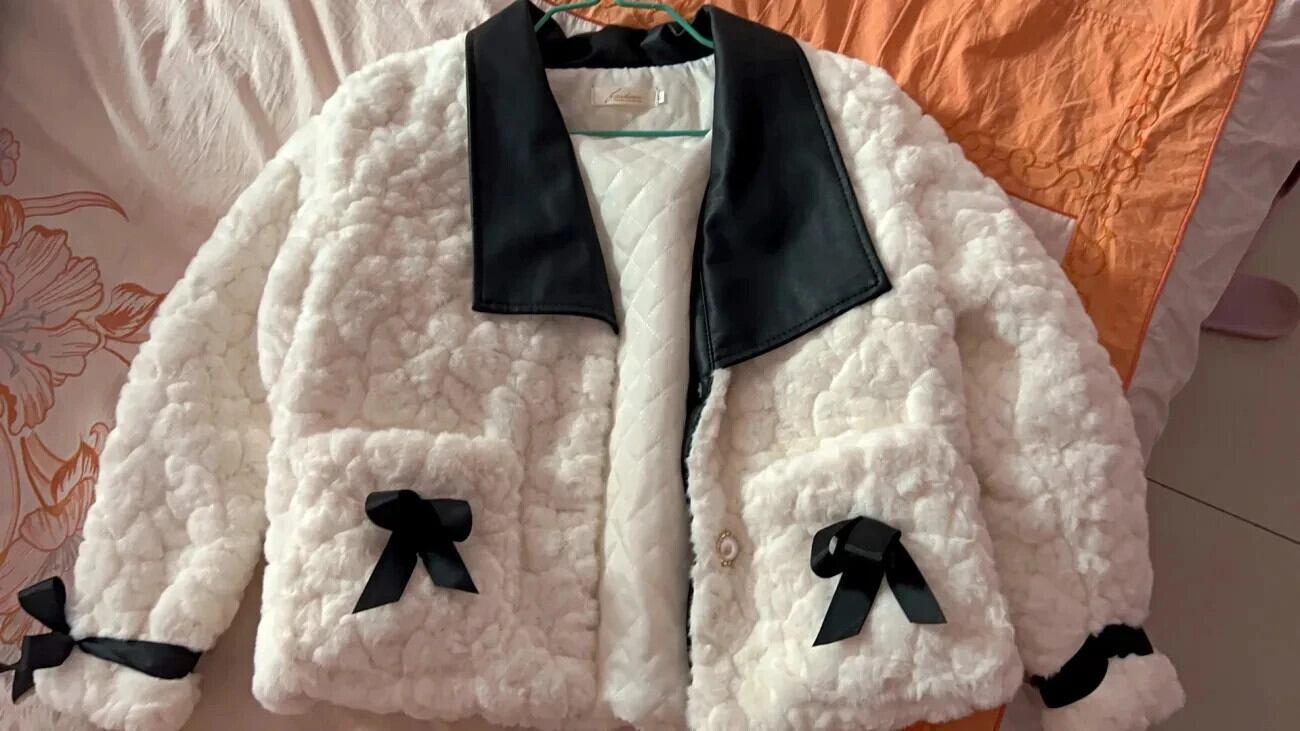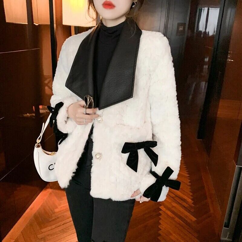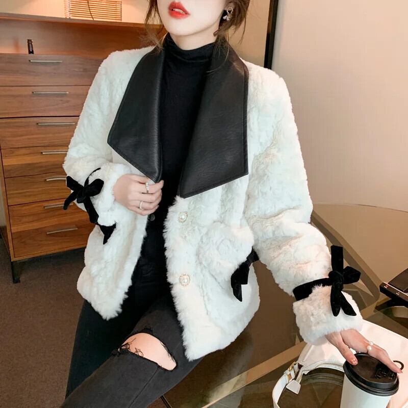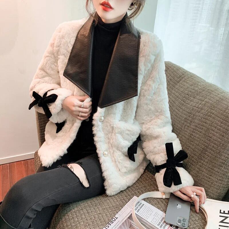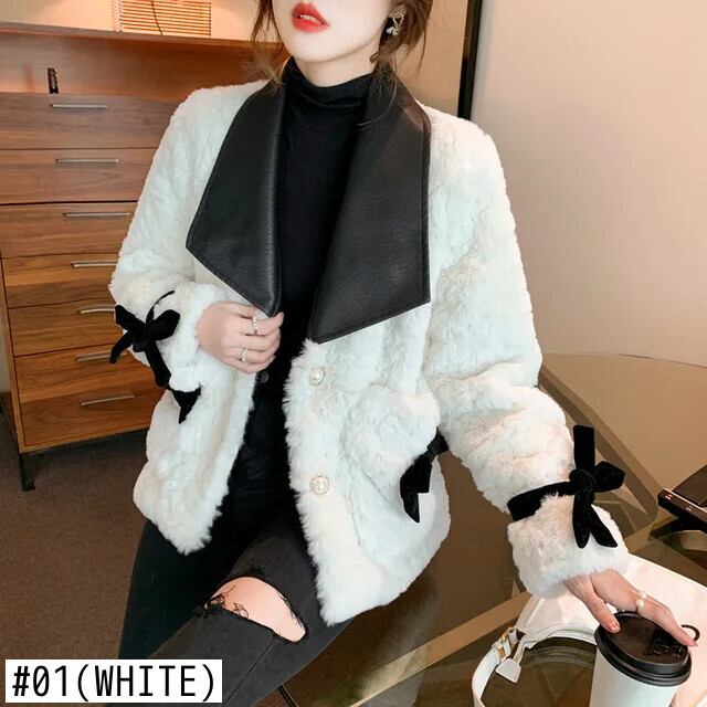 模造ウサギ毛皮コート秋冬ラムベルベット Pu レザーラペル蝶ネクタイ肥厚コットンジャケット リボン オータム 秋物 ウィンター 冬物
