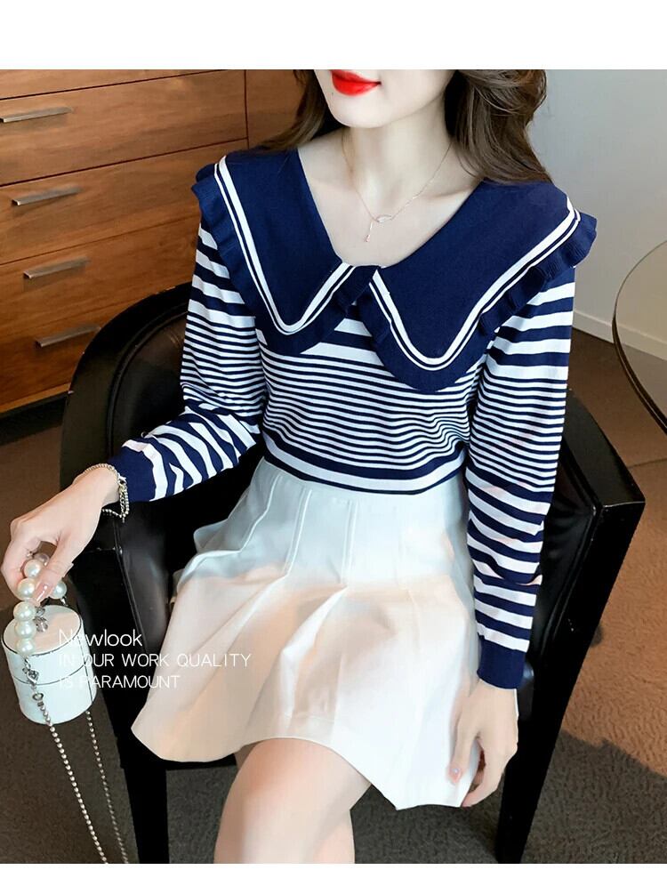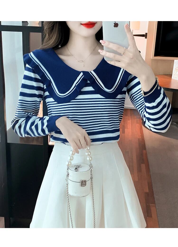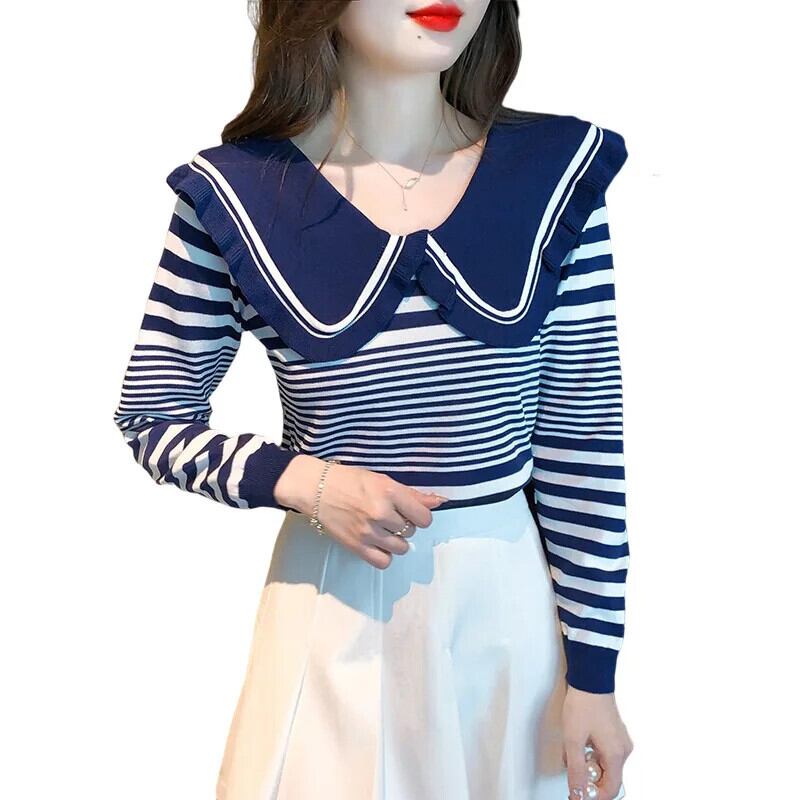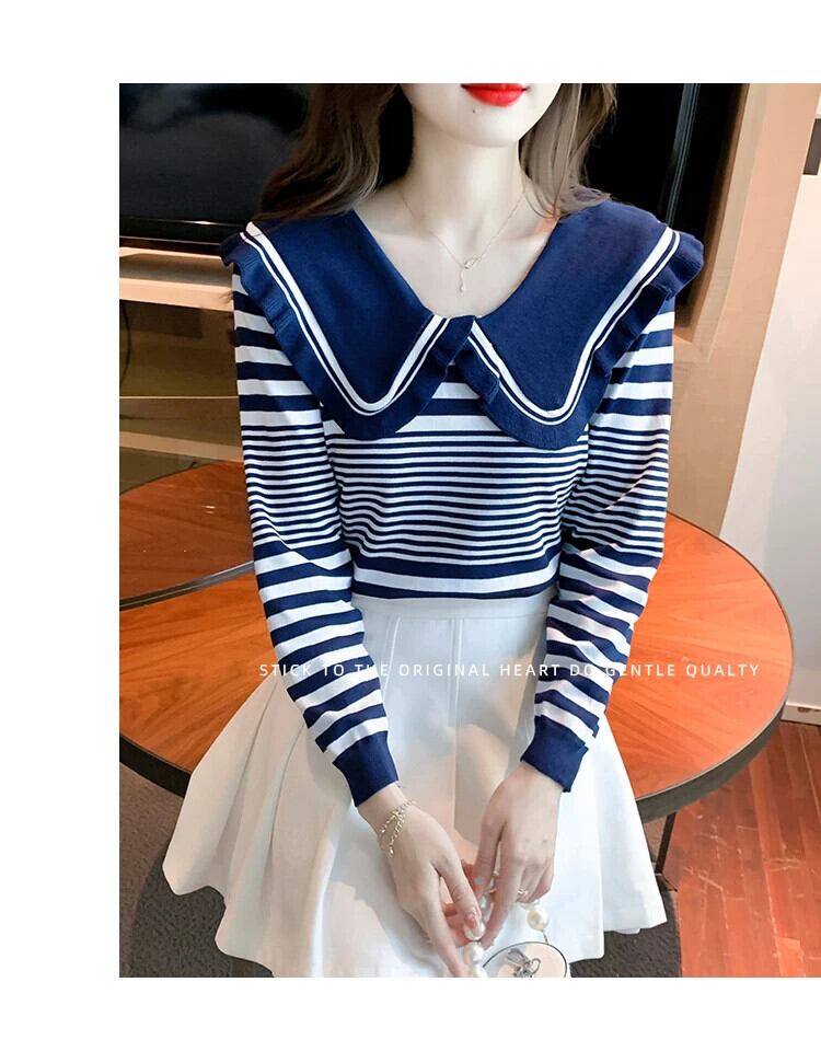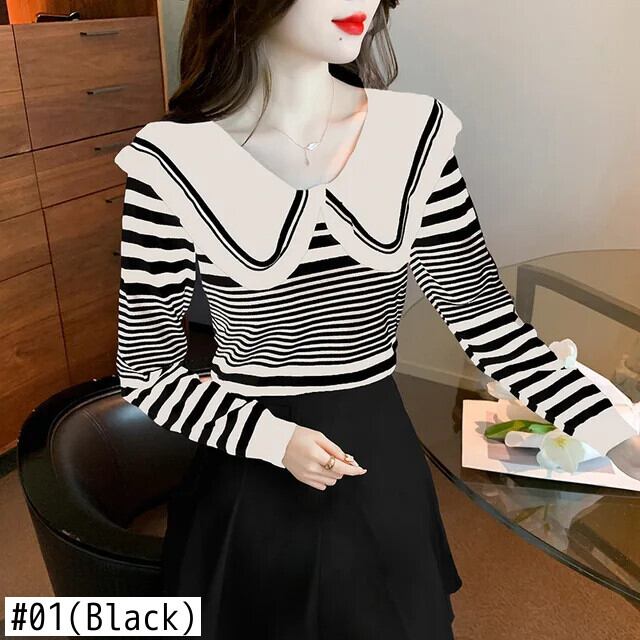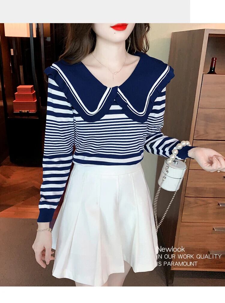 レディース秋ドールネックストライプ長袖ニットセーター甘い ロング 大人ガーリー スウィート キュート カジュアル オータム 秋物