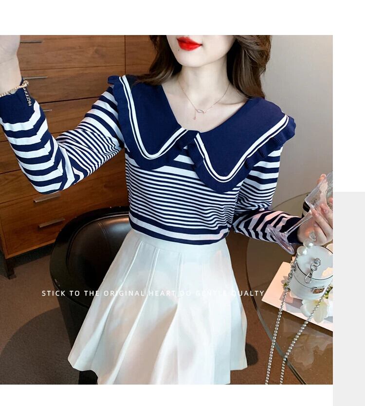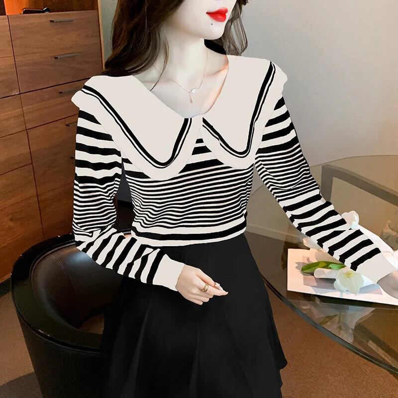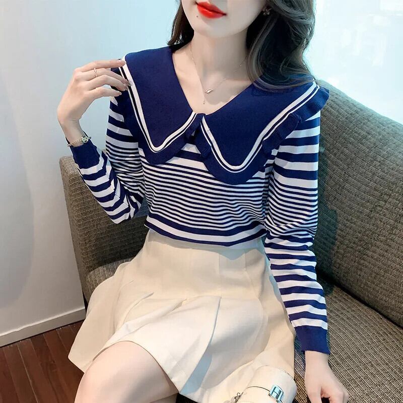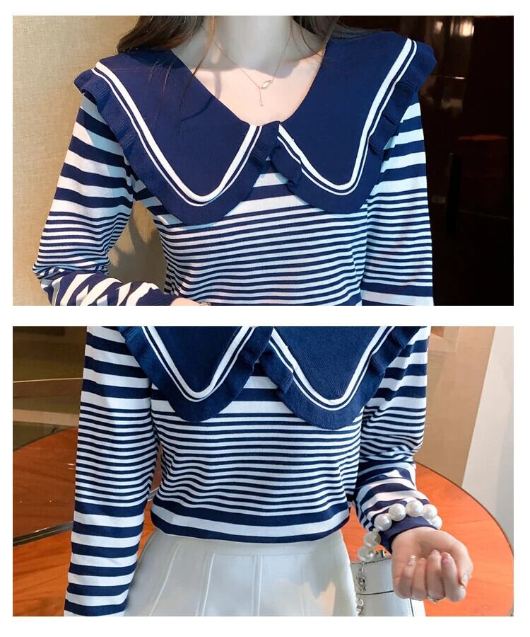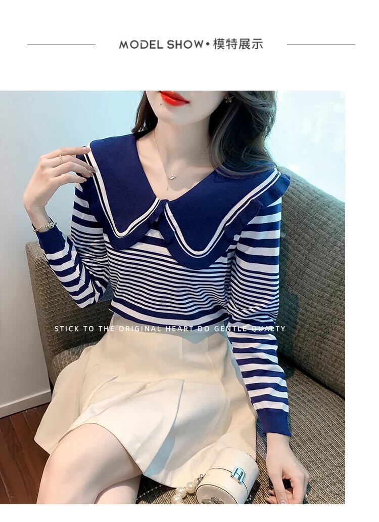 レディース秋ドールネックストライプ長袖ニットセーター甘い ロング 大人ガーリー スウィート キュート カジュアル オータム 秋物