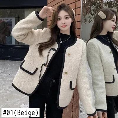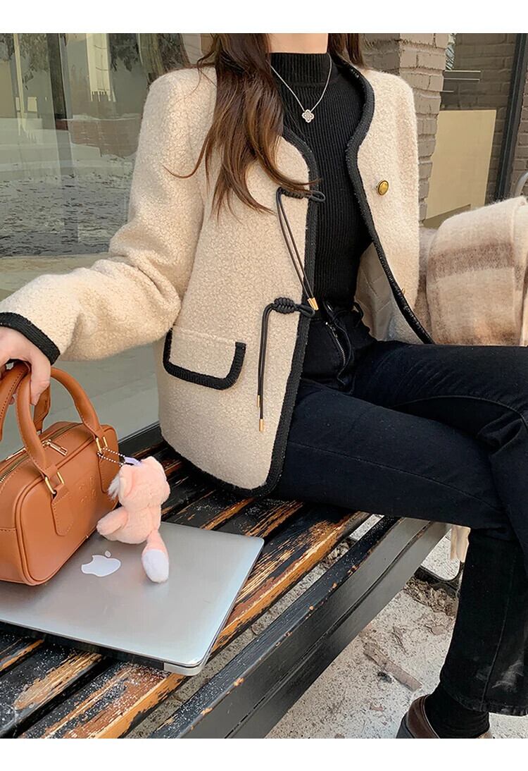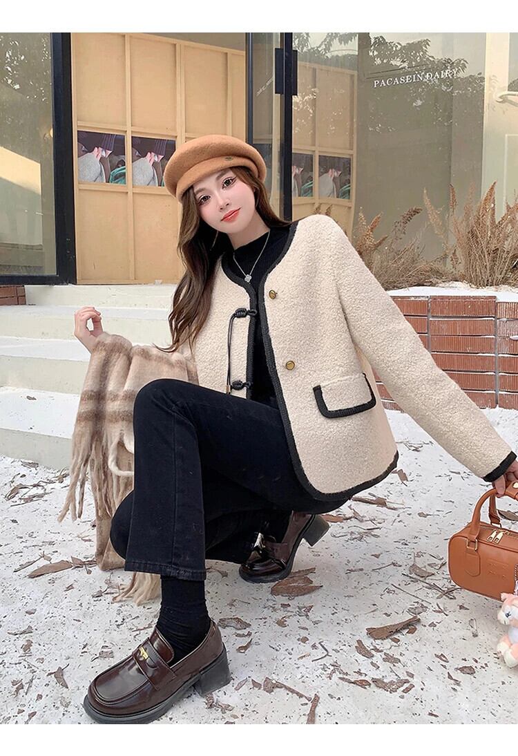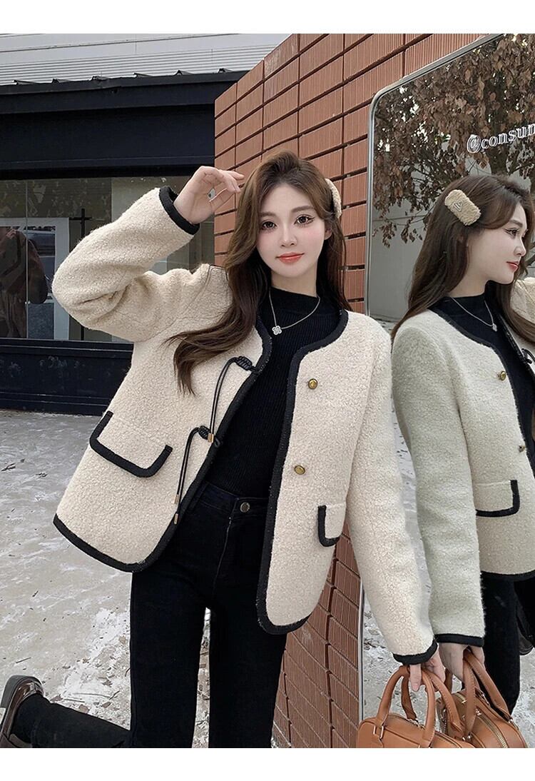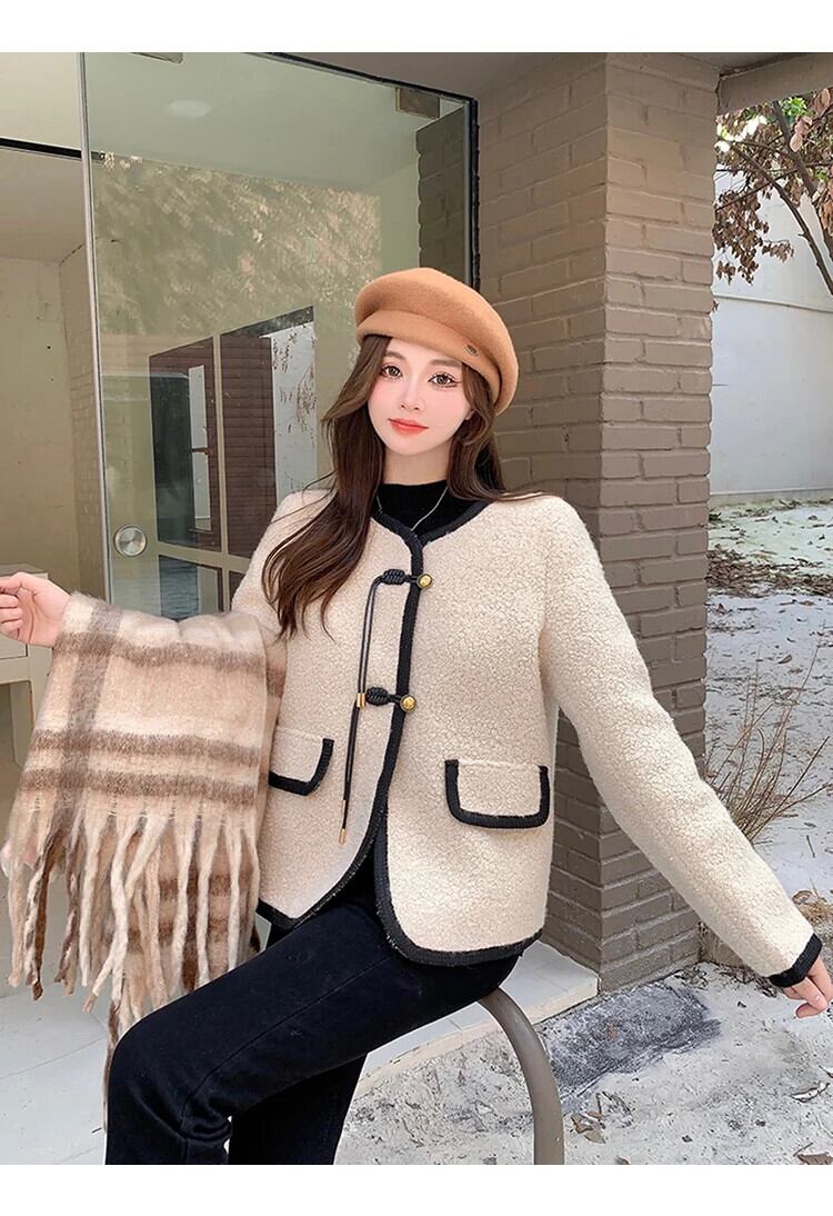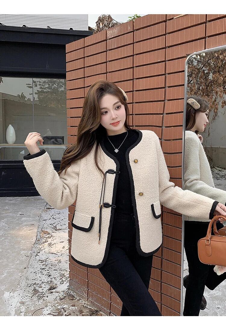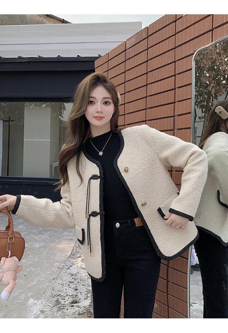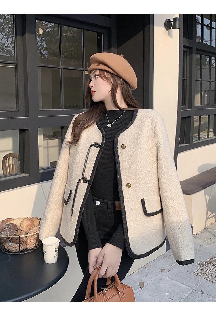 シック秋冬厚く暖かいラムフリースラウンドネックコートボタンジャケット オータム 秋物 ウィンター 冬物 Oネック