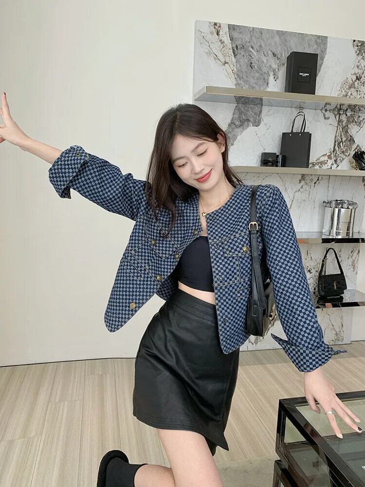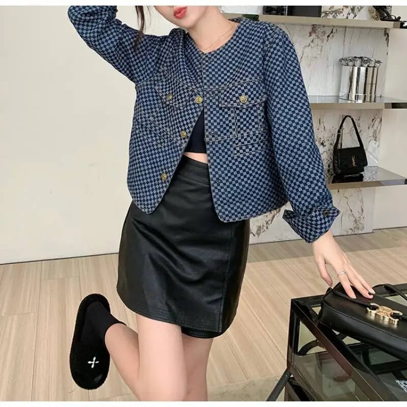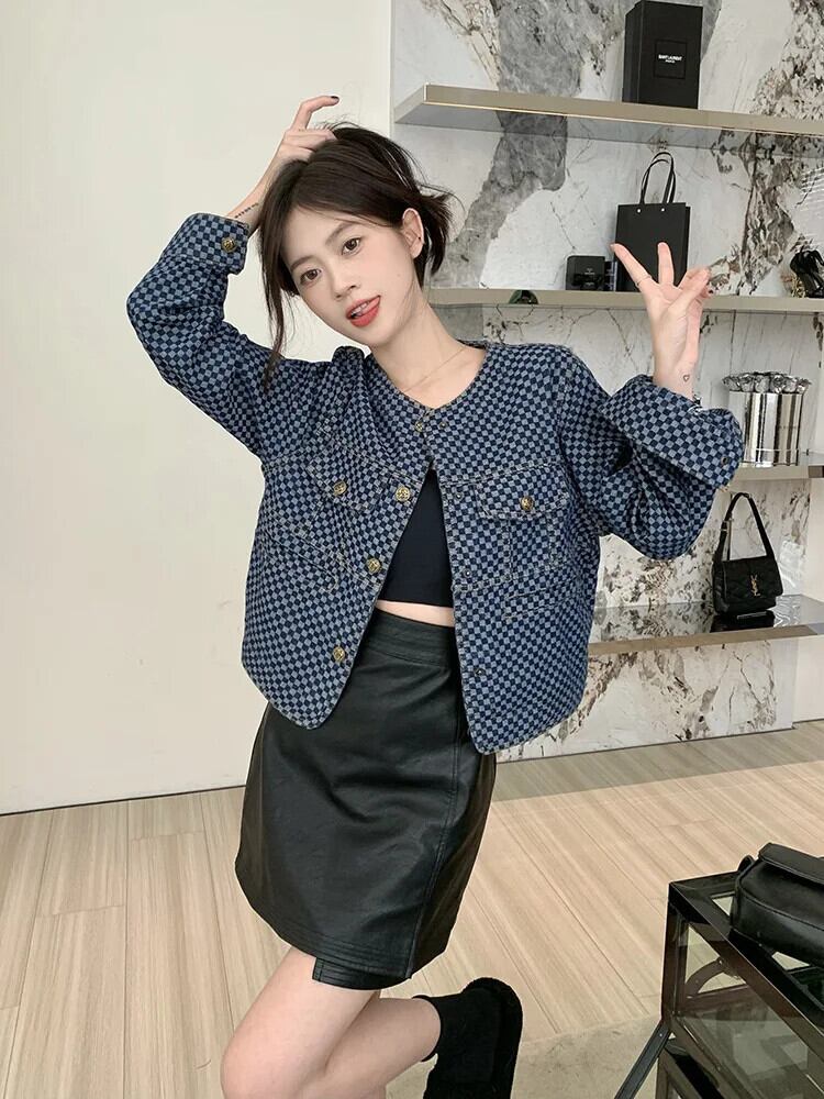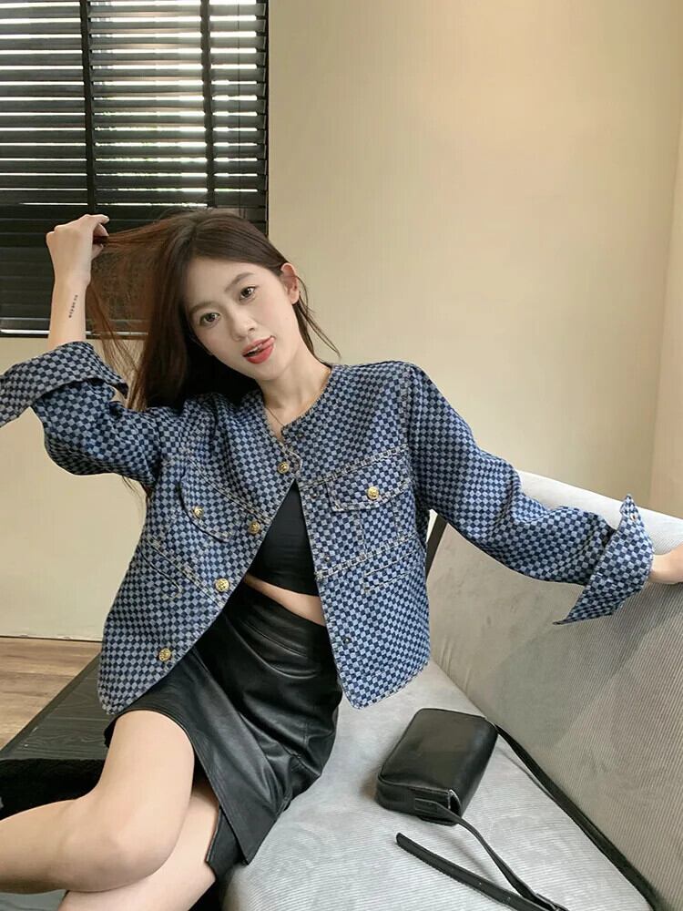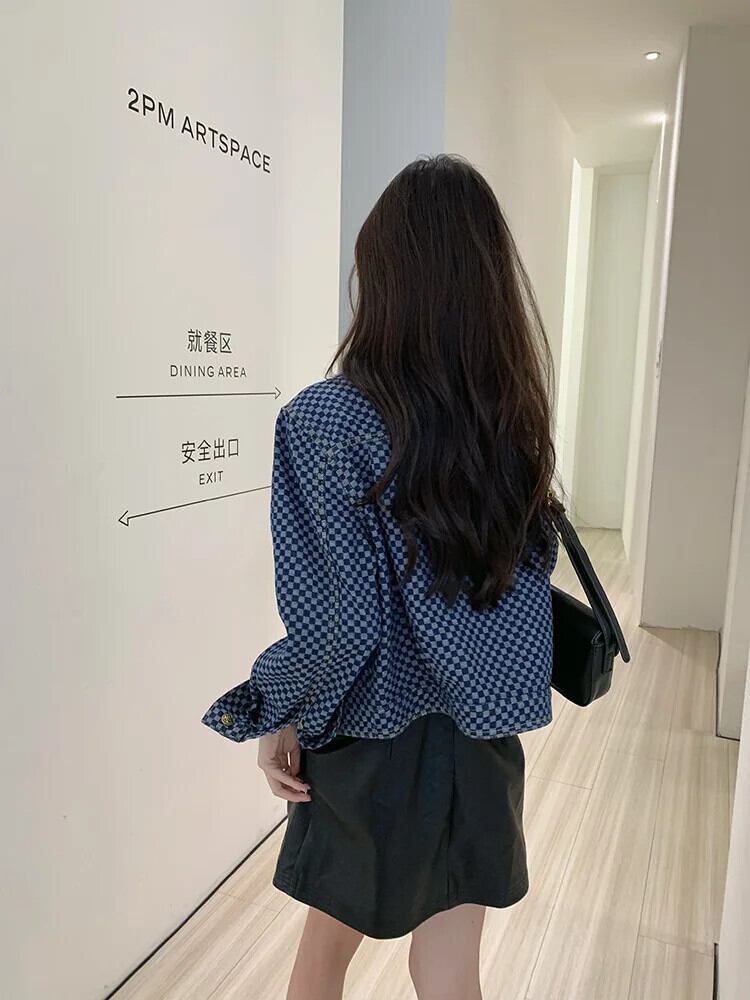 ブルー春と秋チェスボードデニムショートコートカウジャケット スプリング 春物 オータム 秋物