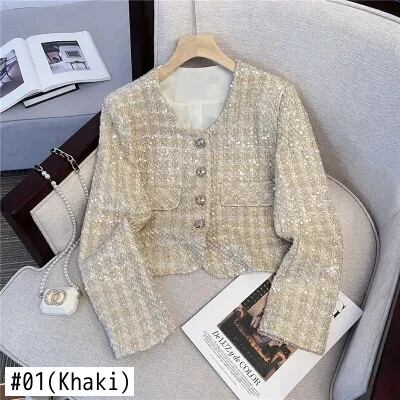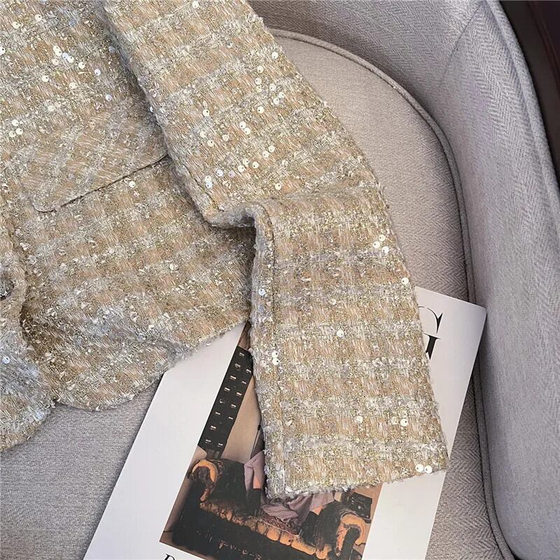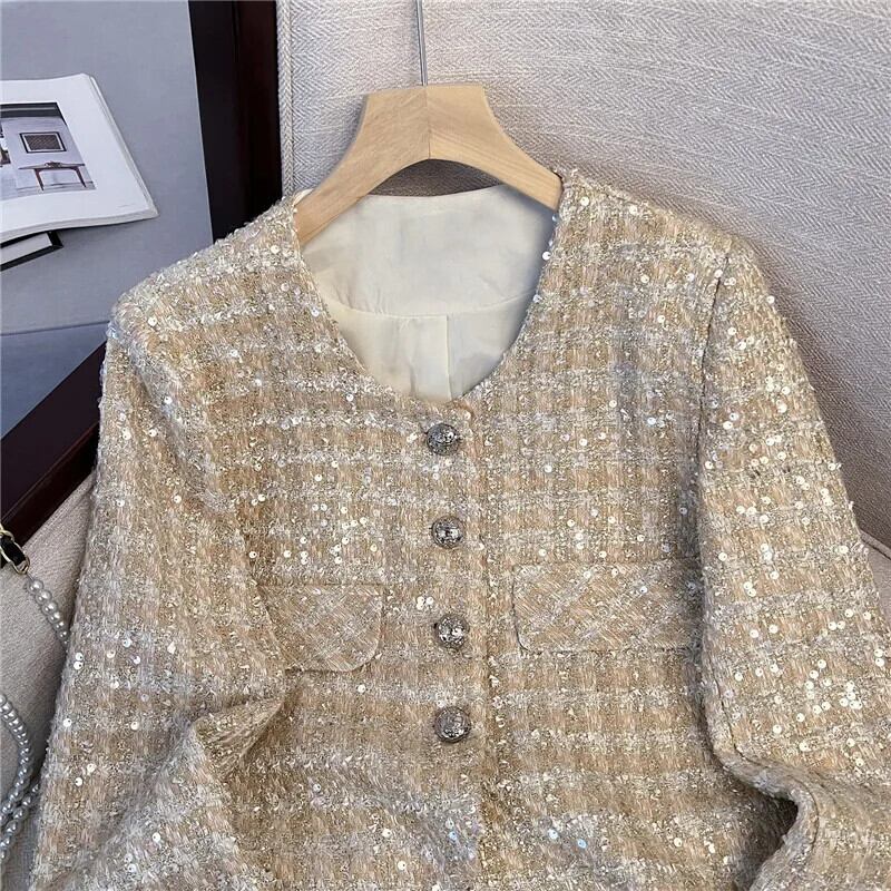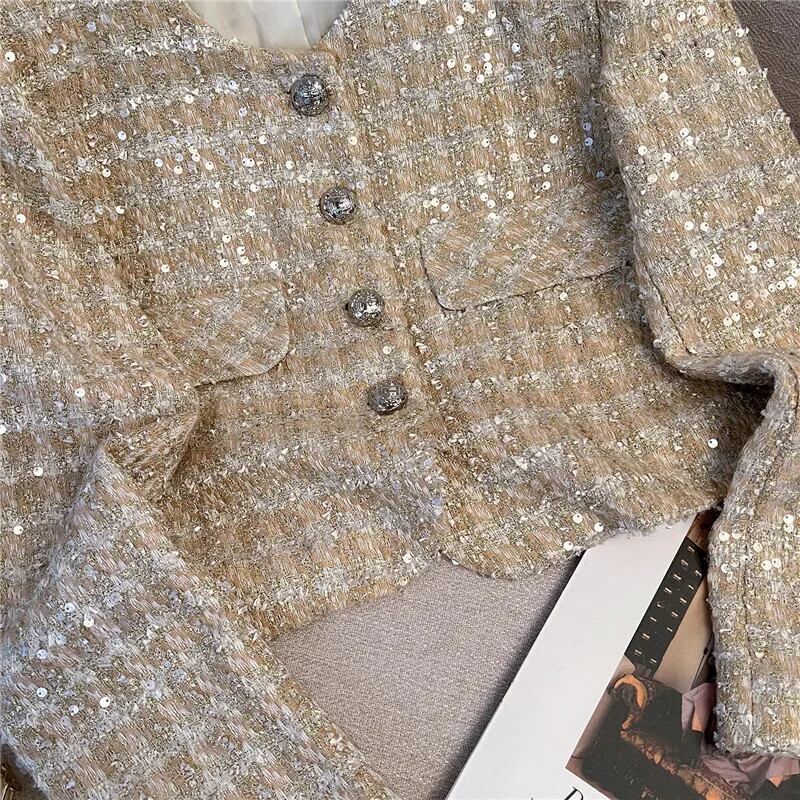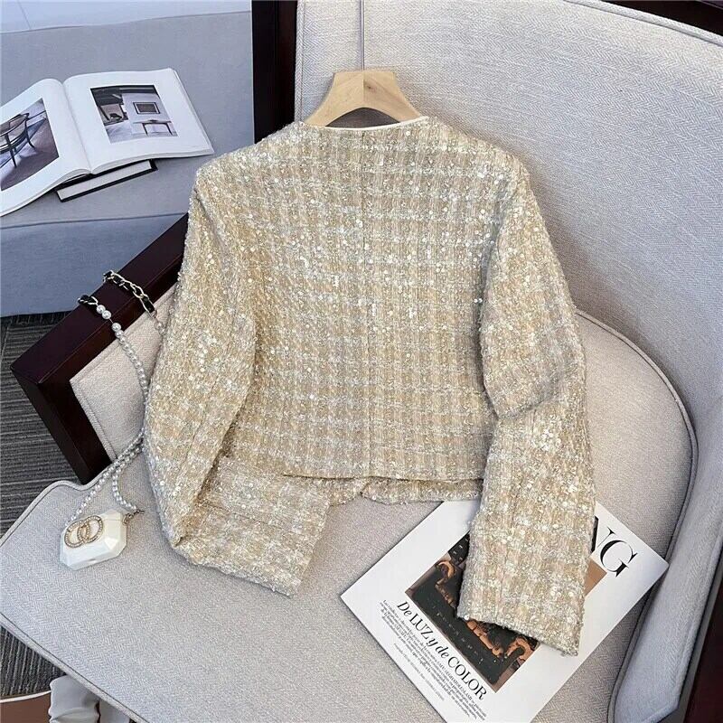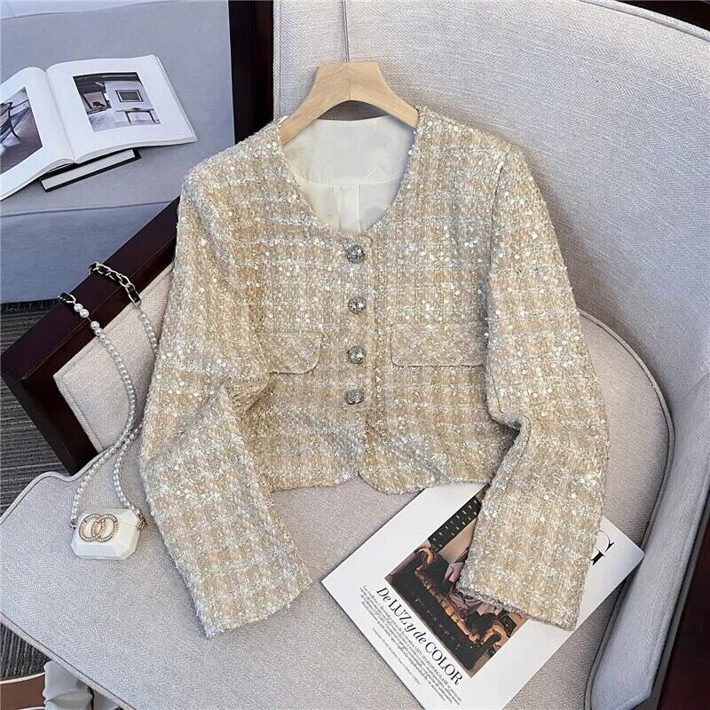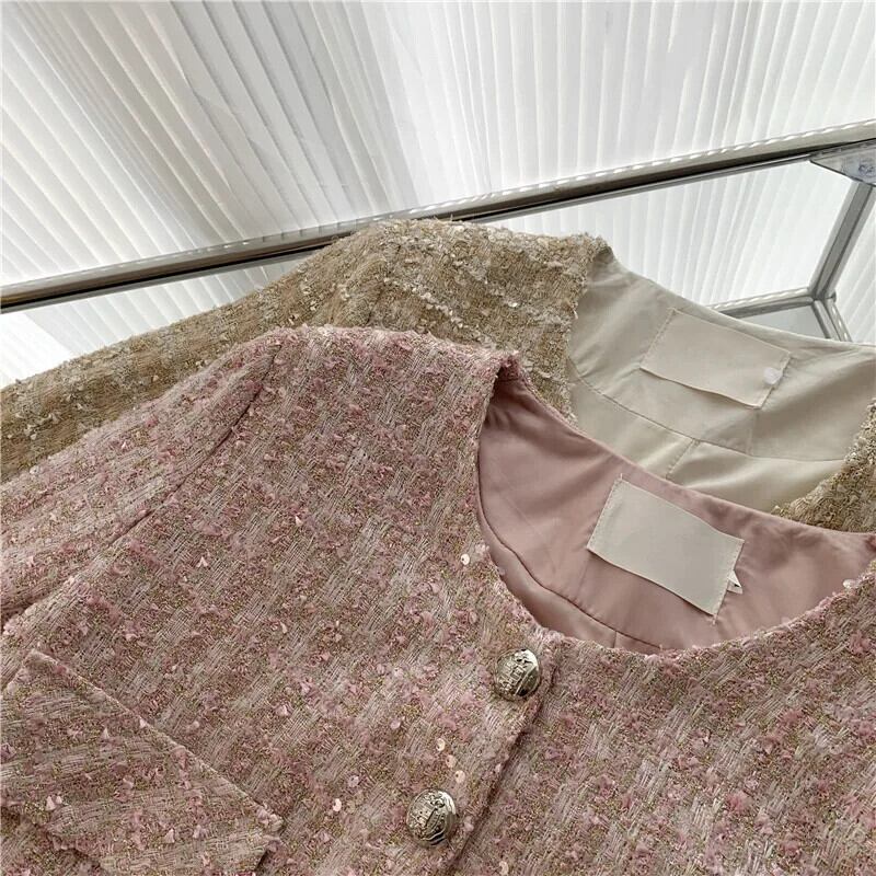 秋気質ビーズラウンドネック香りショートコートピンクアプリコットスパンコールパーティージャケット オータム 秋物 Oネック