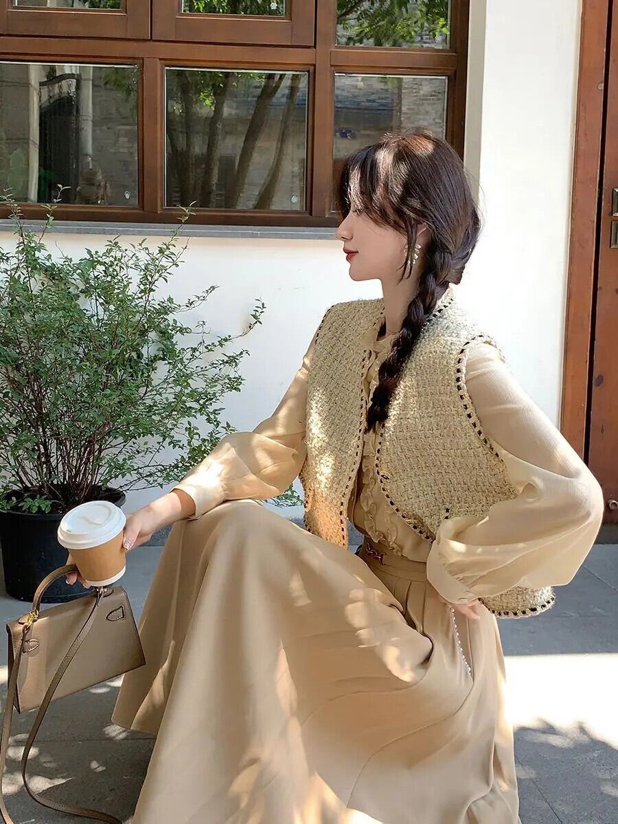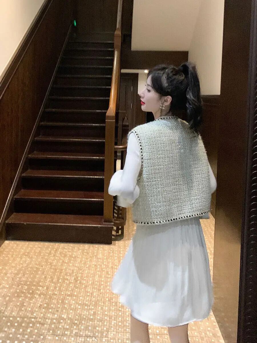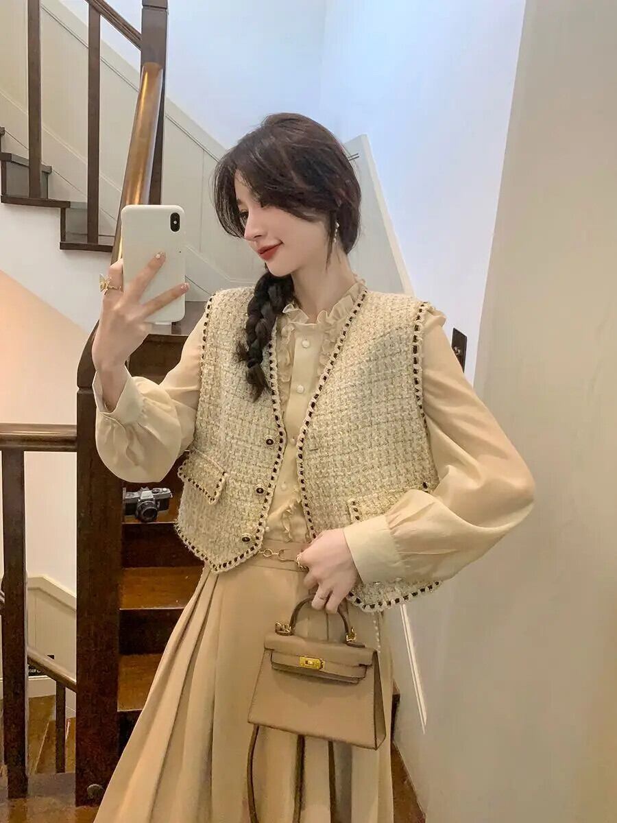 レディース秋冬アウターショートツイードベスト気質Vネックコートスリムチョッキ オータム 秋物 ウィンター 冬物