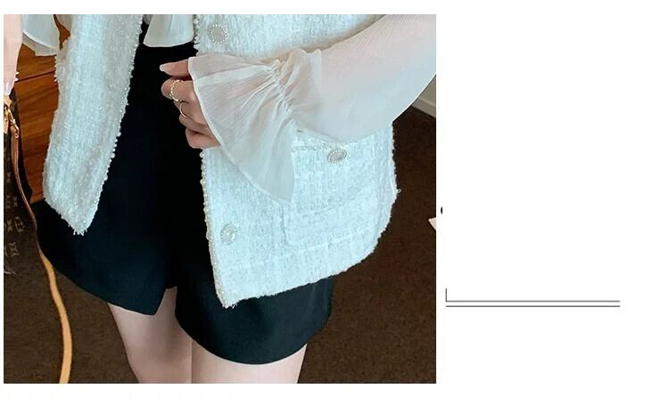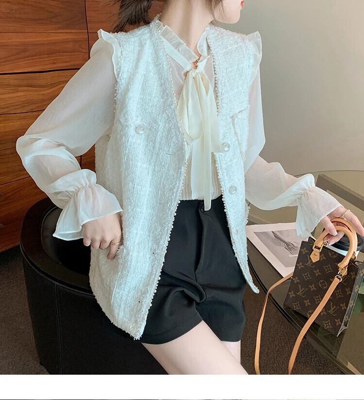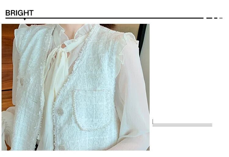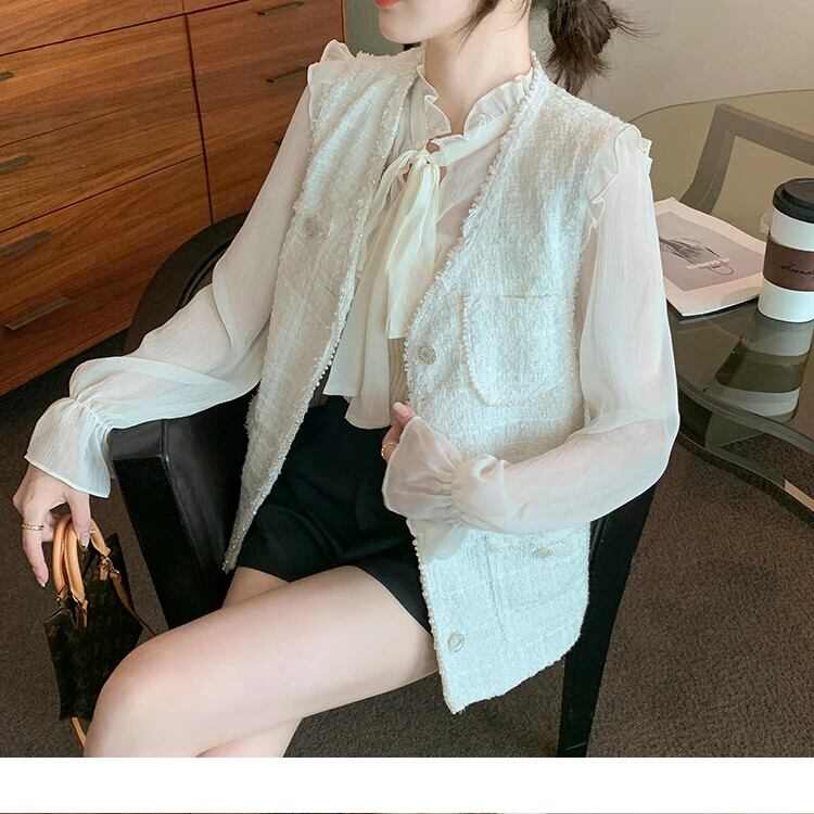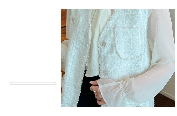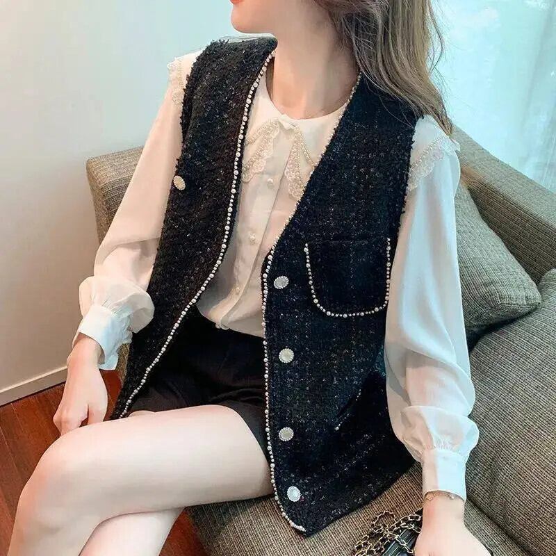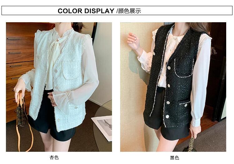 白黒ツイードベストコート春秋緩い気質 V ネックチョッキ ホワイト ブラック スプリング 春物 オータム 秋物 Vネック