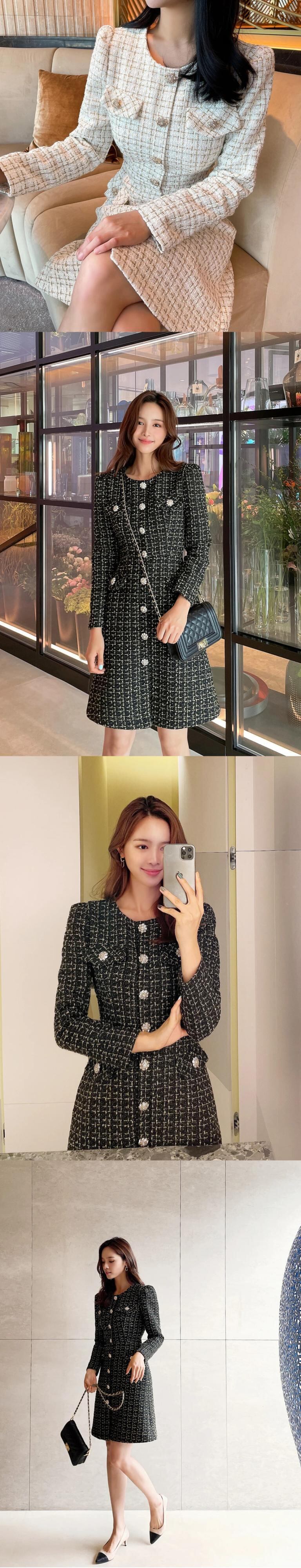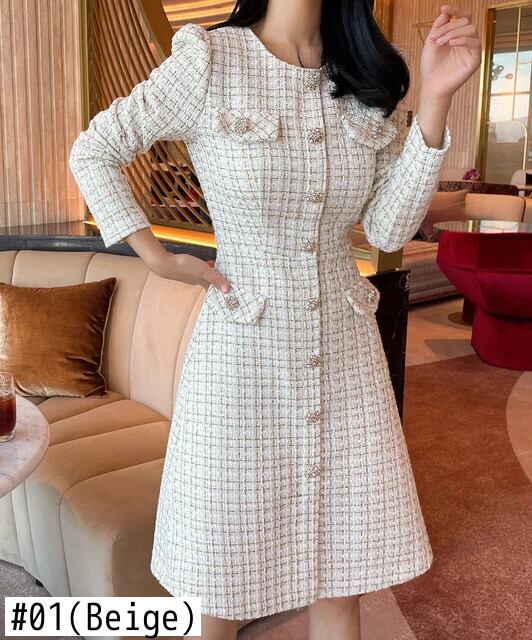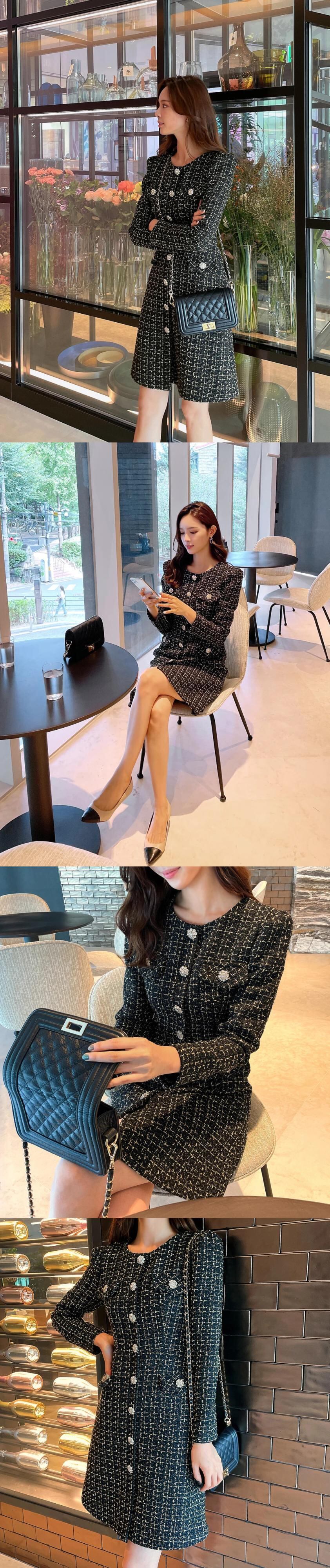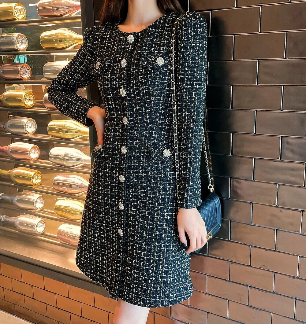 春秋スリムフィット長袖厚手ツイード香りシックドレス ロング スプリング 春物 オータム 秋物