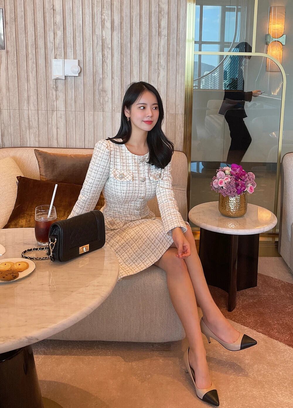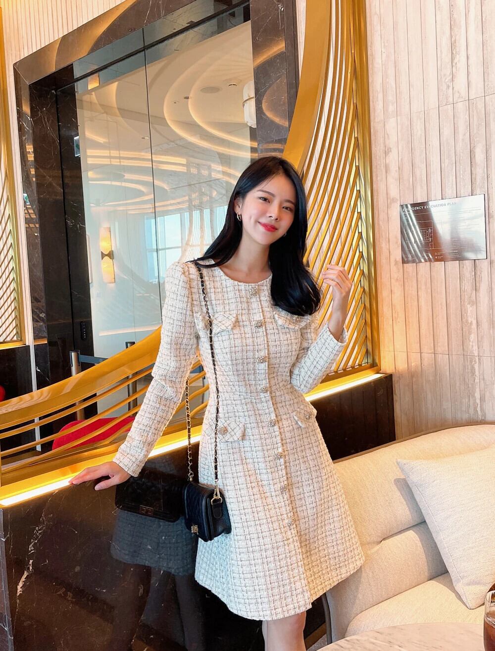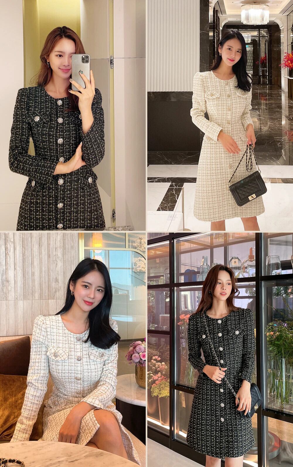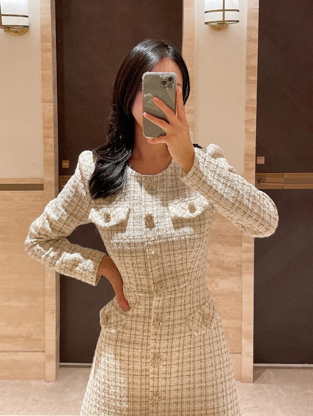 春秋スリムフィット長袖厚手ツイード香りシックドレス ロング スプリング 春物 オータム 秋物