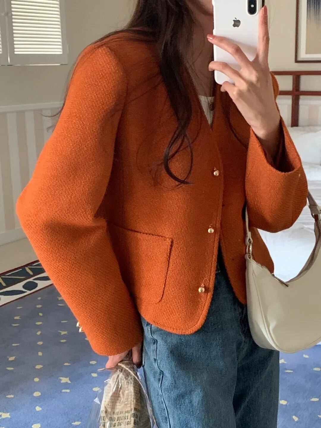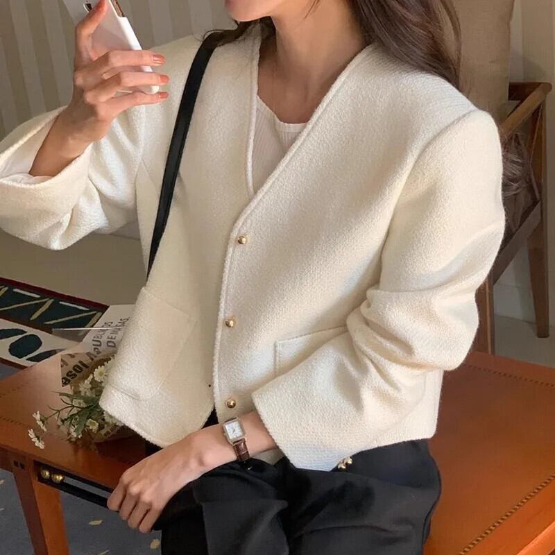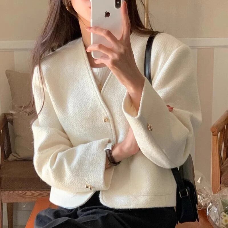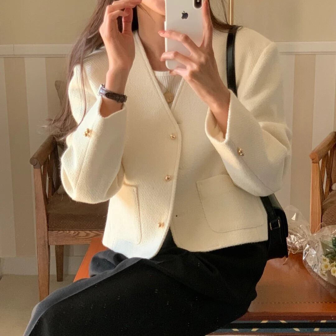 シック秋/冬レトロ香り V ネックシングルブレストルーズ長袖厚手ツイードコートジャケット ロング オータム 秋物 ウィンター 冬物 Vネック