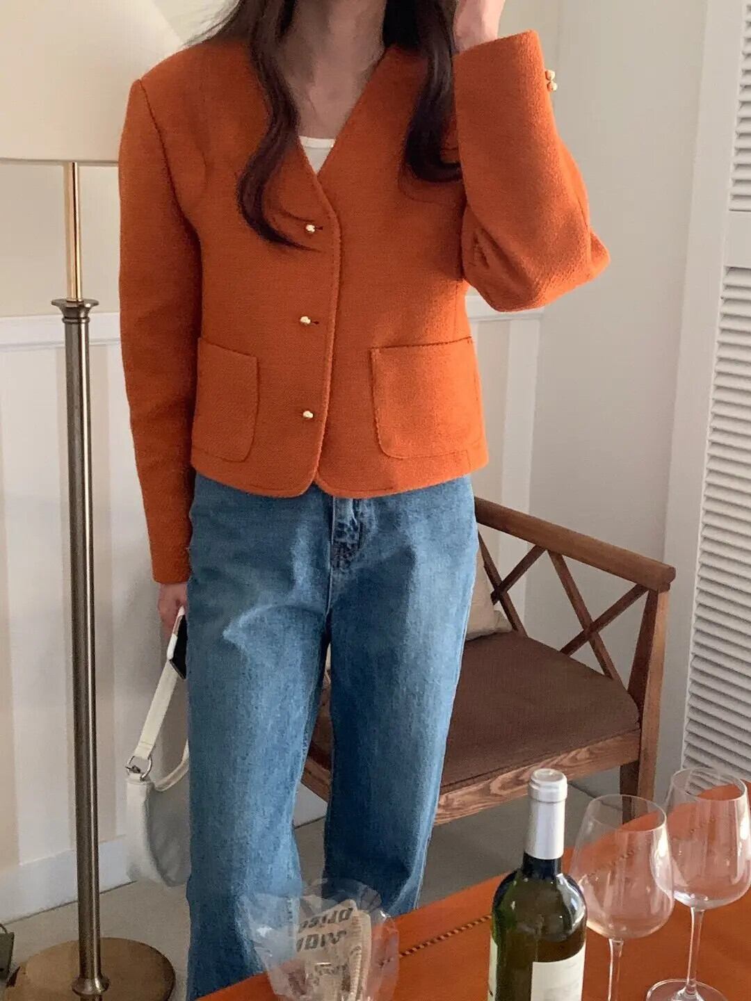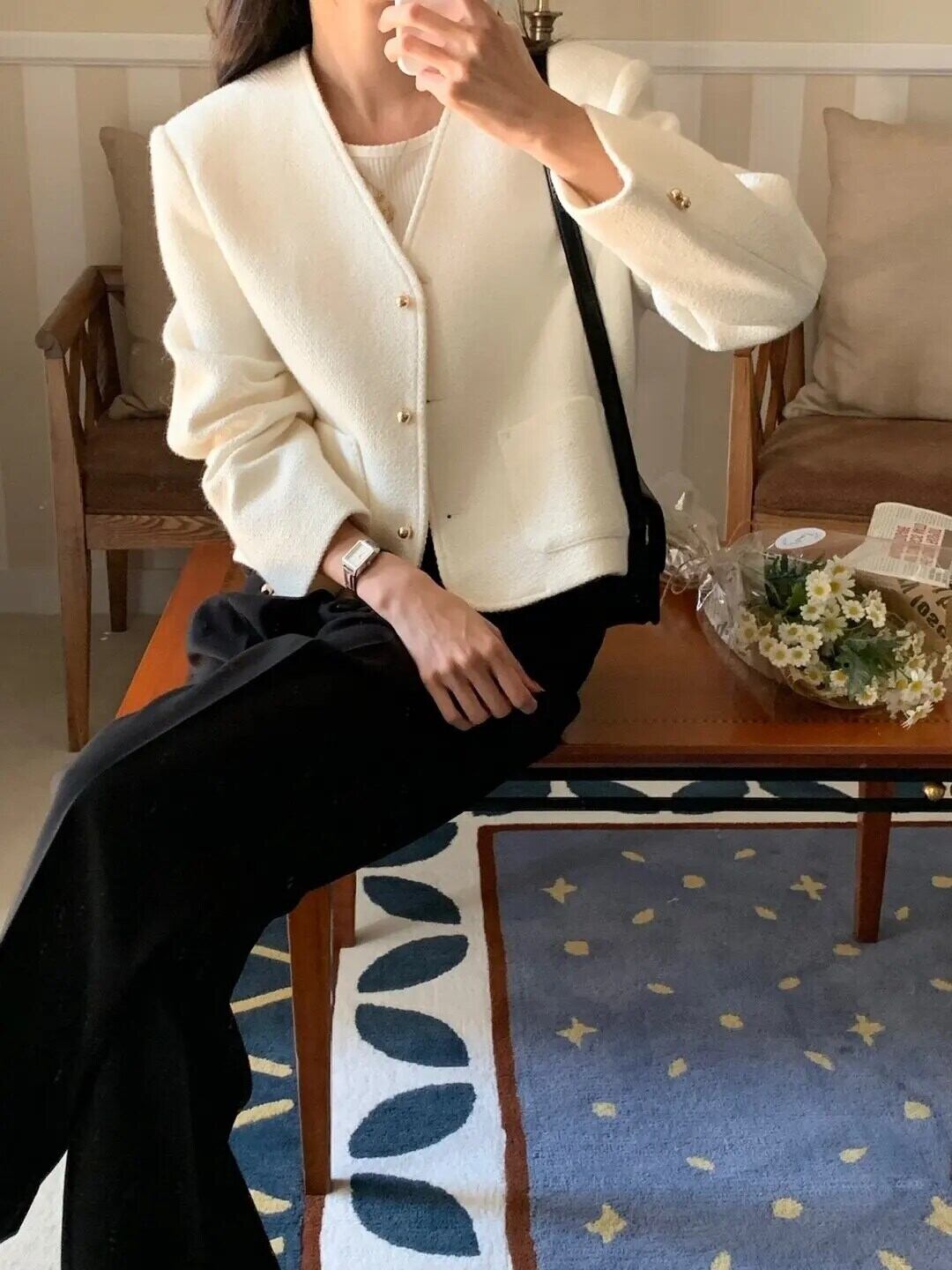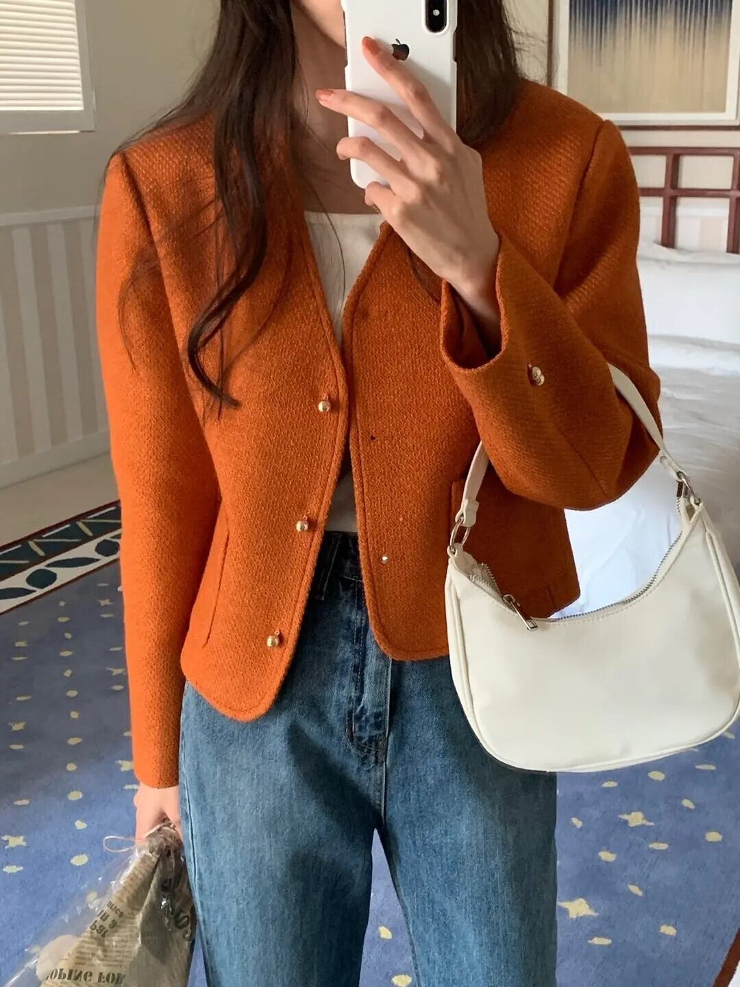シック秋/冬レトロ香り V ネックシングルブレストルーズ長袖厚手ツイードコートジャケット ロング オータム 秋物 ウィンター 冬物 Vネック