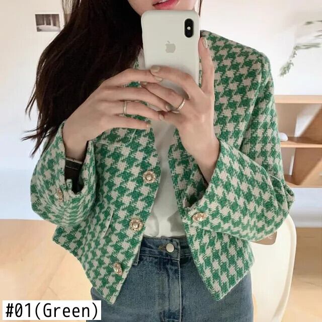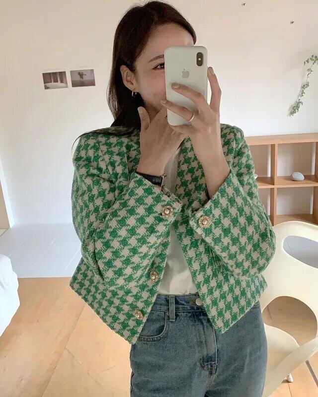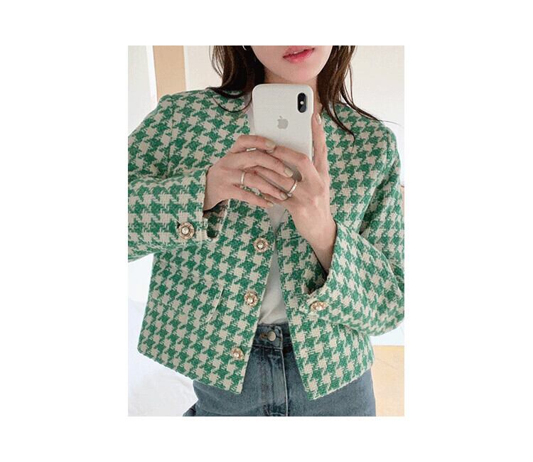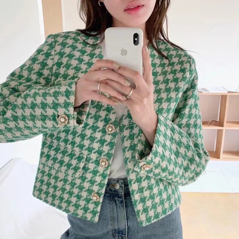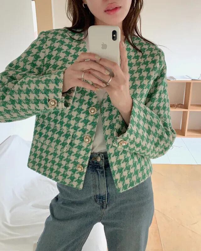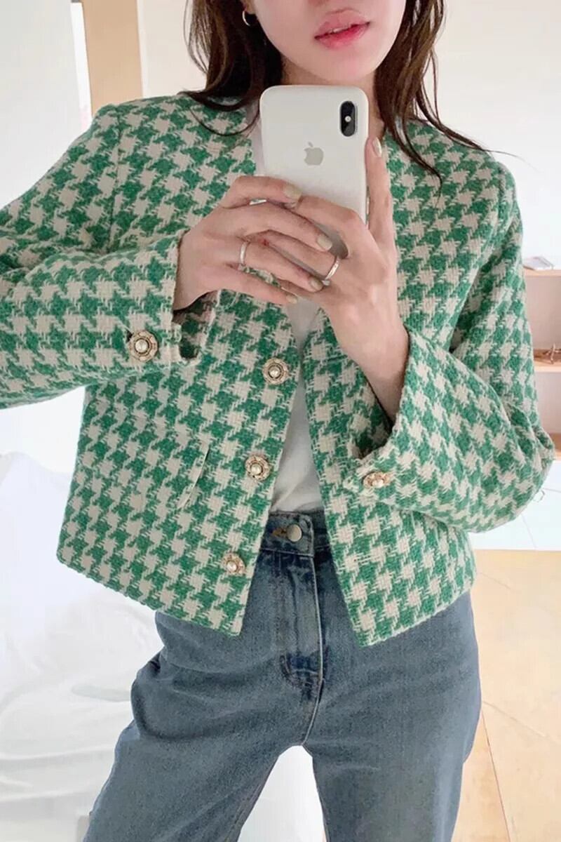 秋気質 V ネックシックパールバックル長袖チェック柄ショートジャケットグリーンコート ロング オータム 秋物 Vネック 真珠