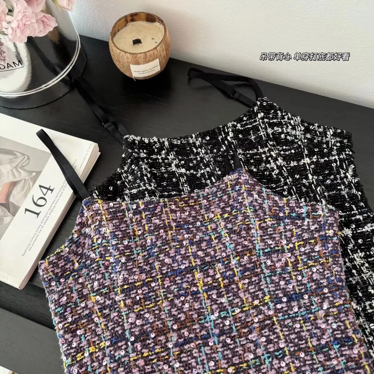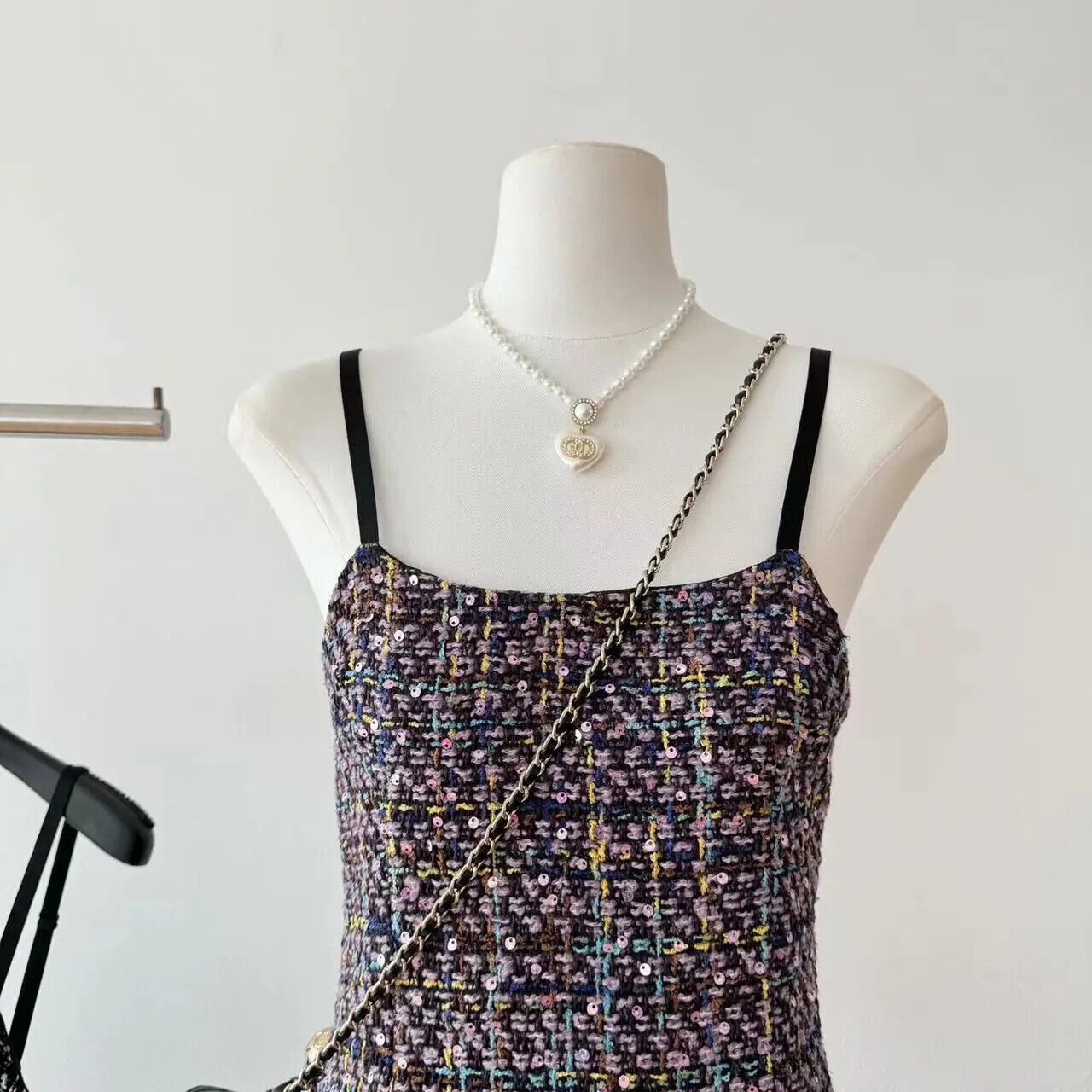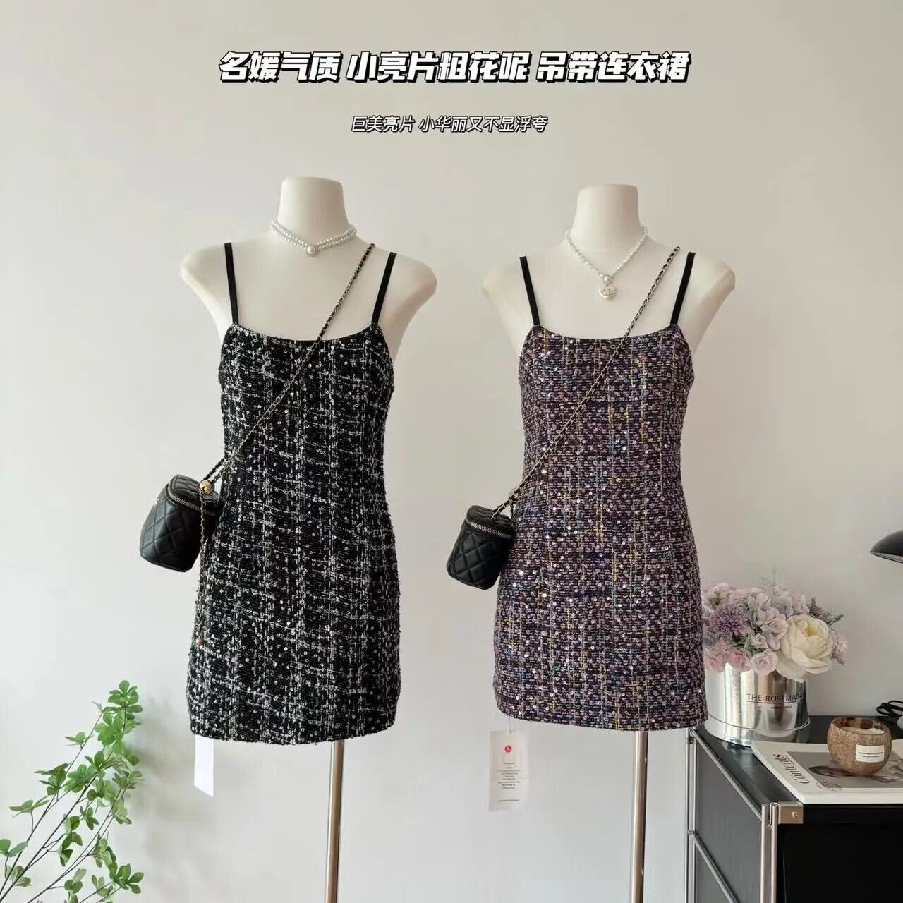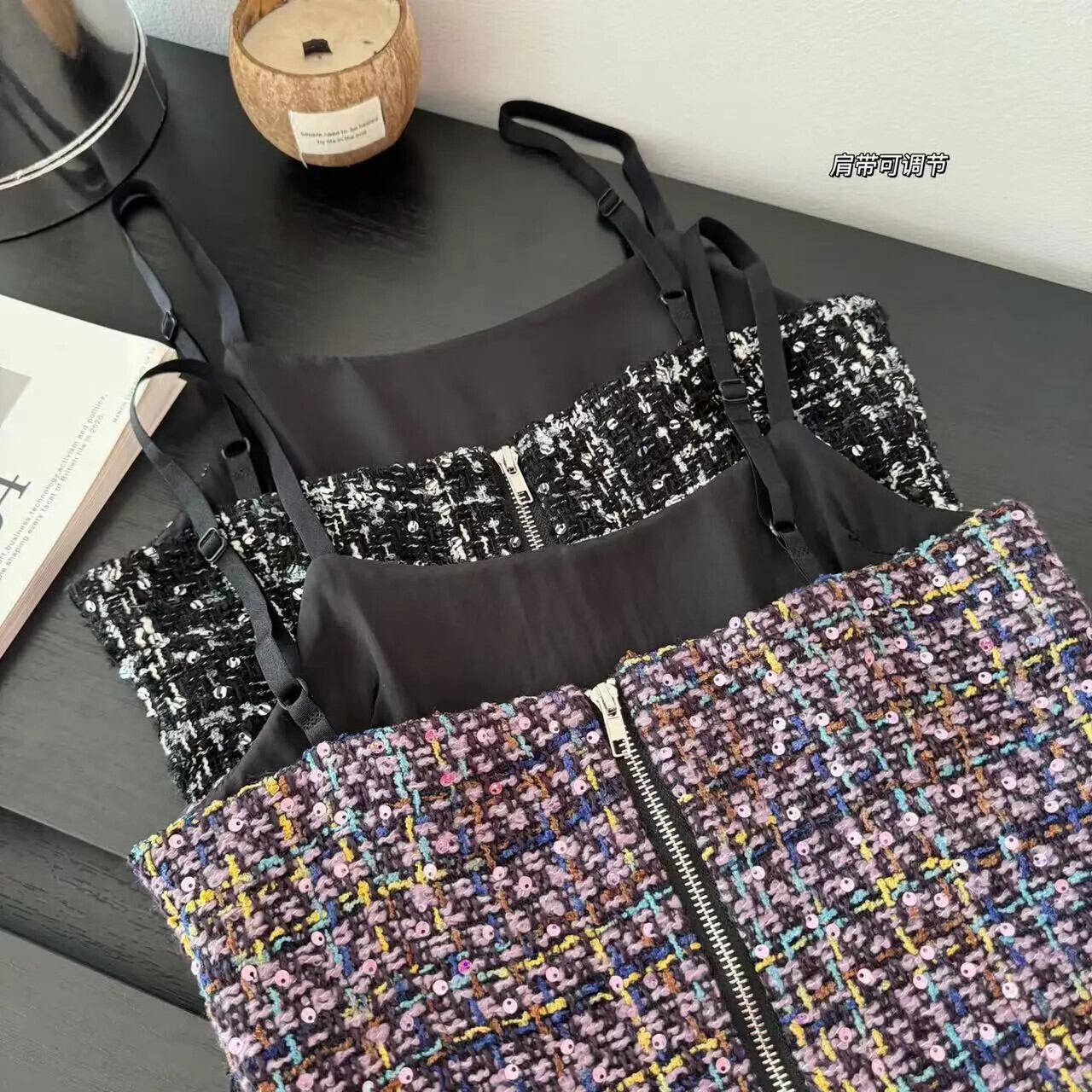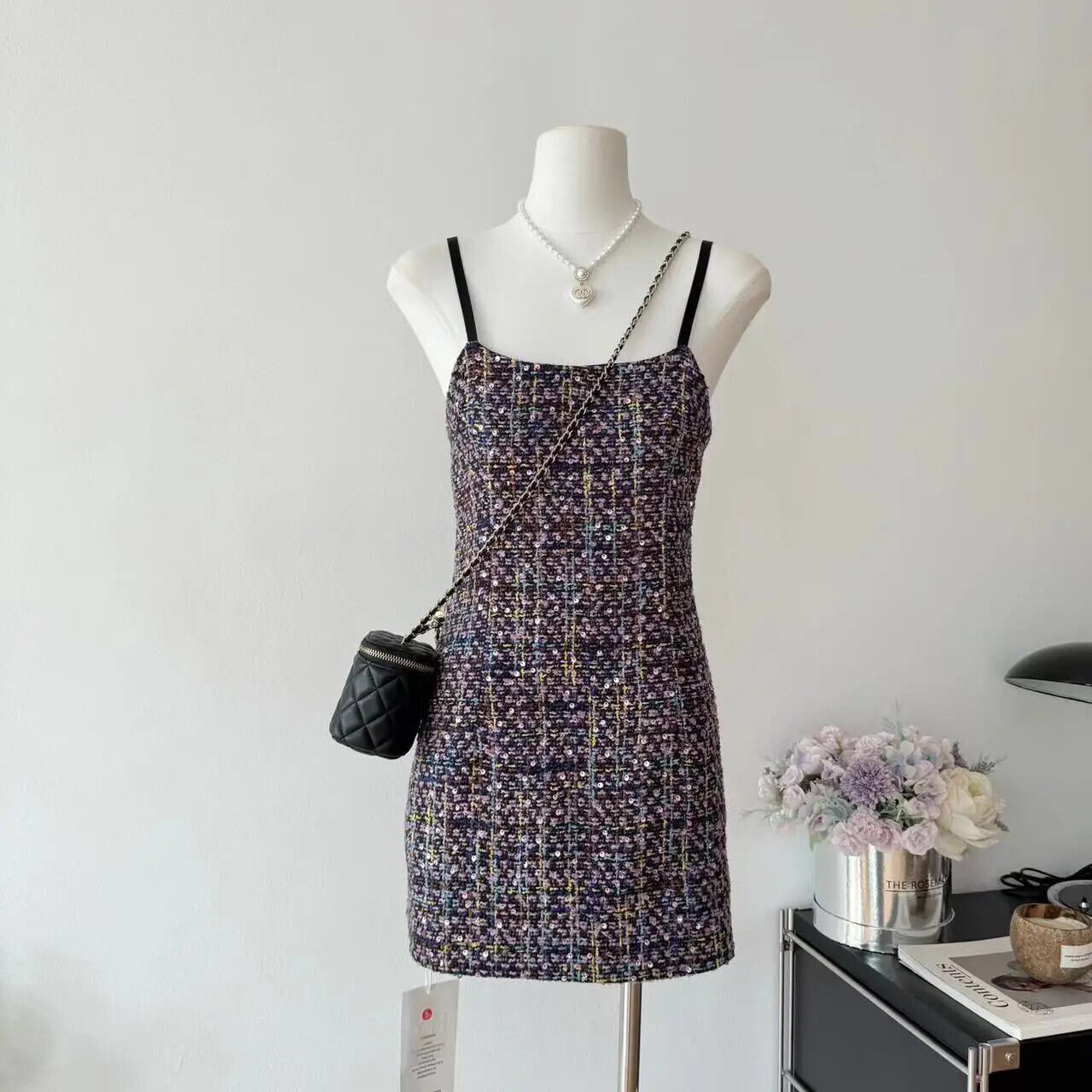サマーレディース - タイトフィット サスペンダー スパンコール ツイード ドレス 夏物