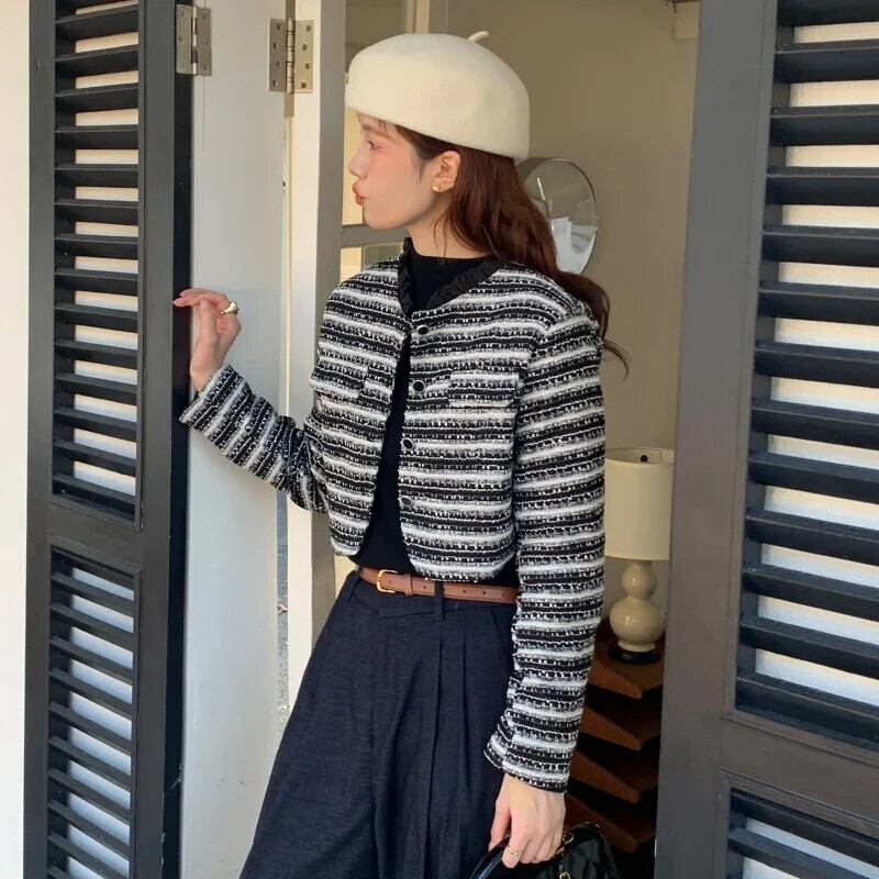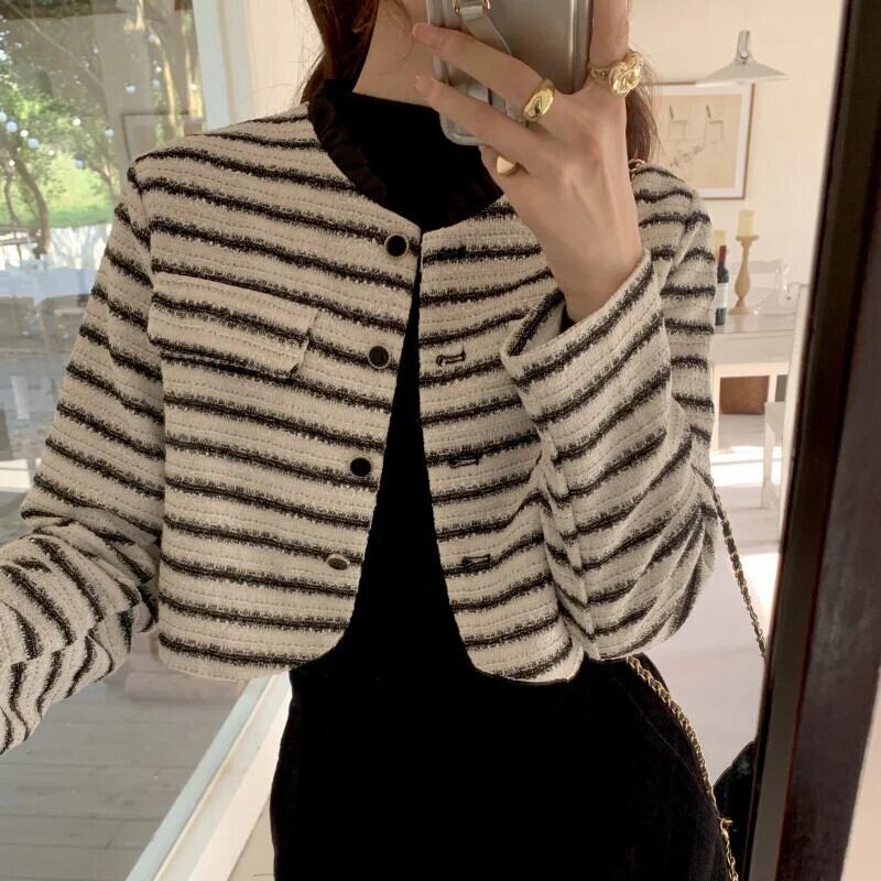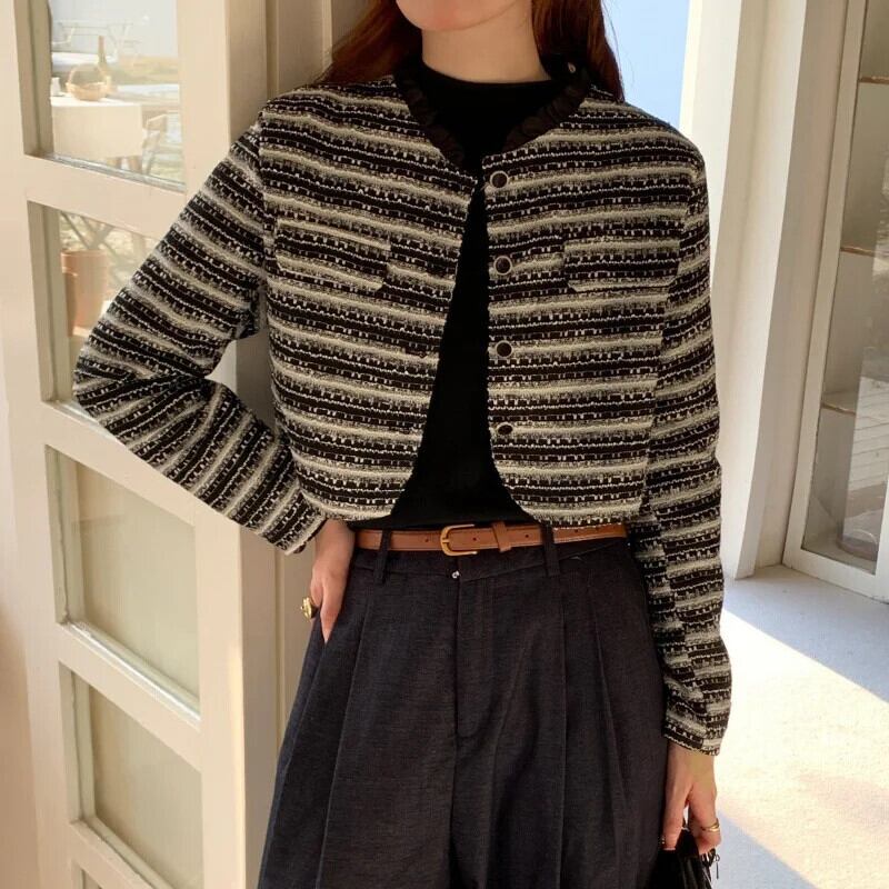 秋冬気質香りスタイルレース立ちネックルーズ長袖ストライプショートコートジャケット ロング オータム 秋物 ウィンター 冬物