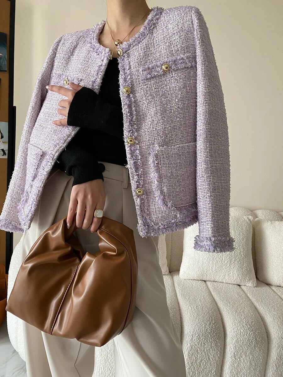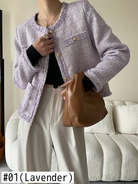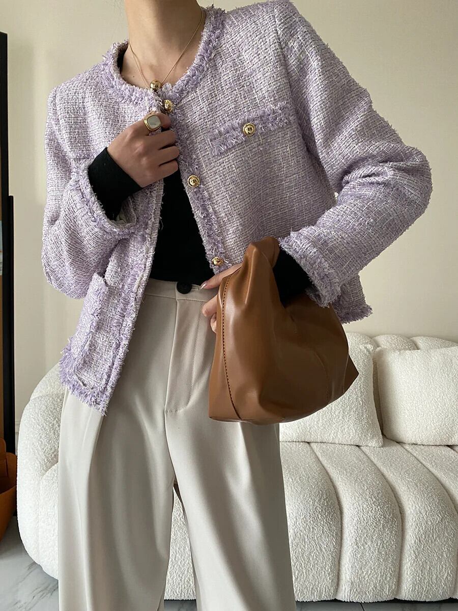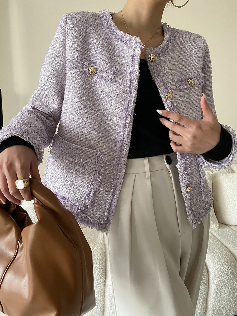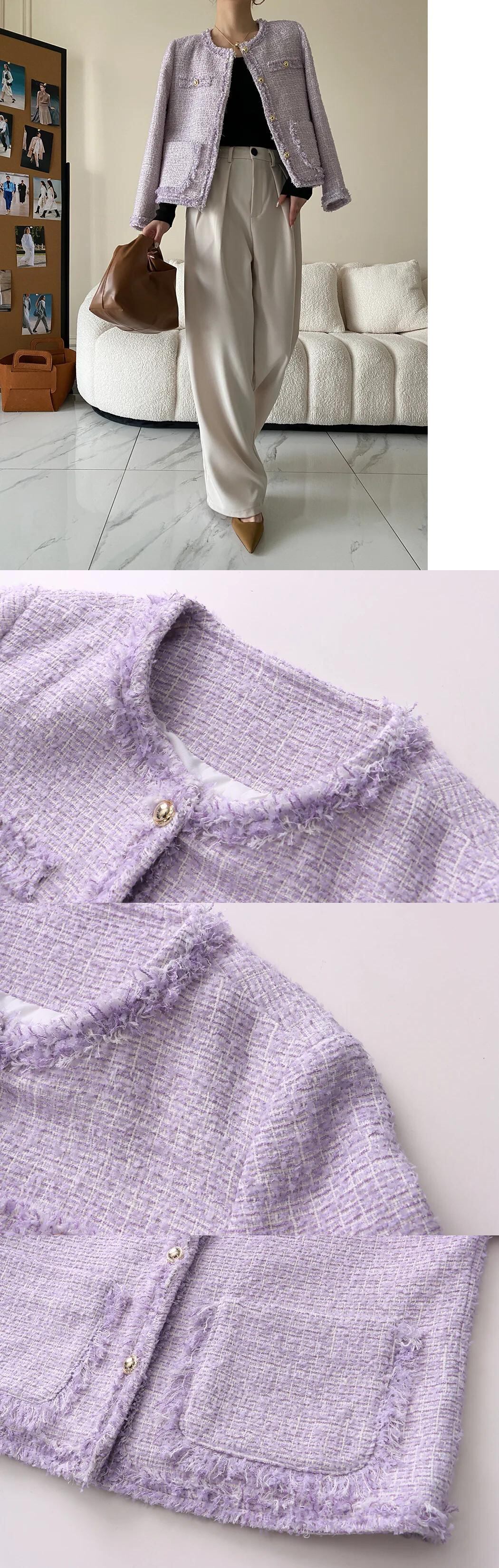 春秋レディースライトパープルテルゴールドボタンショートコートツイードジャケットChaquetas スプリング 春物 オータム 秋物