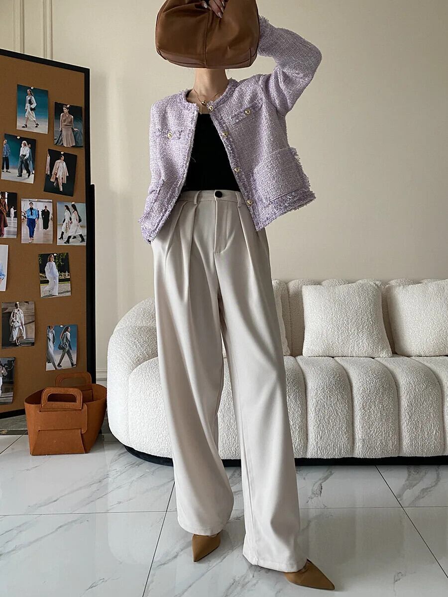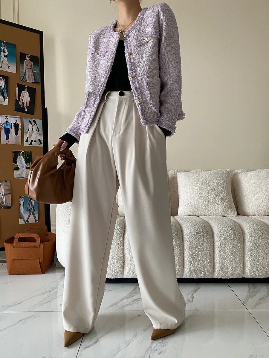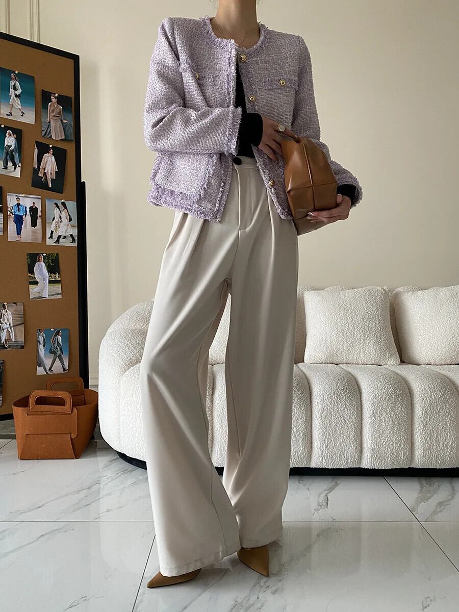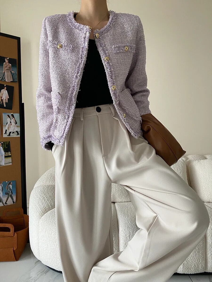 春秋レディースライトパープルテルゴールドボタンショートコートツイードジャケットChaquetas スプリング 春物 オータム 秋物